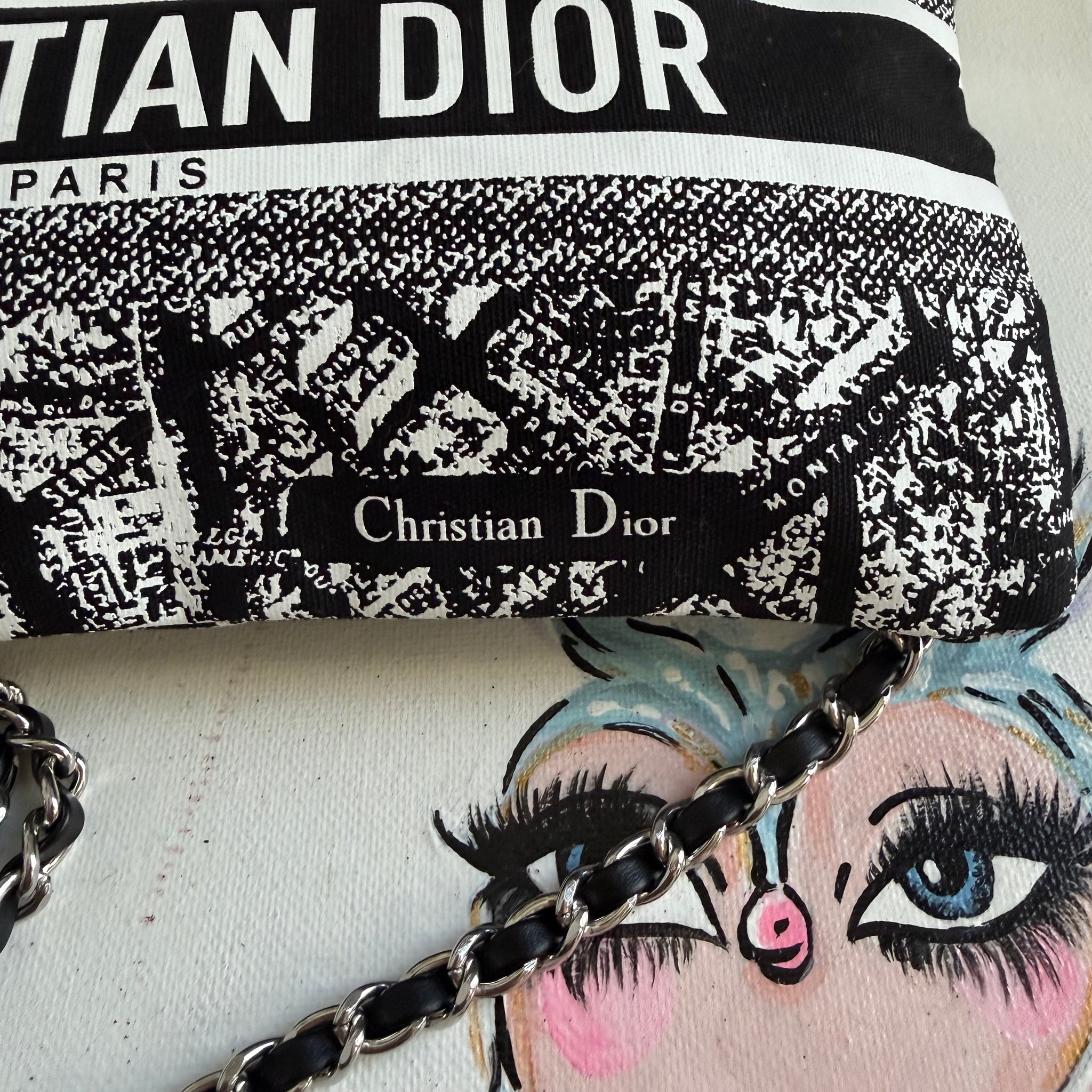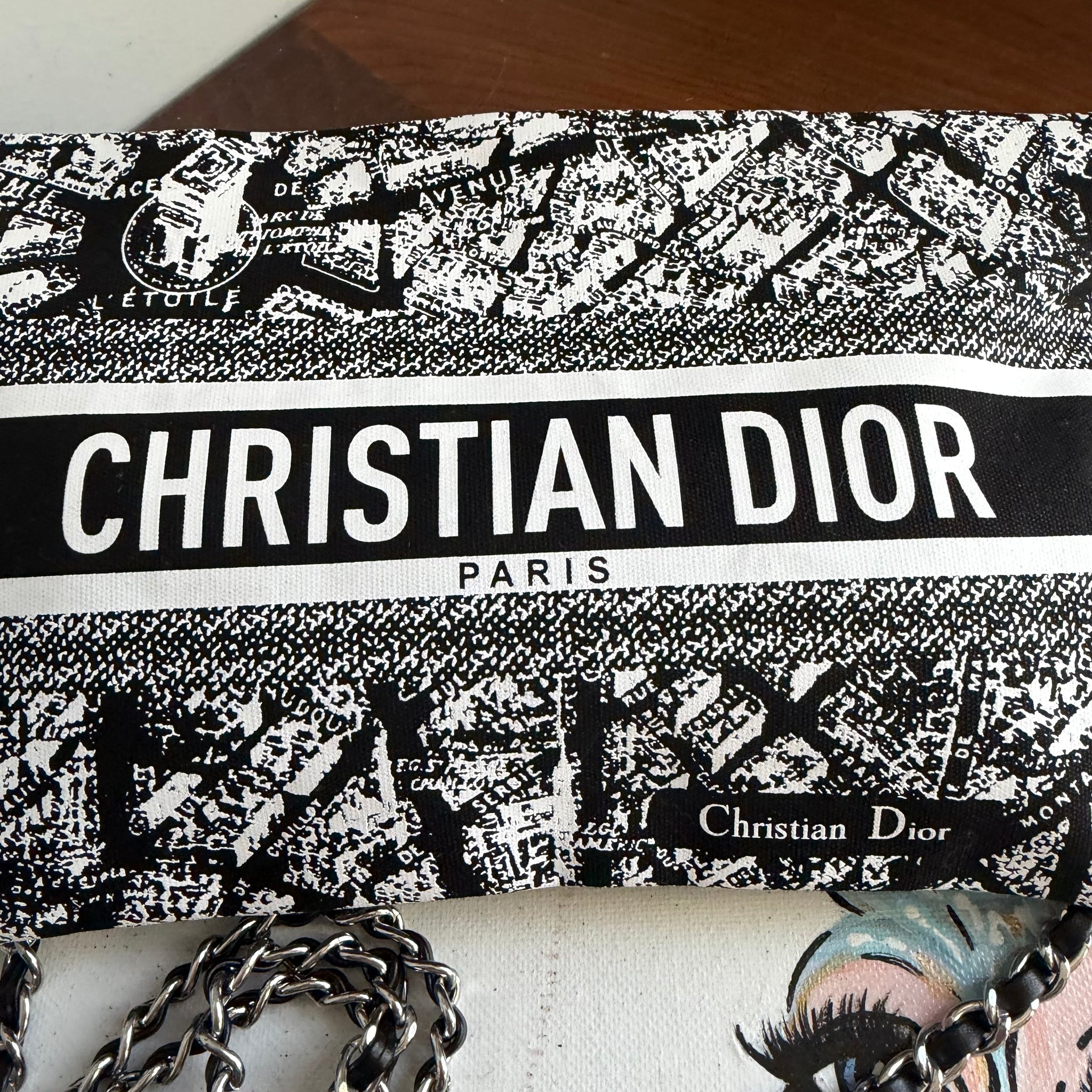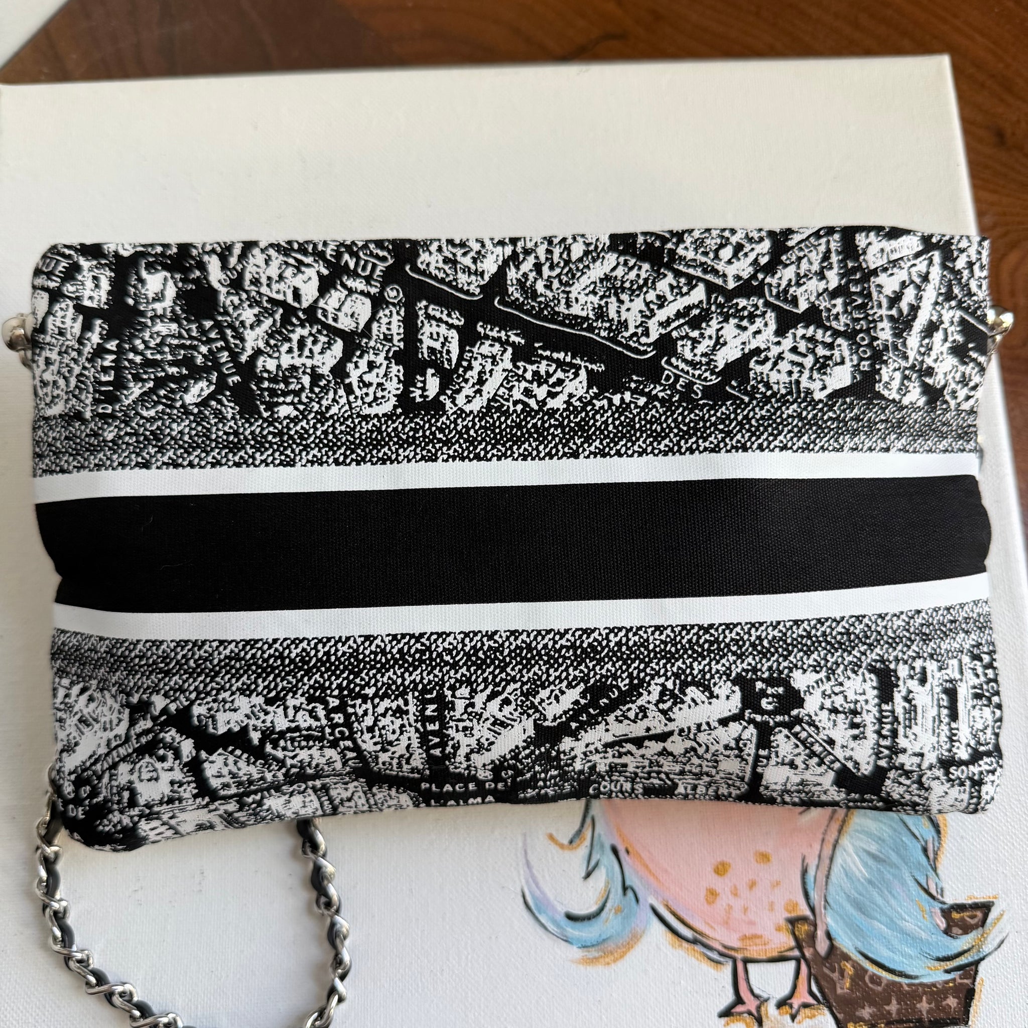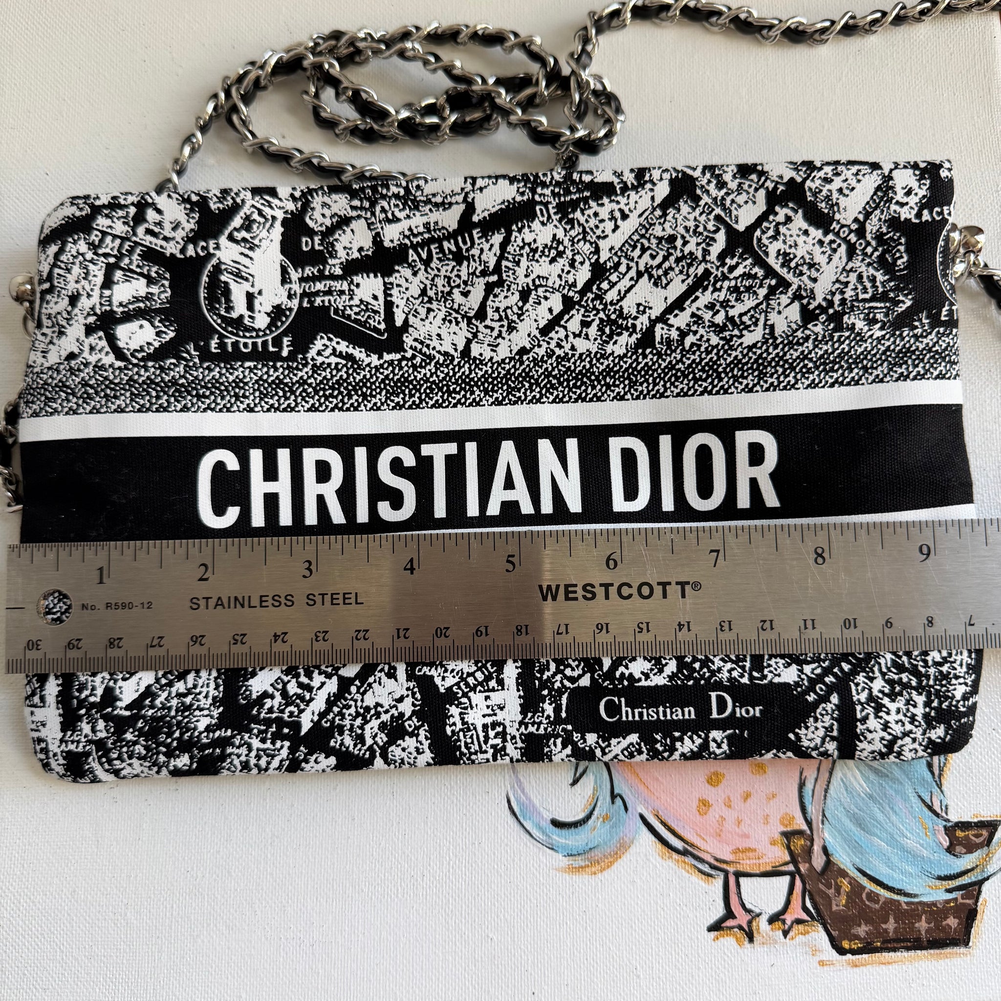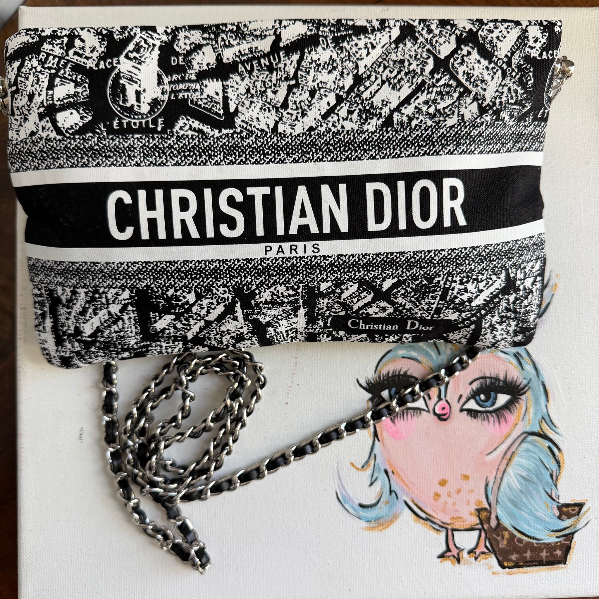 This authentic Dior Beauty bag is brand new and is an affordable solution to having your own DIOR!!! This bag is printed with the classic Paris Street Map and is so adorable and very coveted!! This bag didn't come with a strap, so I've added silver D-rings to the sides and attached a 47" silver chain/black leather crossbody chain strap.
