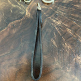 I've removed the original rivets due to damage and remade the strap with a cute heart shaped gold concho that holds the D-ring.  I've attached a beautiful blingy O-ring that can open and be clipped directly onto a bag.  It also comes with a clasp and two split rings for keys.  The clasp and the split rings can be removed if desired.  The entire length of the wristlet with the clasp is a little over 8."  The part that goes over your wrist is about 5.5" long...not too tight, not too loose!