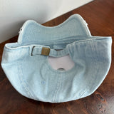 The authentic pink and gold-rimmed PRADA bag tag has been rescued and added to this light denim hat with gold colored rivets! I'm obsessed!! Completely adjustable fit!!