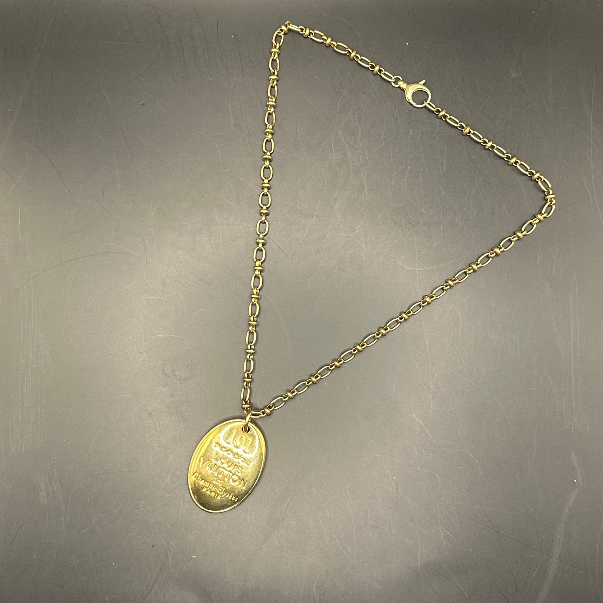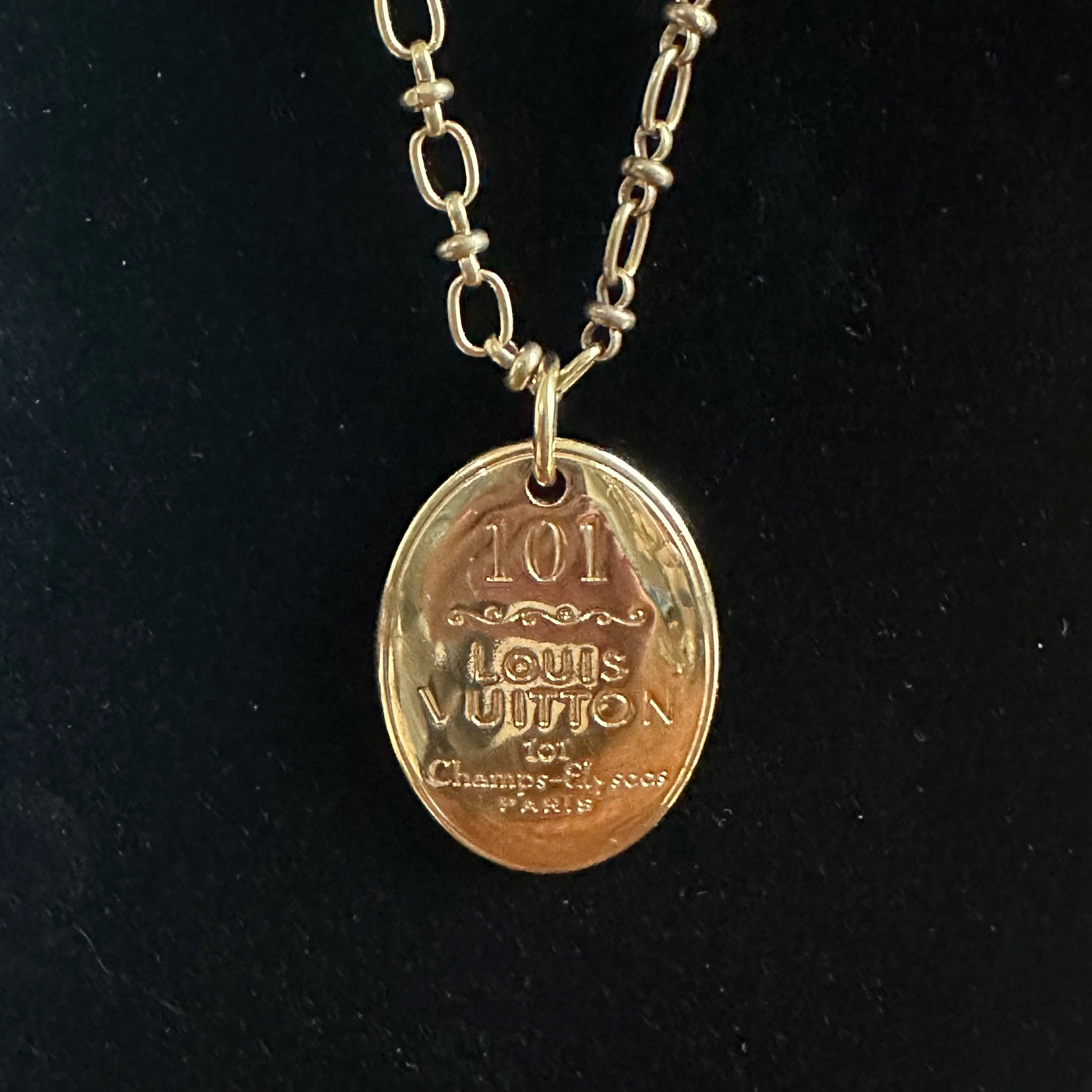 This beautiful necklace is a stunning piece that contains an authentic pendant from the Louis Vuitton Porto Cle Maison bag charm set (see last pic). The necklace is a vintage brass chain that really makes this brass pendant look amazing. The LV pendant is in really good condition, with very few scratches on it. This is a heavy, substantial piece, and is a one-of-a-kind item, don't wait on this one!!