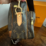 The bag is in decent shape, however, there are a couple of small tears in the canvas at the top. It's been cleaned top to bottom, and the vachetta has been conditioned. The original side straps have been replaced with new vachetta, and I've added new gold D-rings to them. The interior is in awesome shape as well, and very clean. The zippered pocket, however, is UNUSEABLE. The Vuittonite (see below) in the pocket has deteriorated so badly that it could not be repaired without affecting the integrity of the bag. The zippers have been polished and work great. I've paired this bag with a brown canvas strap that is adjustable from 30.5-50" long.