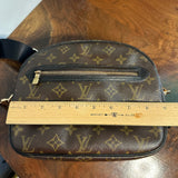 The bag's canvas is in great condition. All of the brass hardware has been polished and looks amazing!! This bag does not have the dreaded Vuittonite in the pockets, just a perfect nylon lining ... YAY! The strap holders had been torn off, so I added custom gold D-rings to the sides and attached a black canvas strap that is adjustable from 30-52". I've dyed and conditioned all of the vachetta leather black, giving this bag a much needed facelift. There is a tiny bit of cracking in the leather, but with it colored black, you don't notice it.