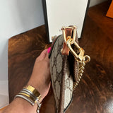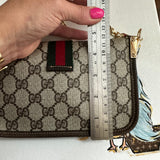 This adorable Junco is a small bag that is the perfect accessory and will go with any outfit!  This bag was part of Gucci's Sherry Line and was part of their Accessory collection.  In order to make it more useable, I've added side D-rings in order to hold the fun crossbody chain strap.  The strap is 39" long, which enables this bag to tuck up higher at your rib cage. If needed, I can add more links to make the chain 47", just add a note during checkout or contact me immediately after purchase.  Both the exterior and interior have been fully cleaned, and she looks fantastic!!! It's a smaller bag that can carry just a few important things, coming in at  W7.5 x H4.5x D1 inches.