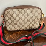 This adorable Junco is a small bag that is the perfect fall transition piece and will go with any outfit! This crossbody bag came to me with a dirty exterior, a flaky interior, and a very damaged strap. I've scrubbed the exterior grime off of the coated canvas. In the interior, I scrubbed out the flakiness, leaving a soft flannel lining. I redyed all the leather trim and conditioned it so that it shines. I also added a more "traditional" Gucci-like canvas strap that is adjustable from 30.5 - 50."