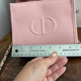 This authentic Dior Beauty bag is brand new and is an affordable solution to having your own DIOR!!! This bag is a pale pink with an embossed CD logo. The material is a recycled polyester that feels like canvas. There is a single snap at the top. This bag has a unique shape and is 6.5" wide at the bottom and 6" wide at the top. It's 4.5" high and 2" deep at the bottom.