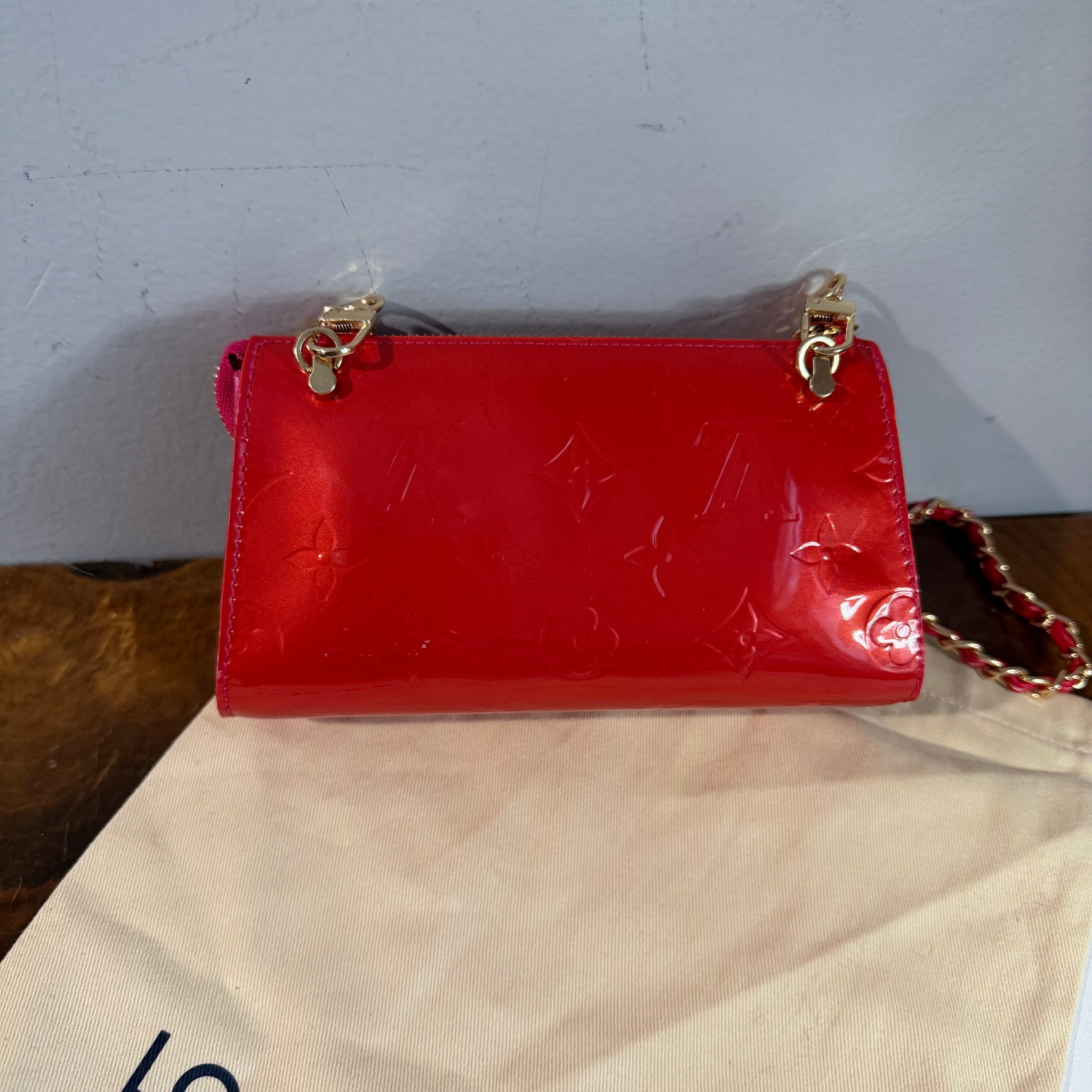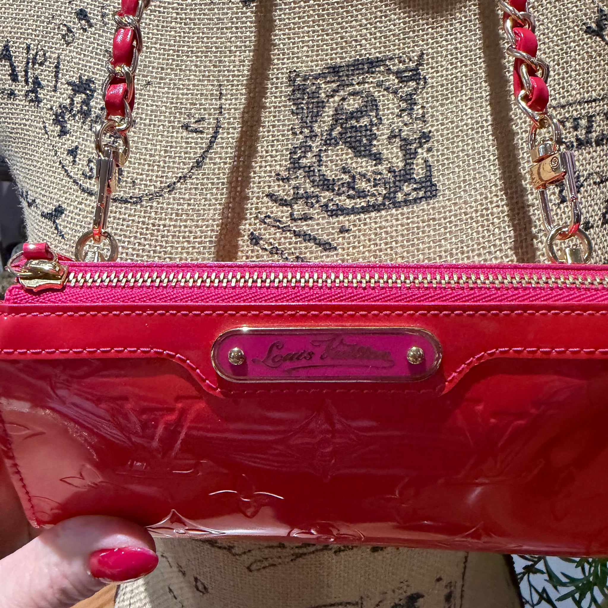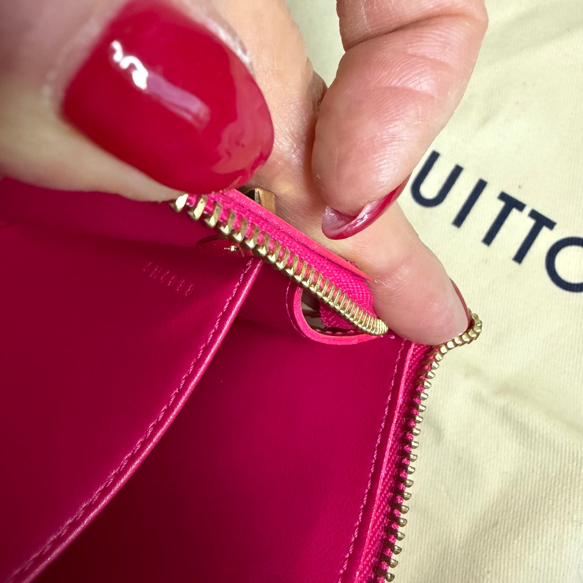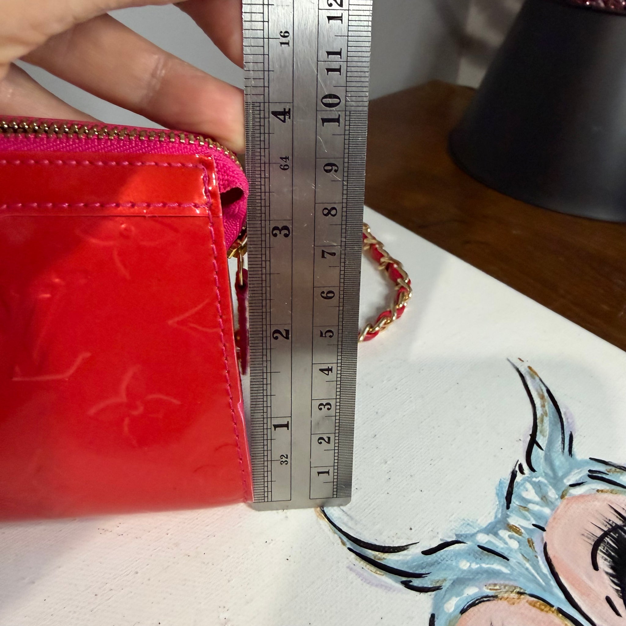 This little Junco has been created from an authentic Louis Vuitton Vernis Trousse Cosmetic Pouch in Red Pop. The red pop Vernis is in fantastic shape and has a beautiful bright pink "Louis Vuitton" tag up front, as well as the zipper and the interior.