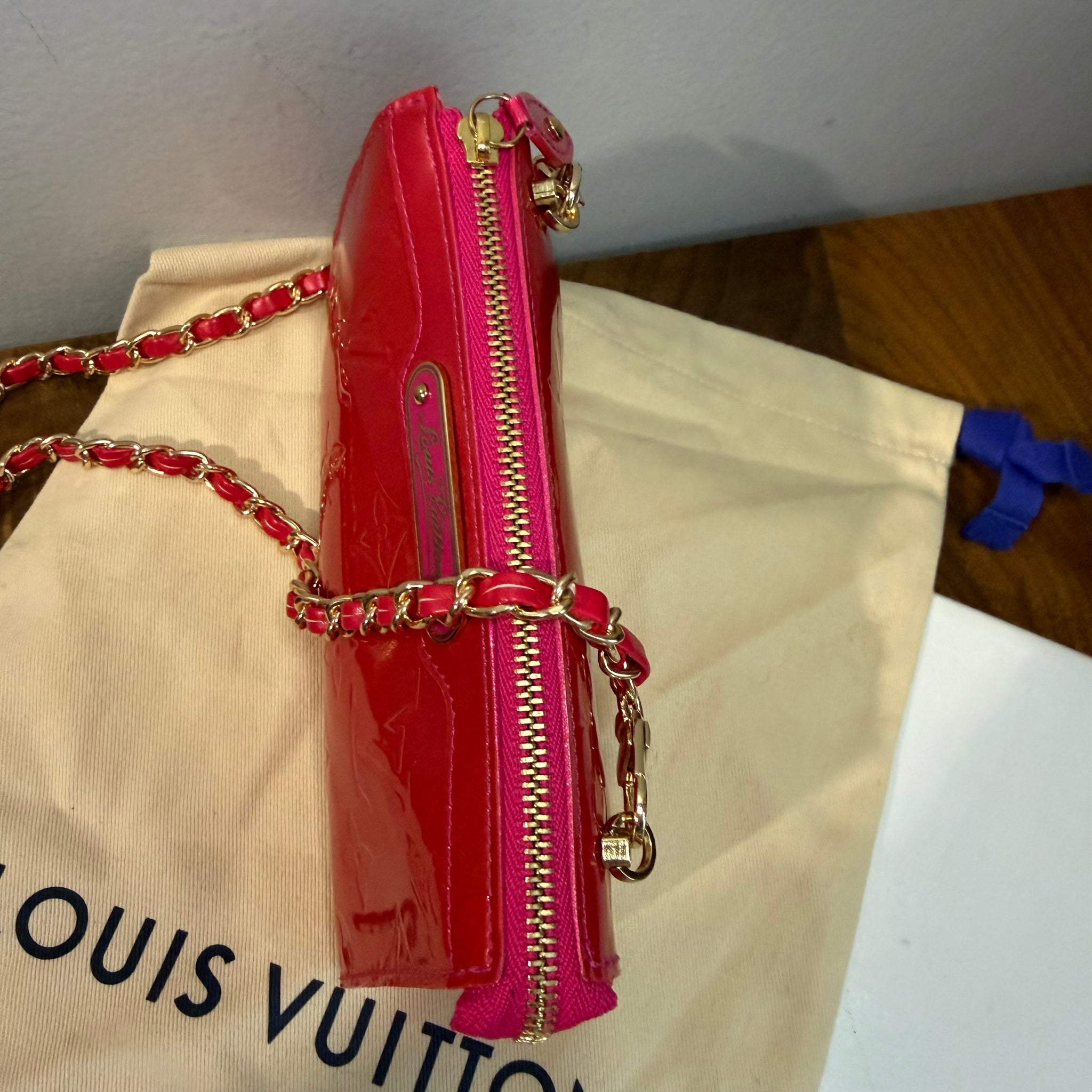 This bag is in perfect shape. Both the exterior and interior are very clean. The LV stamp on the internal pocket is clean and legible. The zipper looks great, has been polished and is fully functional. I've added tiny brass D-rings to the back of the bag and have attached a red leather/gold chain strap that is 25" long/ perfect for tucking under the arm or carrying over your wrist. (I do have some similar longer straps if needed, send a note during checkout). The date code on this bag is SN4088, which indicates it was produced in France in week 48 of 2008.