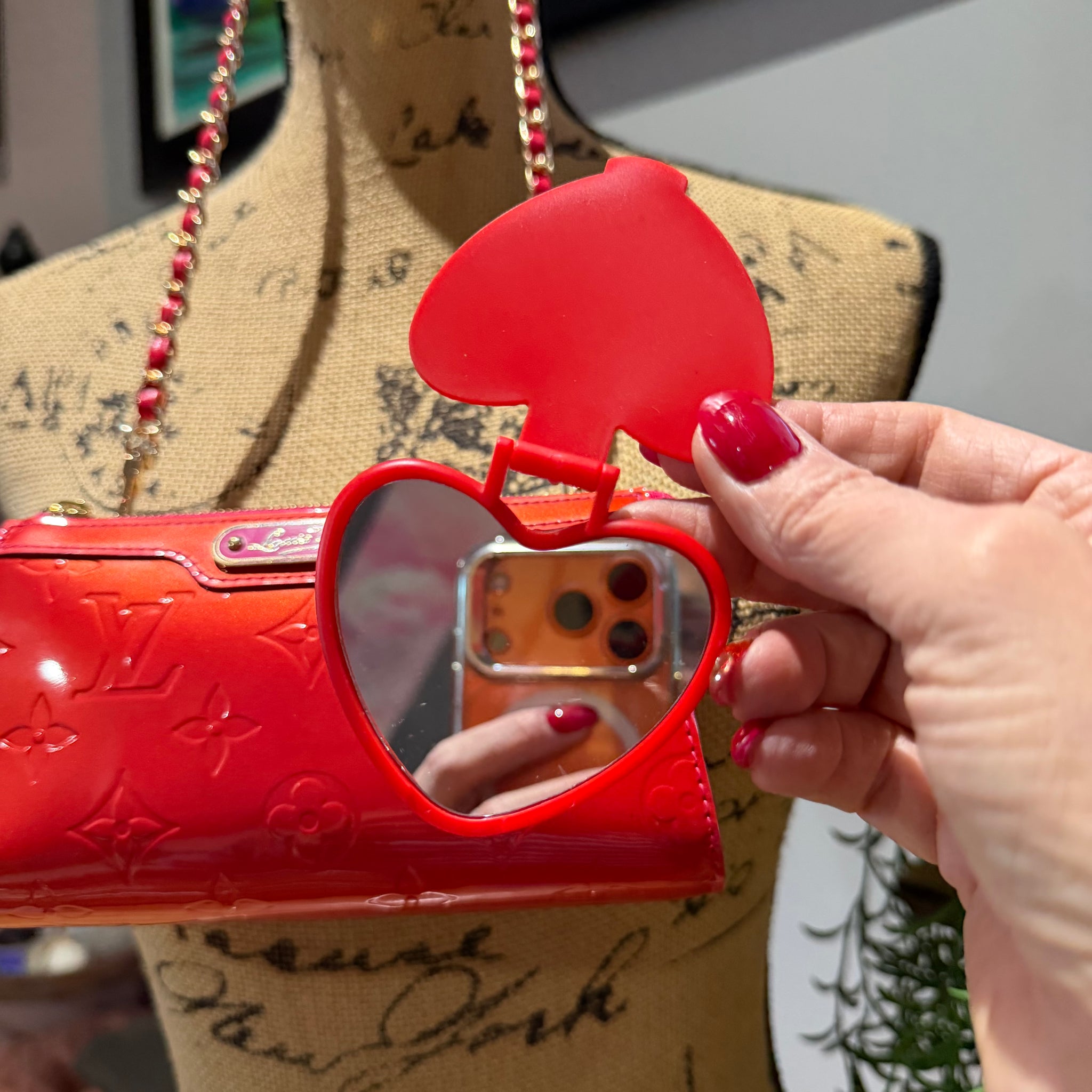 This little Junco measures L 6.75 x W 3.5 x D 2 inches and is sure to be your next favorite tiny bag! It will JUST fit an iPhone 17 Pro without a case. It should fit a small card holder, keys, lipstick, etc.! It will include a cute red heart-shaped mirror.