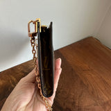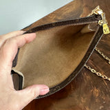 This bag’s canvas is in great shape. The inside Vuittonite was very sticky so I’ve scrubbed it out leaving a soft interior. I’ve added small D-rings to the back so that you can use the 26” chain and tuck this bag under your arm. If you’d prefer a longer chain to use this as a crossbody bag, please let me know and I can swap it out.