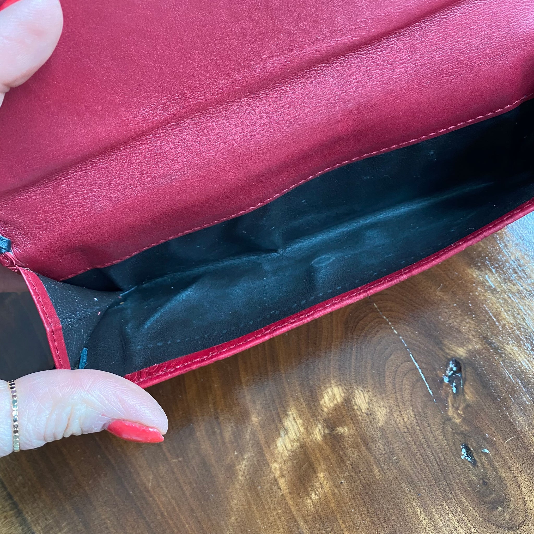 This wallet opens from both sides. It has an area for credit cards, a snap area for change, and two other long pockets. The entire wallet was thoroughly cleaned and the leather was conditioned. The outside edges were hand stitched with black leather lace, making this unique and one-of-a-kind. It has some wear, including slight tarnishing on the GG heart out front, but still has TONS of life left in it. If you'd like, I can add D-rings to the top and add a crossbody chain for $25 (similar to this). Contact me after purchase and I can add it to your order!!