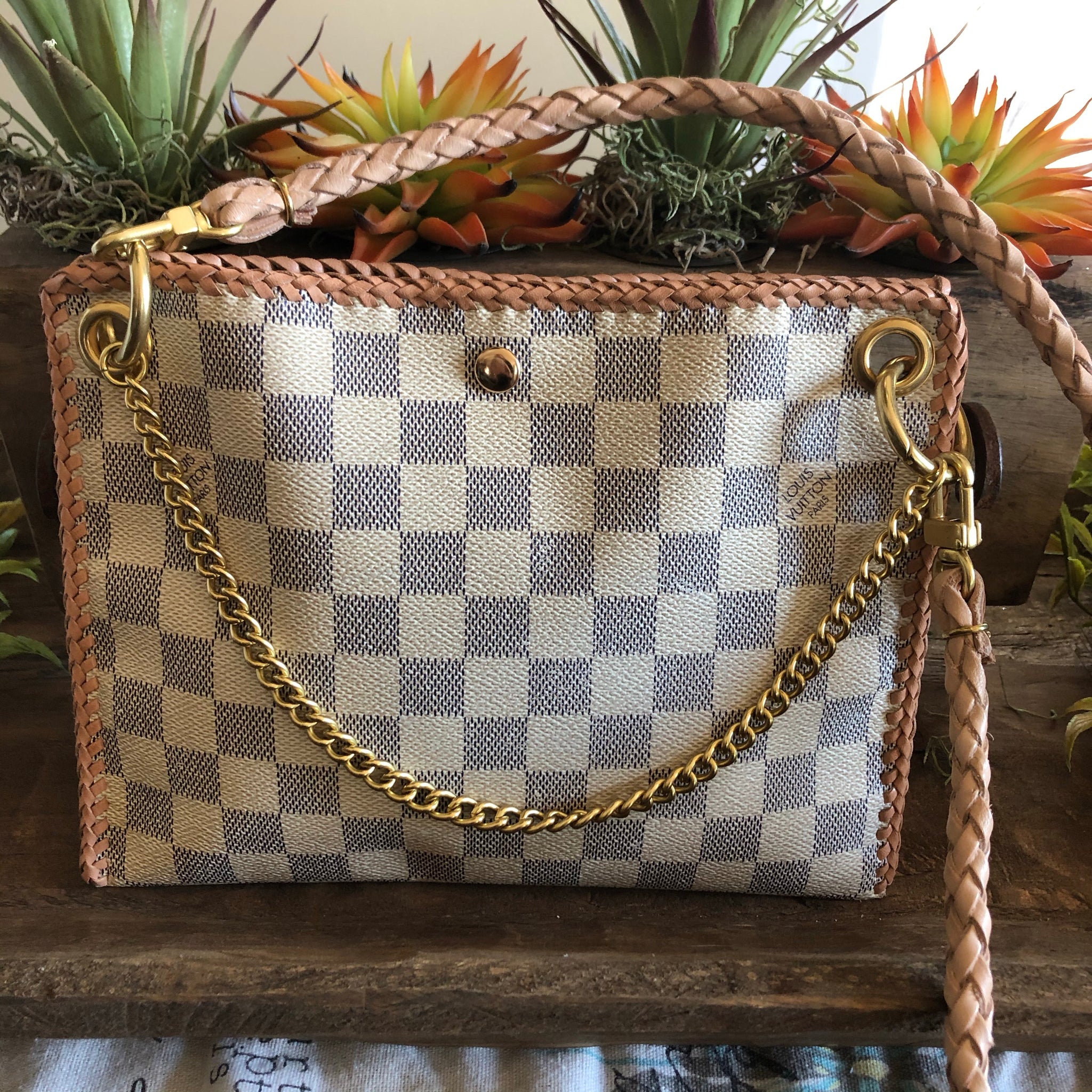 This small crossbody bag has STYLE! It was created from an authentic Louis Vuitton Damier Azur Speedy bag, and was fashioned into this fun crossbody! It's got enough room for just the right amount of things, coming in at 9" wide by 7" tall.