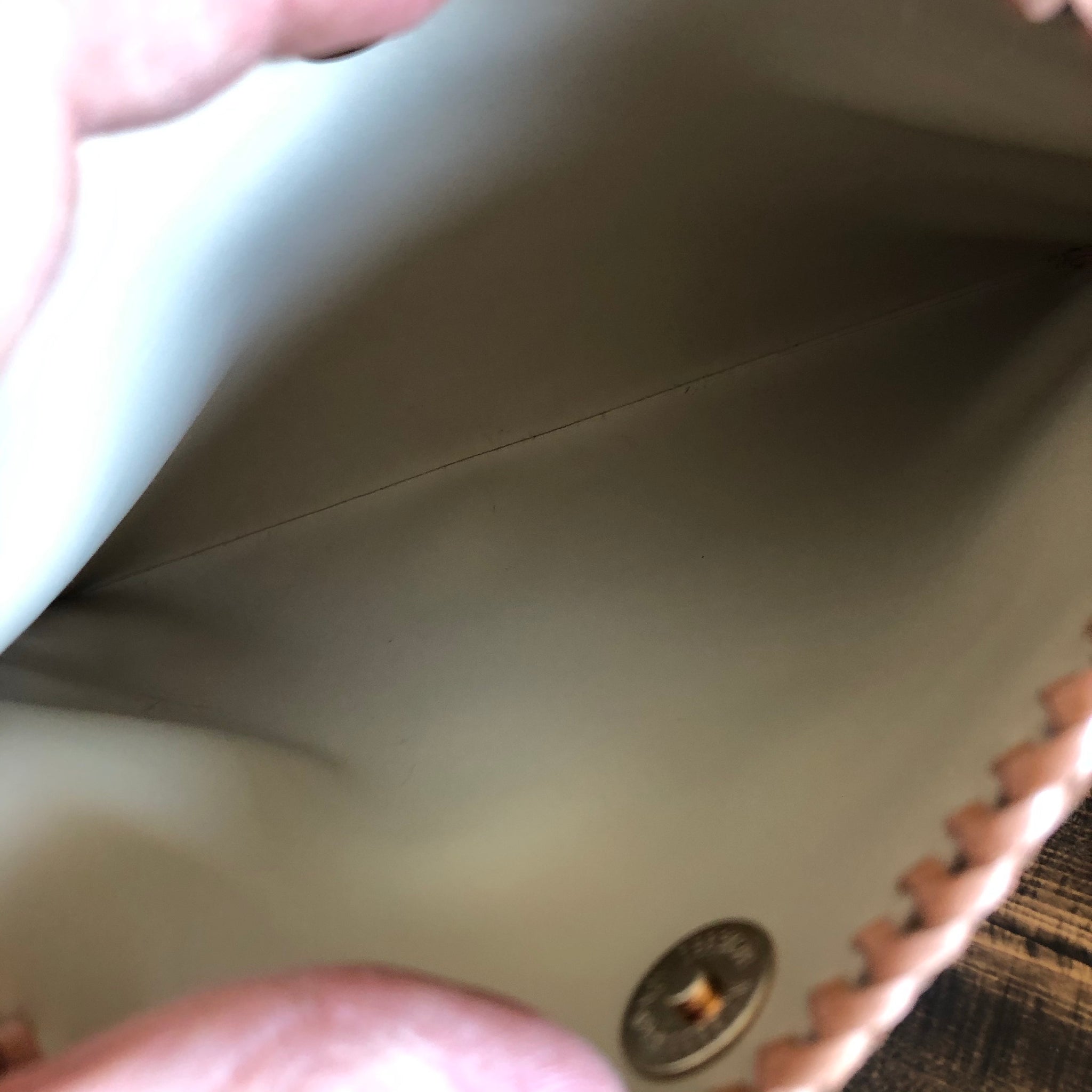 The entire bag is lined with a light cream vegan leather which makes the canvas more substantial. There is just one compartment inside. The outside edges are a natural colored leather lace which have been stitched by hand. There is a gold button magnetic snap at the top that keeps all of your items inside. The braided 6-strand cream leather strap is slightly shorter, coming in at 41", perfect for wearing on your shoulder (or even crossbody if you're short!). It has a flat section that sits comfortably on your shoulder, and then moves into a round section towards the clasp. There is a short brass chain that gives this bag a fun flair, but it can also be used a a chic shorty strap if you remove the longer one. All of the hardware on this bag is brass.