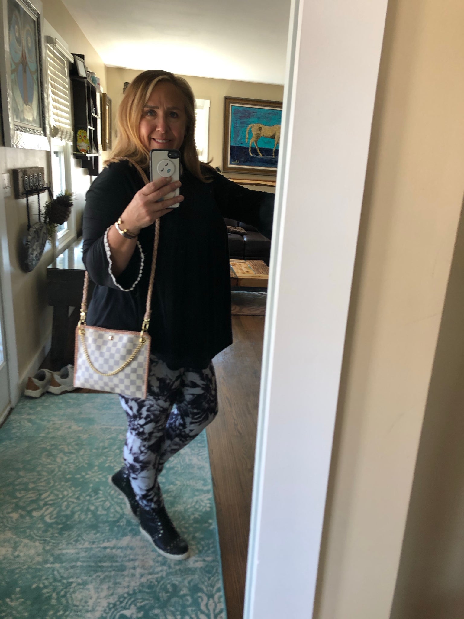 Please note: The cream leather used in the handle is a little "squeaky" so I've included a 47" gold plated crossbody strap to interchange with. The noise doesn't bother me, but wanted y'all to be aware!!