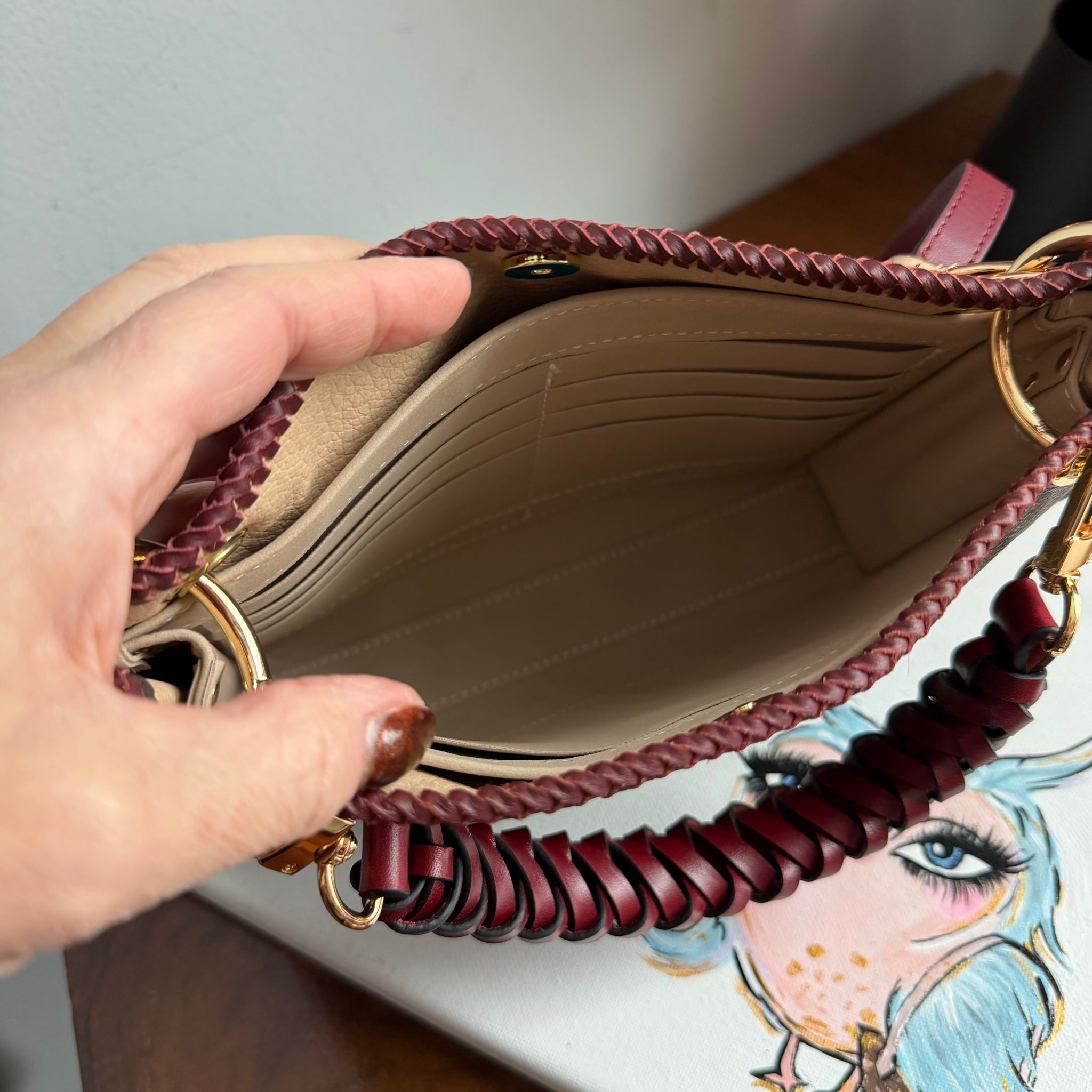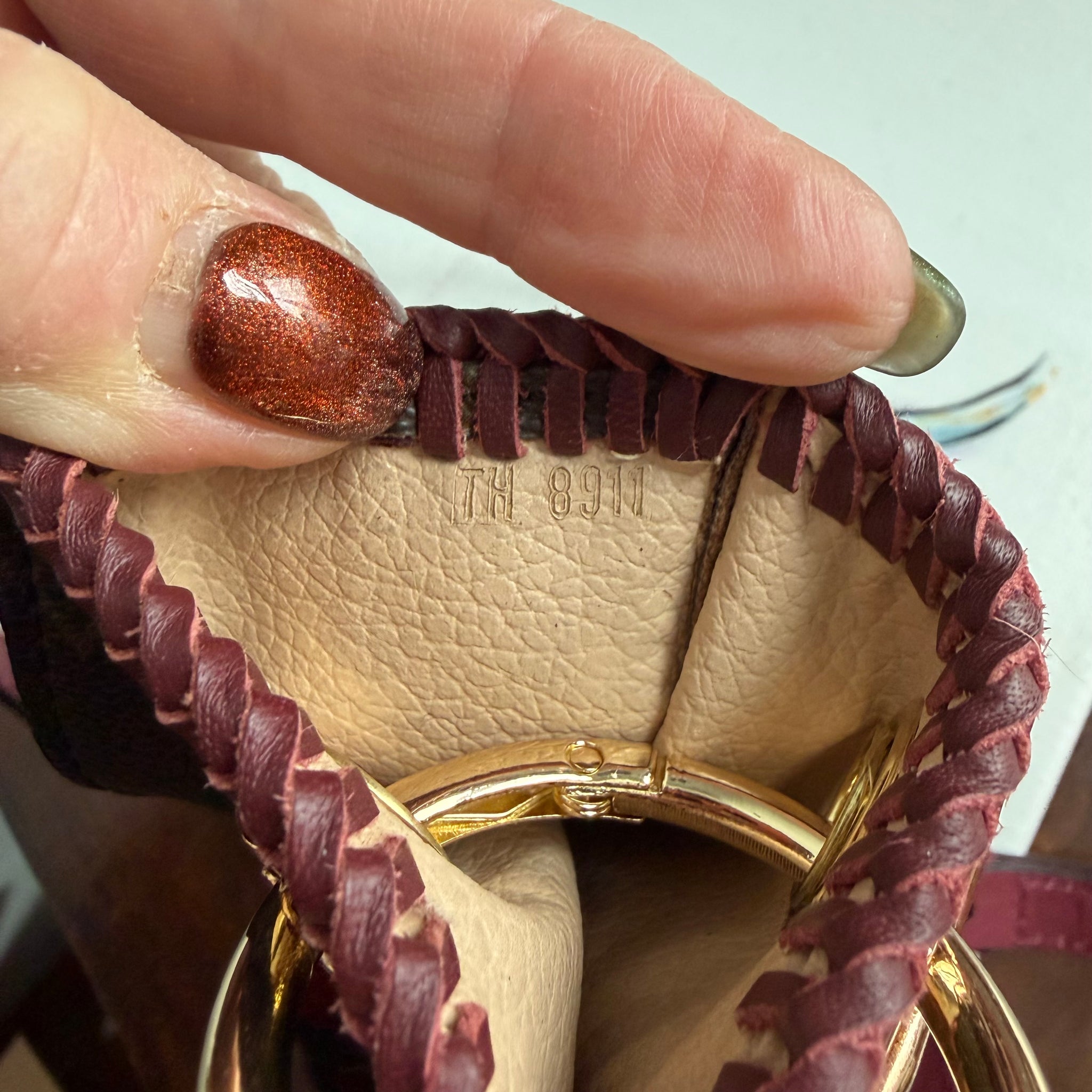 Brass eyelets were added to the corners so that the brass rings could easily go through them. There are two straps included with this bag!! The longer adjustable leather strap is perfect to wear crossbody or as a shoulder bag (39-48"). Or, remove it and carry the bag with the smaller braided burgundy colored leather strap (12"). Both straps are completely removable so that if you have one you love to use, you can use that too!