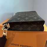 This bag's monogram canvas is in great shape, with just slight fading!!! The zipper is in good working condition, but the tab on the end was missing, so I cut the zipper down. The inside of this bag is clean bare canvas. I've added a fabulous organizer inside to keep the bag's shape, and to keep all of your goodies in the right spot. It has card holders and pockets! I've recoated the ends of the bag with edge koting so that it looks like new, and used brown leather lace to stitch the top by hand. She certainly has a unique flair now!! I've added gold D-Rings to the sides to hold the LV-like brown canvas strap that is adjustable from 30-52 inches and is about 1.5 inches wide. Perfect for wearing crossbody.