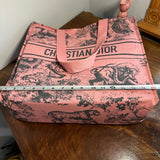 Who wants a new Dior tote without the hefty price tag?? This is a Dior "VIP gift with purchase" piece that I obtained that is a canvas material with a pink background with dark gray printing.