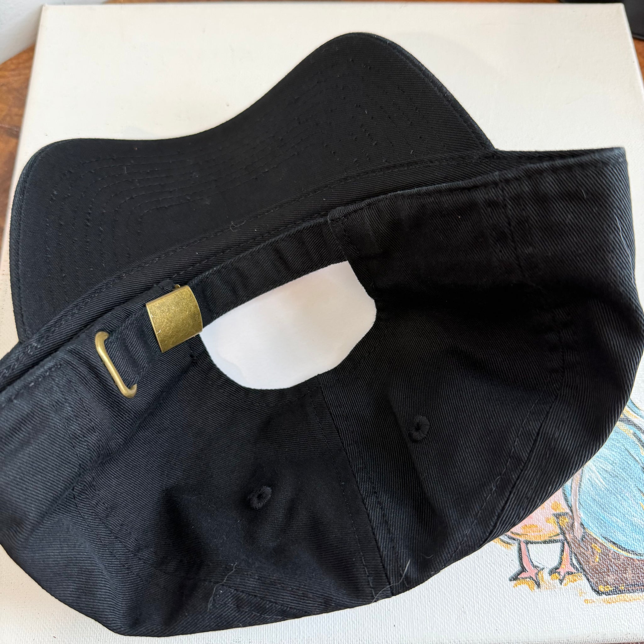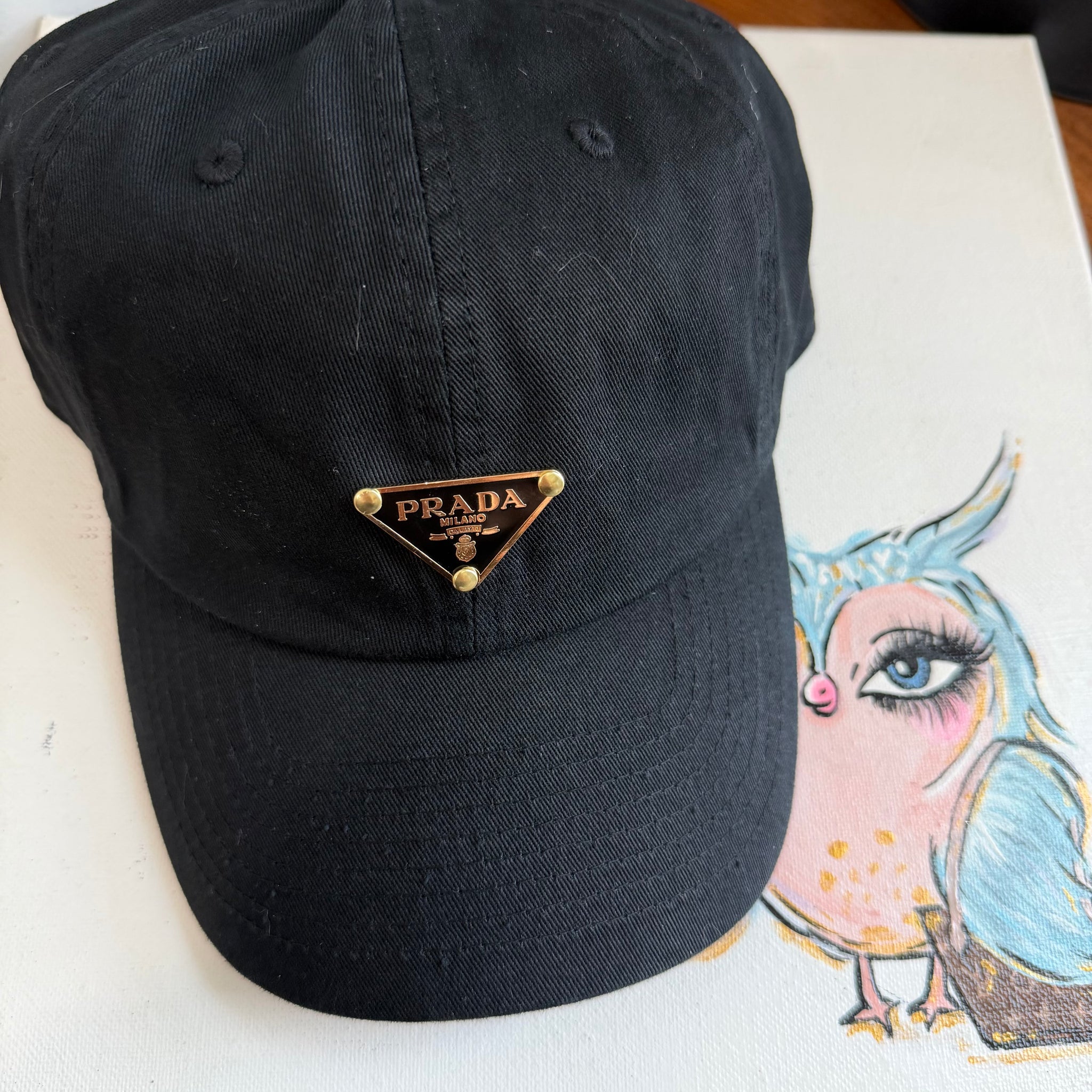 The authentic black and gold-rimmed PRADA bag tag has been rescued and added to this black hat with gold colored rivets! I'm obsessed!! Completely adjustable fit!!