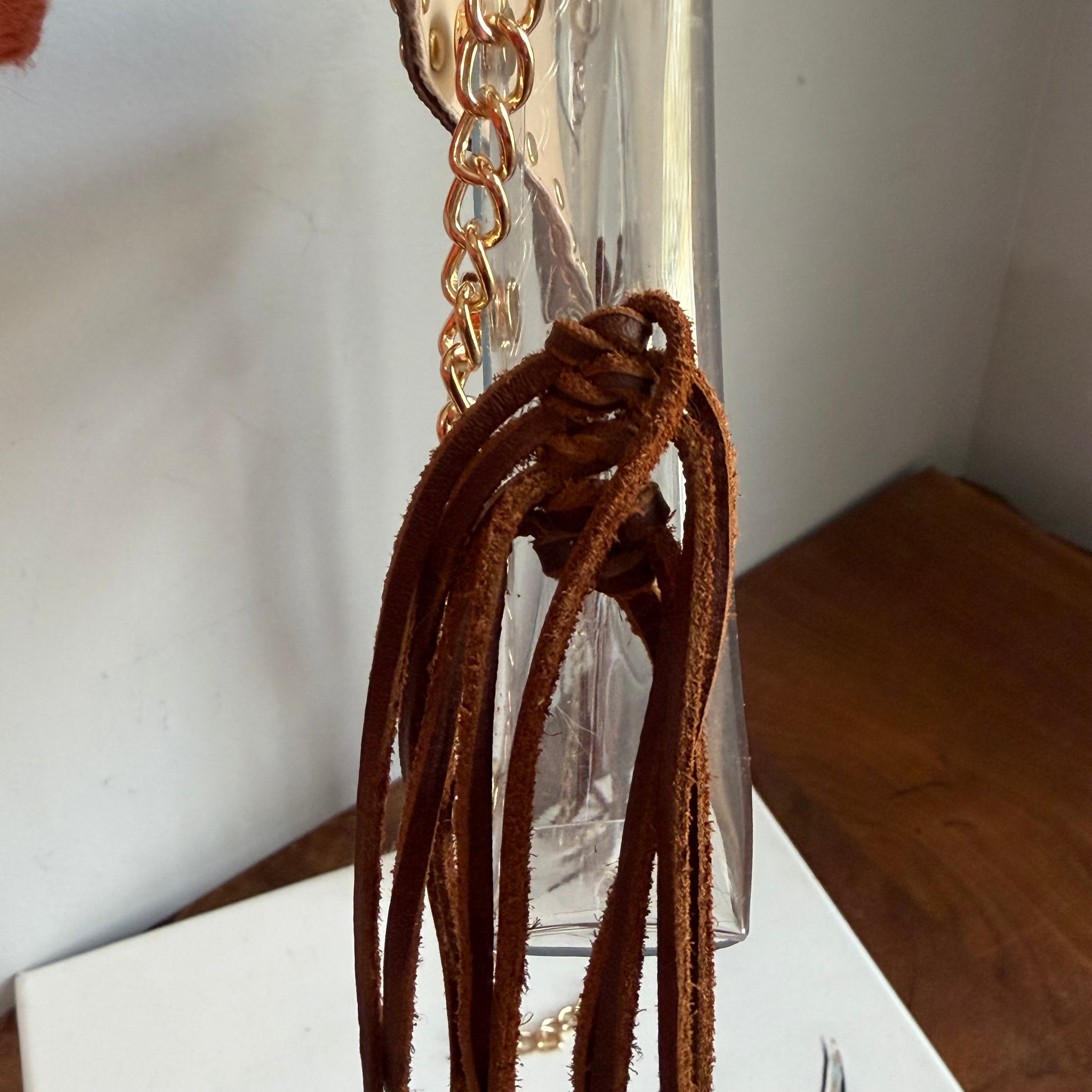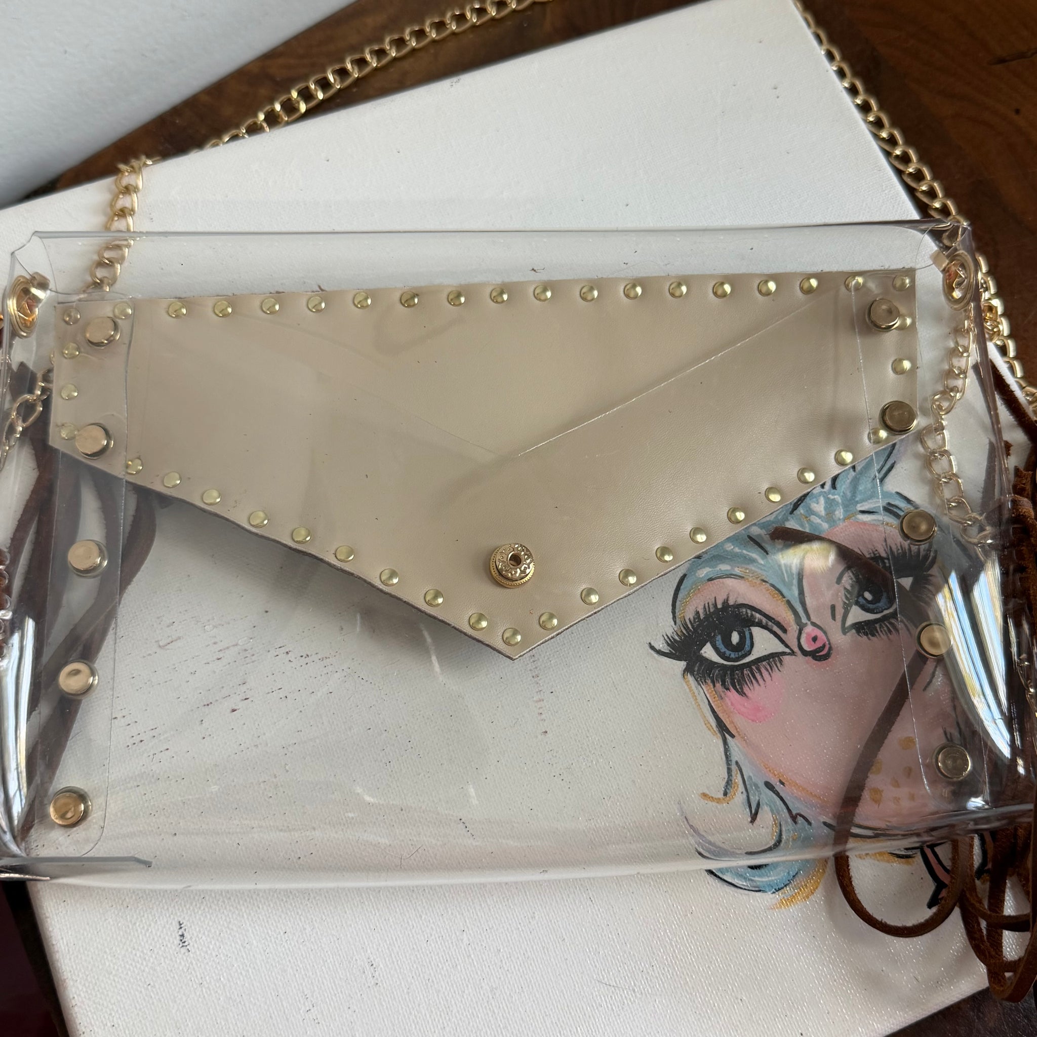 This adorable clear crossbody bag is perfect for trips to the stadium!! This bag is 9.5 x 6 inches and is about 1.5 inches thick. It's the perfect size for your wallet, phone and your necessities!! The gold chain strap is 49" long, making it the perfect little crossbody length!! If you need this shortened, please just add a note during checkout. The strap my also be removed if you wanted to add your own!!