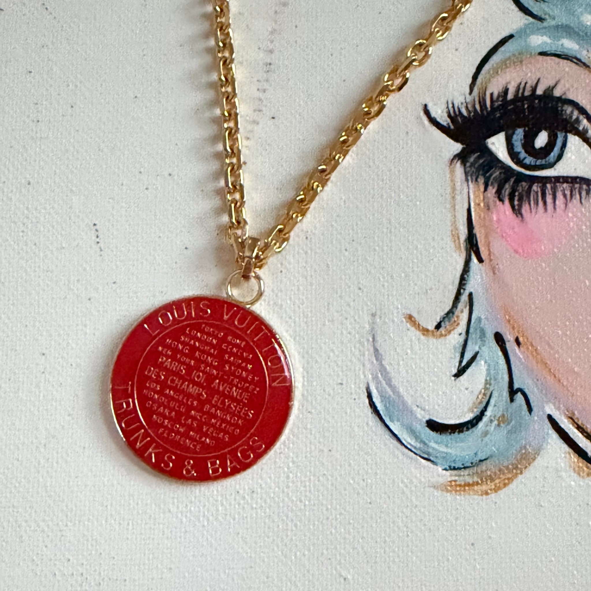 This beautiful authentic Louis Vuitton pendant was part of an authentic Louis Vuitton bag charm set that was repurposed into this fun necklace (see last picture). The red circle pendant is large and is about 1 3/8" wide. I only have a couple of these!!
