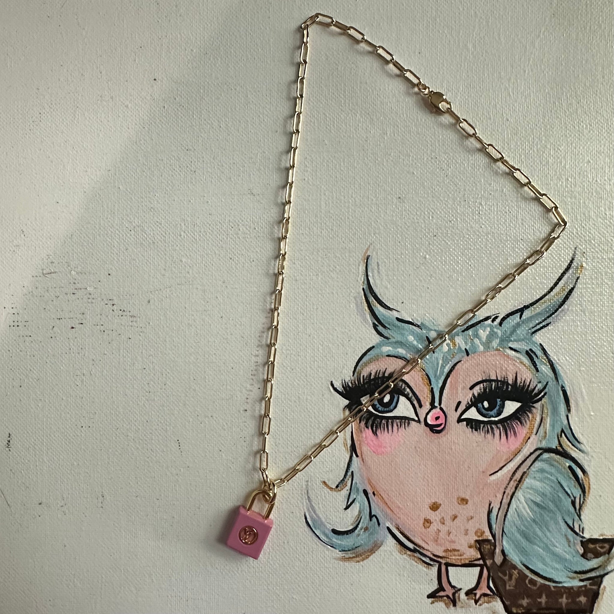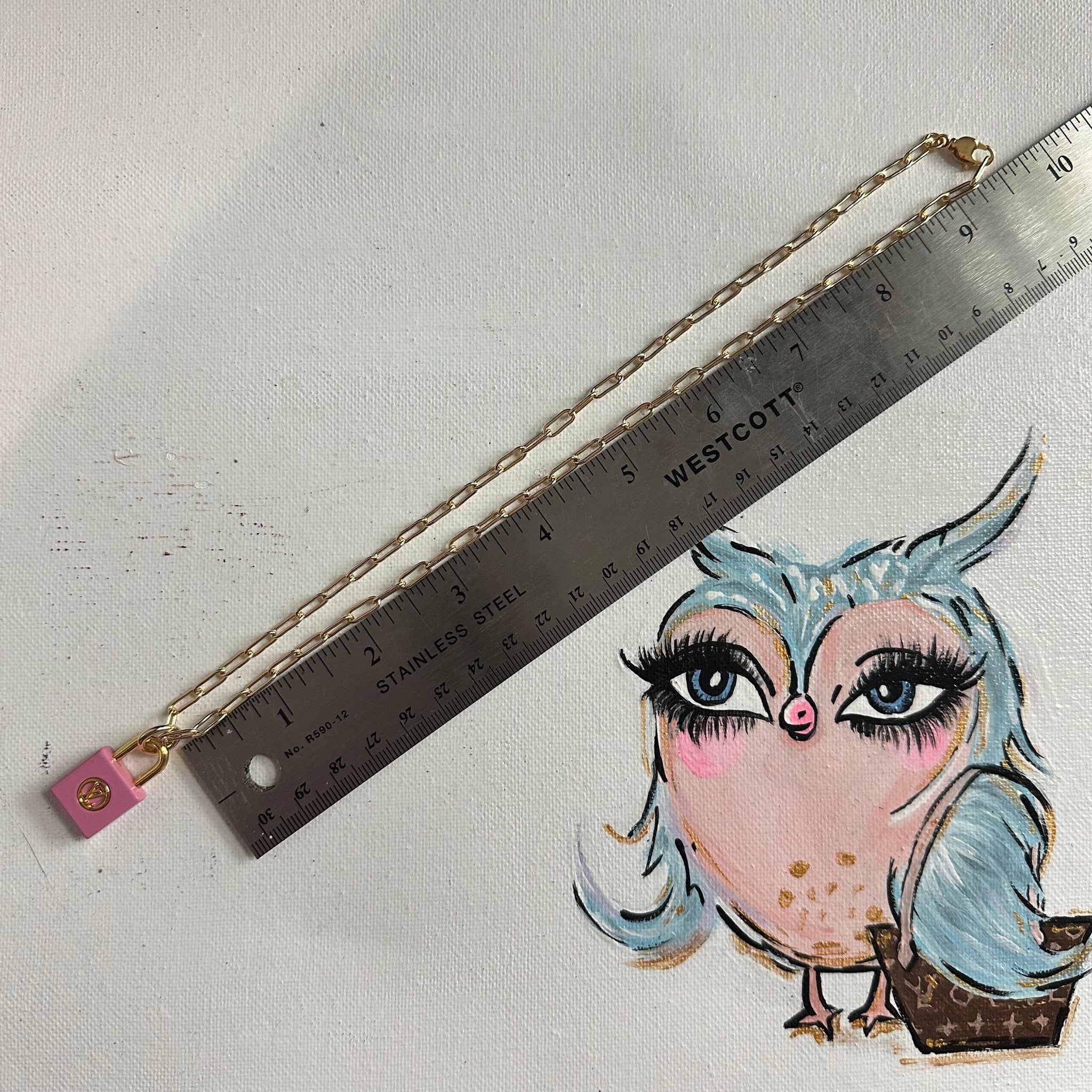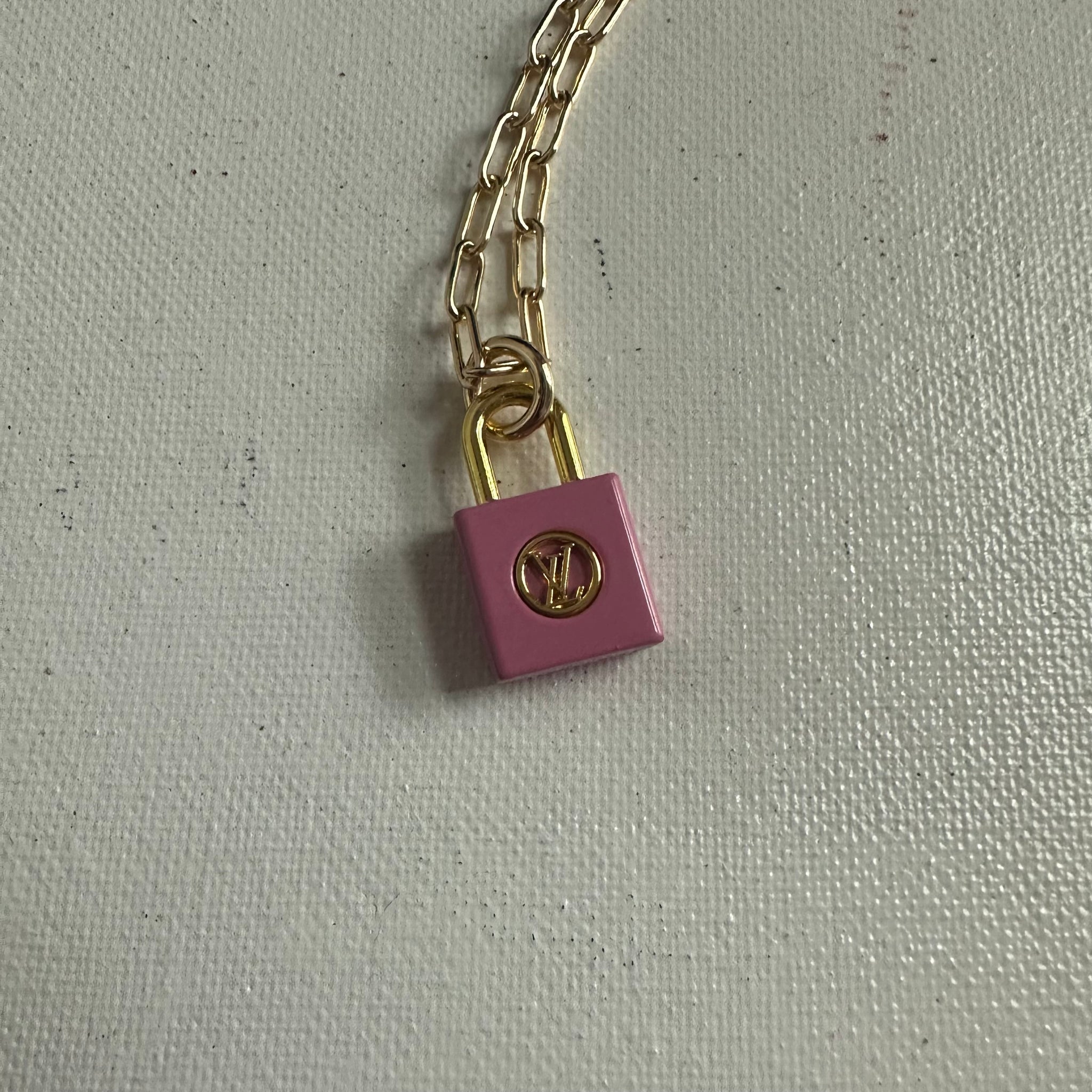 This authentic vintage Louis Vuitton charm was taken from a bag charm set to make this beautiful necklace. This pink lock charm is adorable and is the same front and back with “Louis Vuitton” stamped on the bottom. I've added the pendant to a gold-filled paperclip chain that is 19". The chain can be shortened if desired, just add a note during checkout.