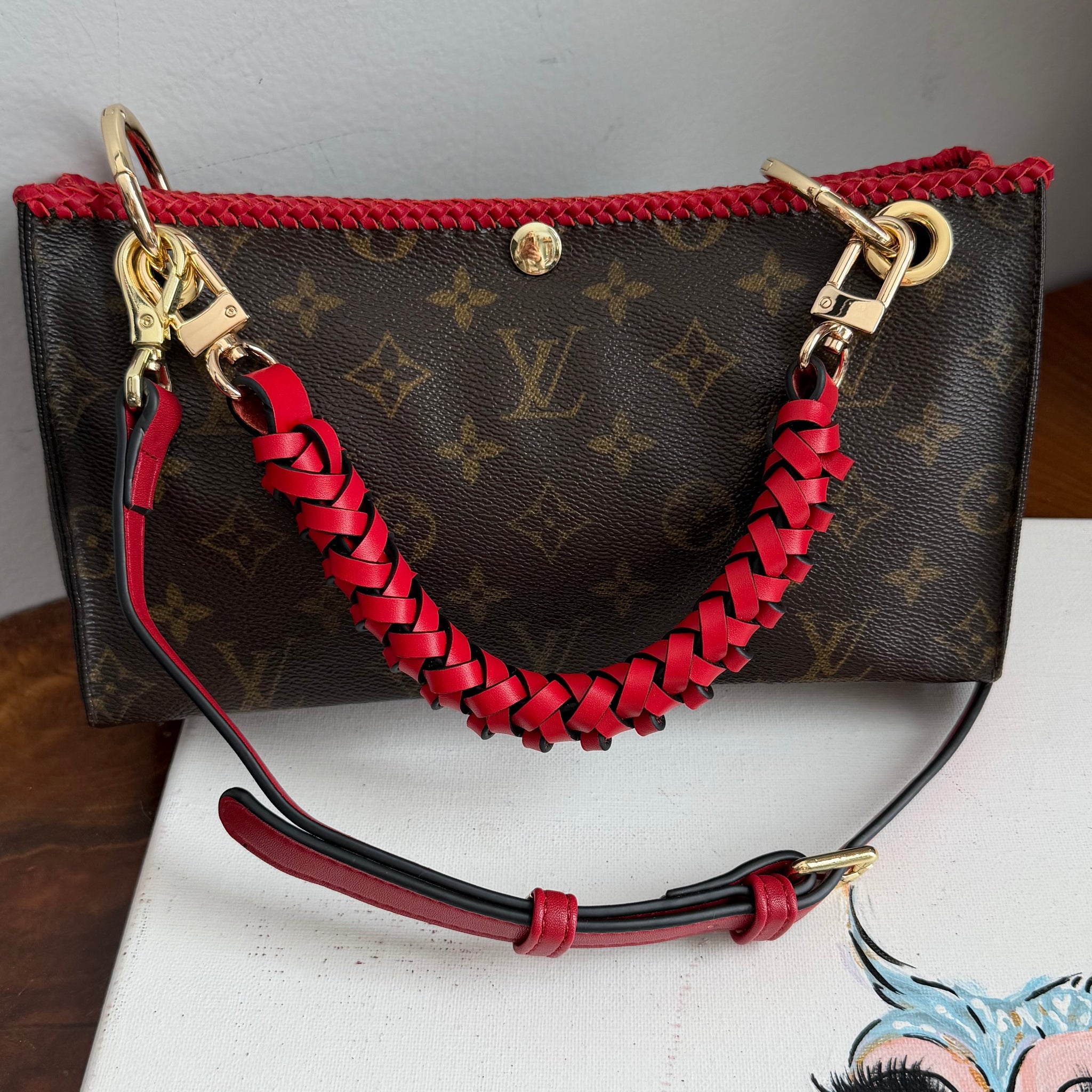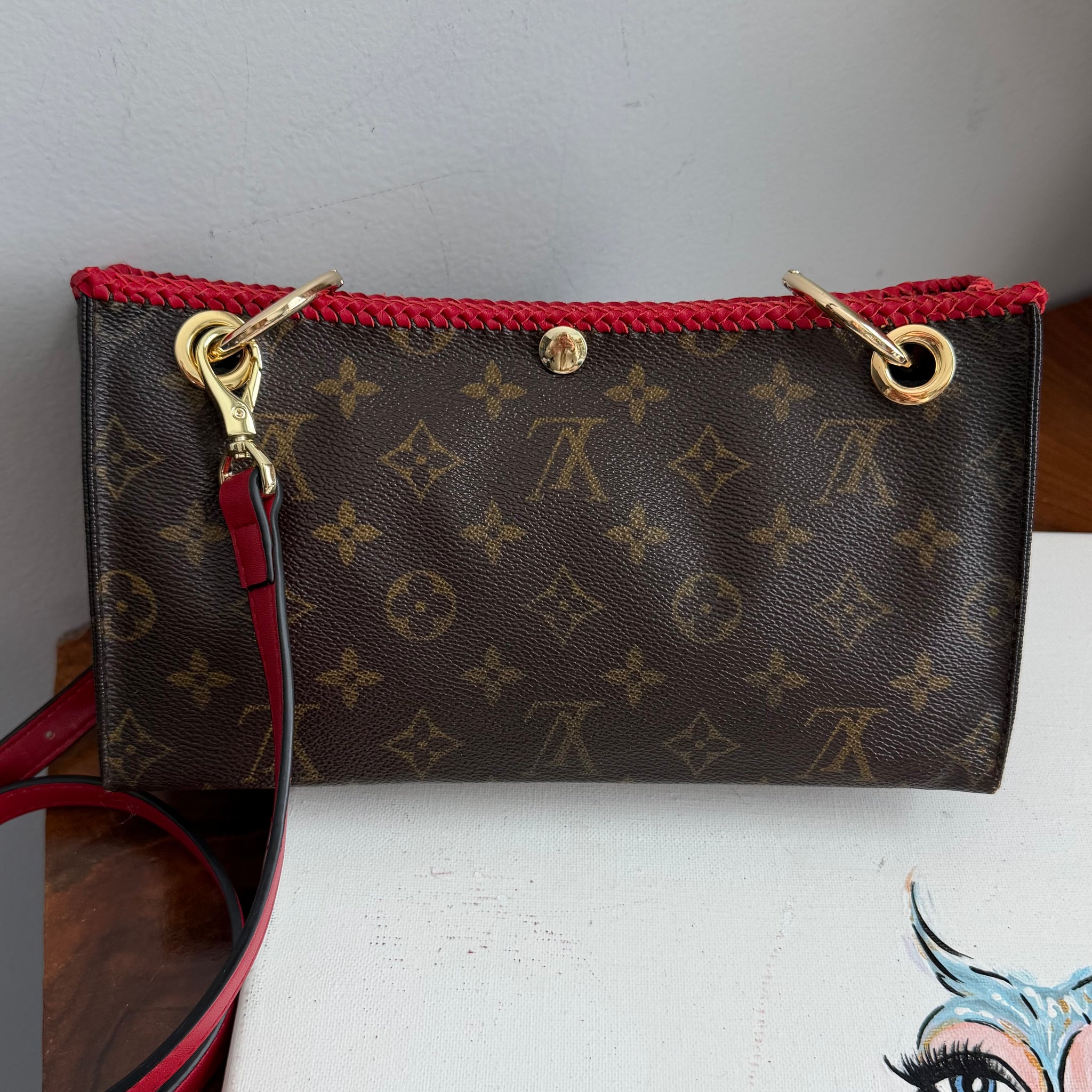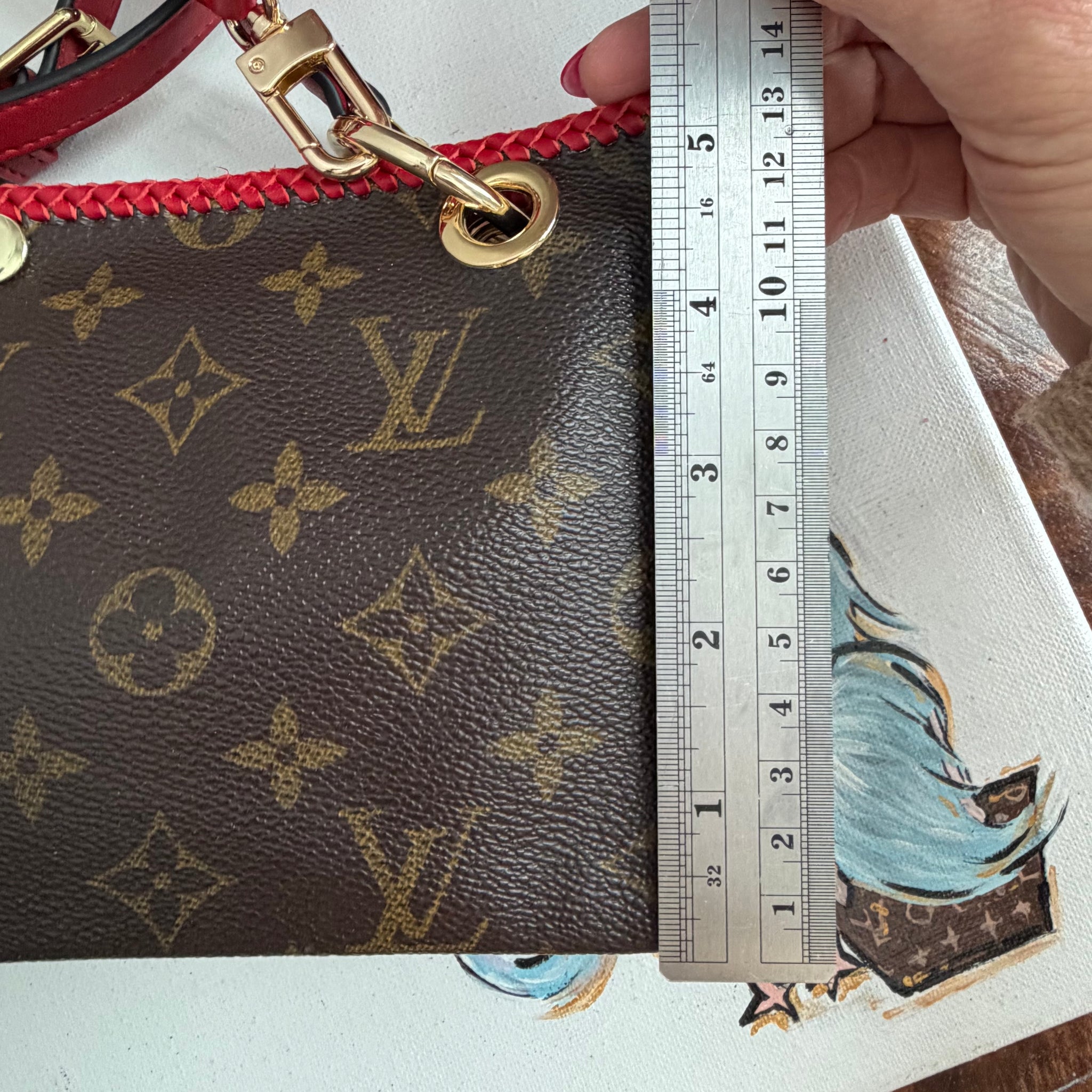 The bag's exterior monogram canvas is in good condition, with slight fading. The zipper was removed as it was no longer functional. The bag's interior had vuittonite, so it was removed, leaving the clean, bare canvas. I’ve included a black organizer, which helps keep the bag’s structure and ensures your goodies stay organized. There is a gold button magnetic snap at the top for closure. The top edges are stitched by hand with a red leather lace, which takes several hours to complete.
