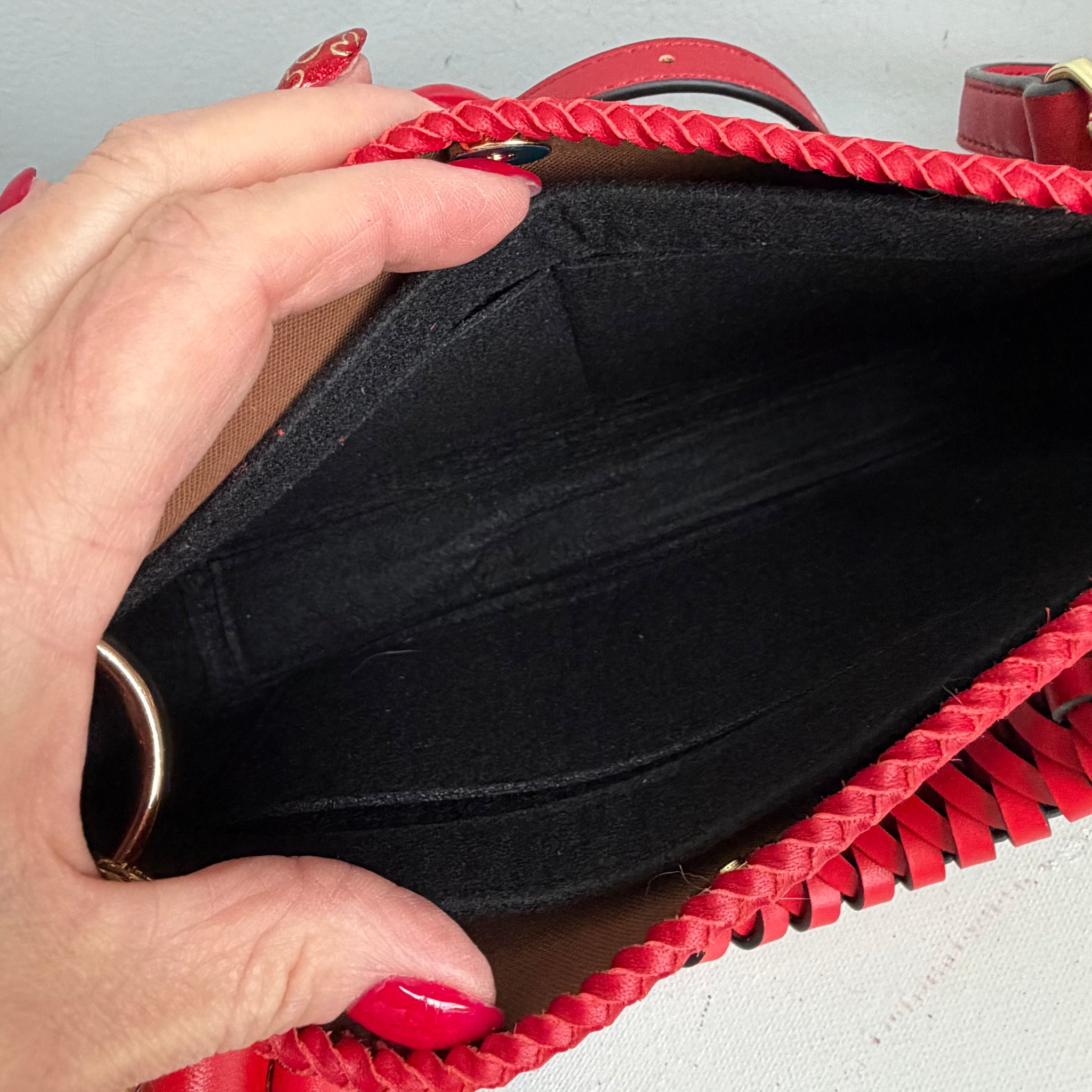 Brass eyelets were added to the corners so that the brass rings could easily go through them. There are two straps included with this bag!! The longer adjustable red leather strap is perfect to wear crossbody or as a shoulder bag (37-47"). Or, remove it and carry the bag with the smaller braided black leather strap (12"). Both straps are completely removable so that if you have one you love to use, you can use that too!