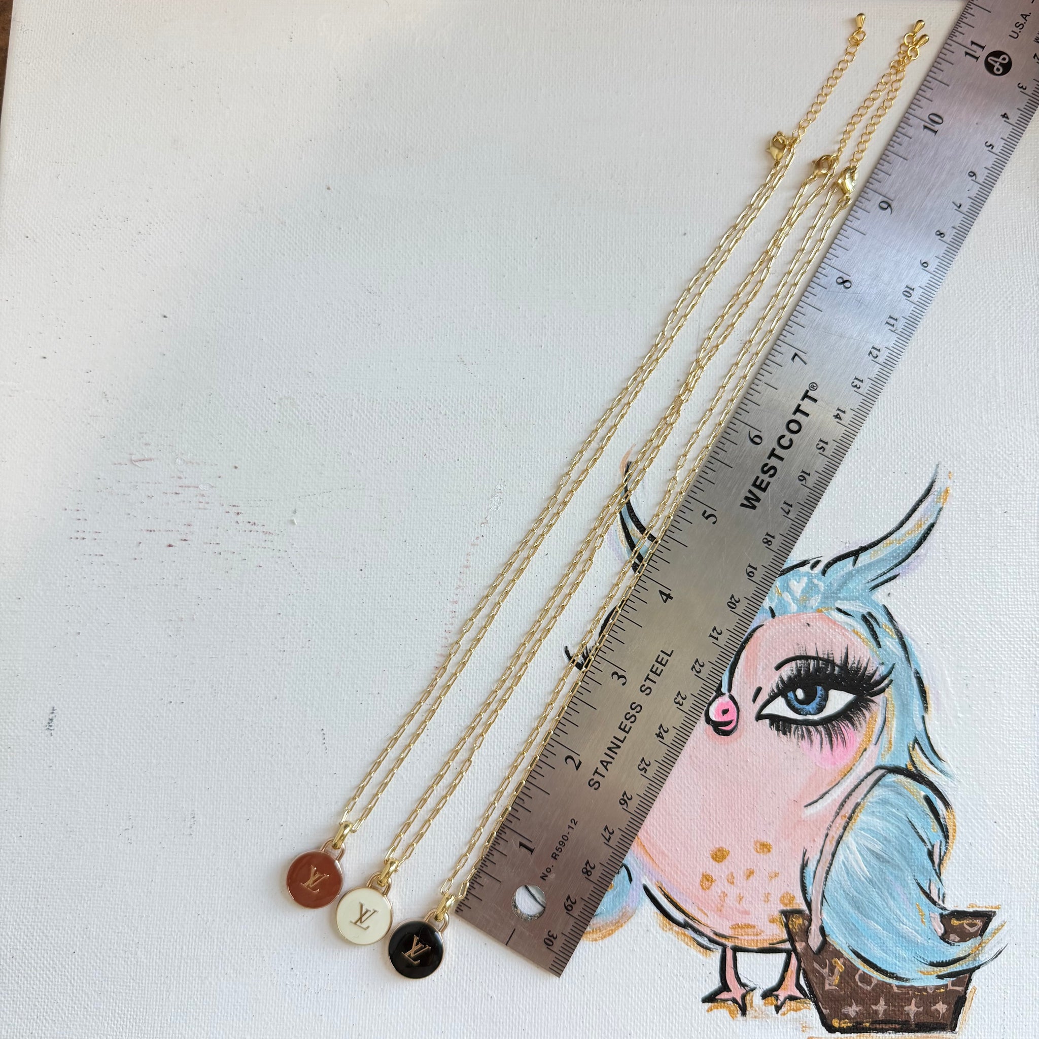 All chains are the same gold-filled paperclip chain and are about 18” long but also have a two inch extender. The charm itself is small and only about 5/8" in diameter.