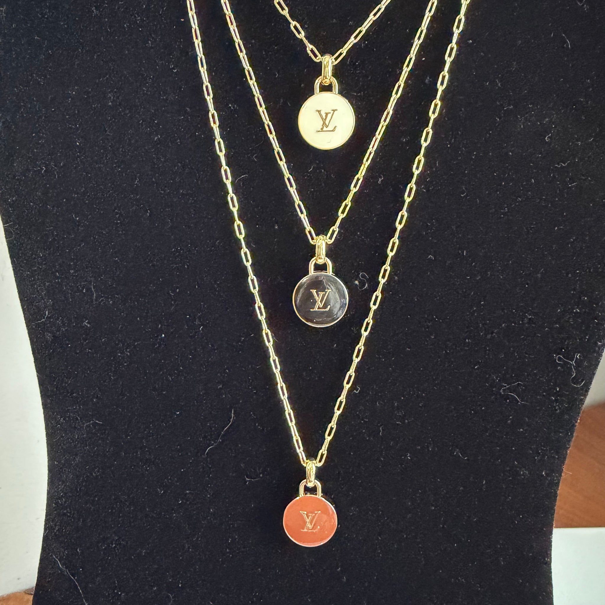 These gorgeous authentic LV charms were rescued from several bag charm sets (see last pic) and made into beautiful pendant necklaces. Choose your favorite color!