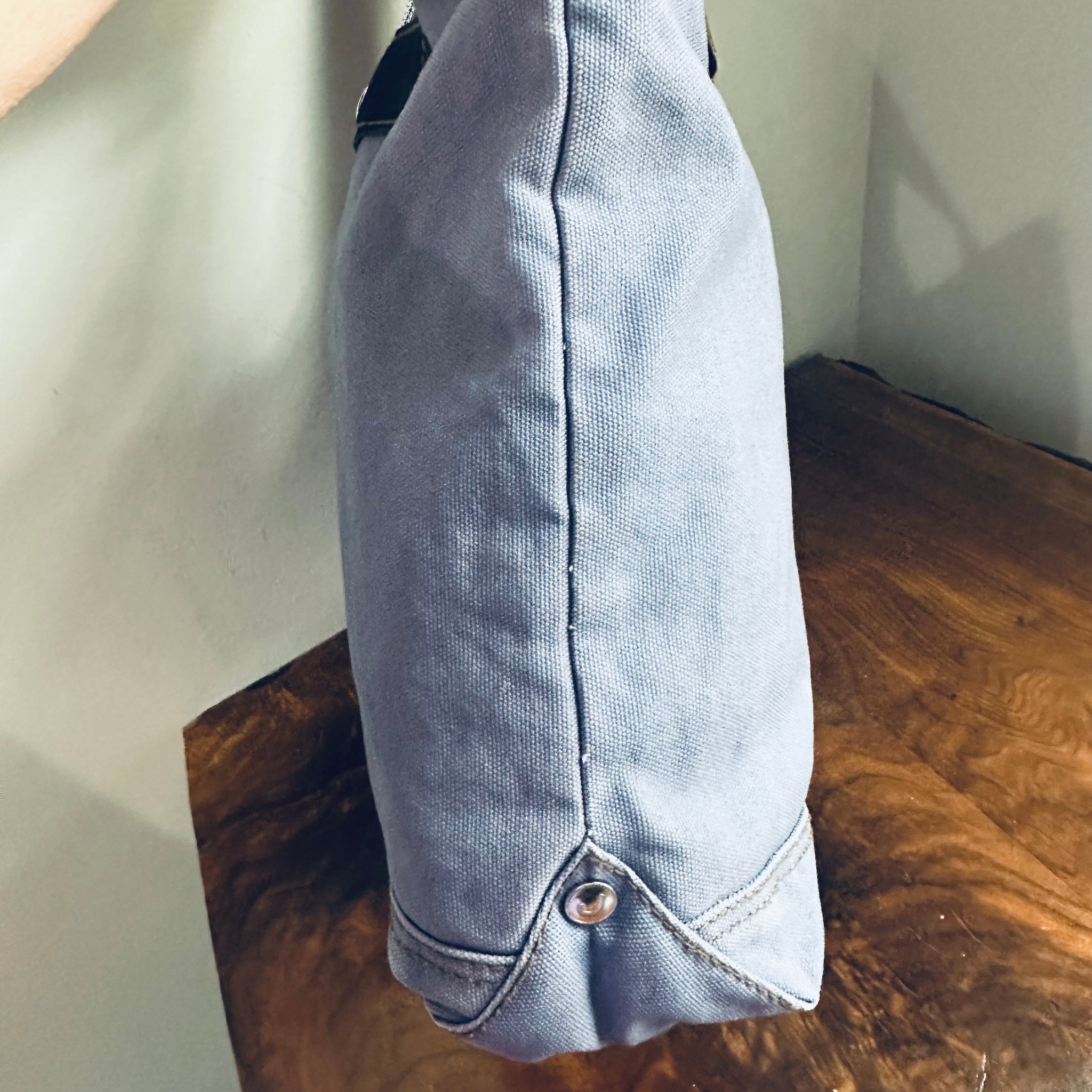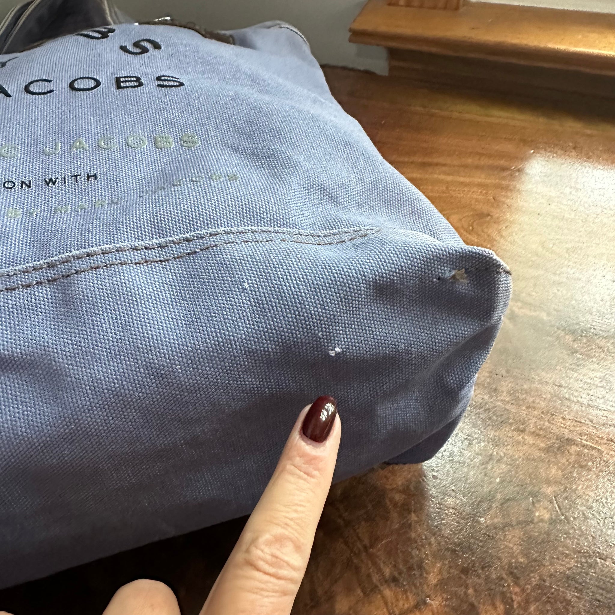 Here is a super fun vintage Marc Jacobs tote that I acquired in a bulk order. This is a denim canvas tote that has a suede brown strip at the top. She's been thoroughly cleaned and is ready to see the town. This tote has a zippered top and a nice roomy interior. This is a used bag, so the handles are slightly faded, but the rest looks great!!! The printing and the hardware looks amazing!
