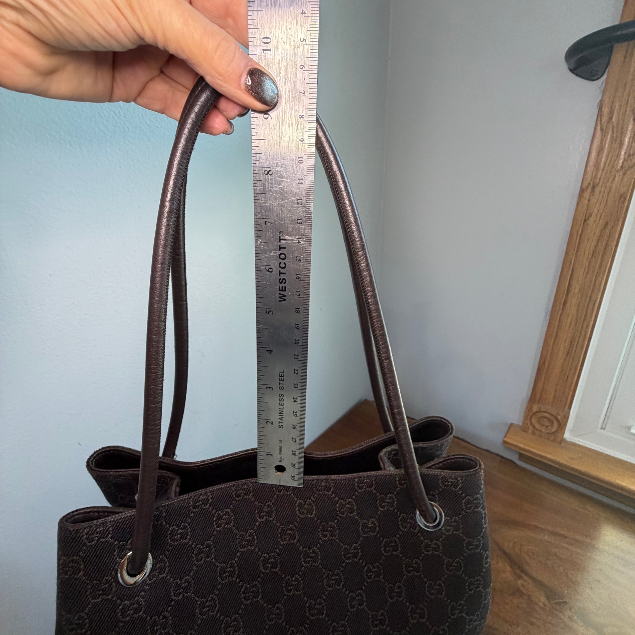 This bag just needed to be cleaned up and the leather redyed. The corners were slightly worn, so I redyed the canvas so they aren't as noticeable (although the pictures make them look darker). The drop length on the strap is 9.5 inches.