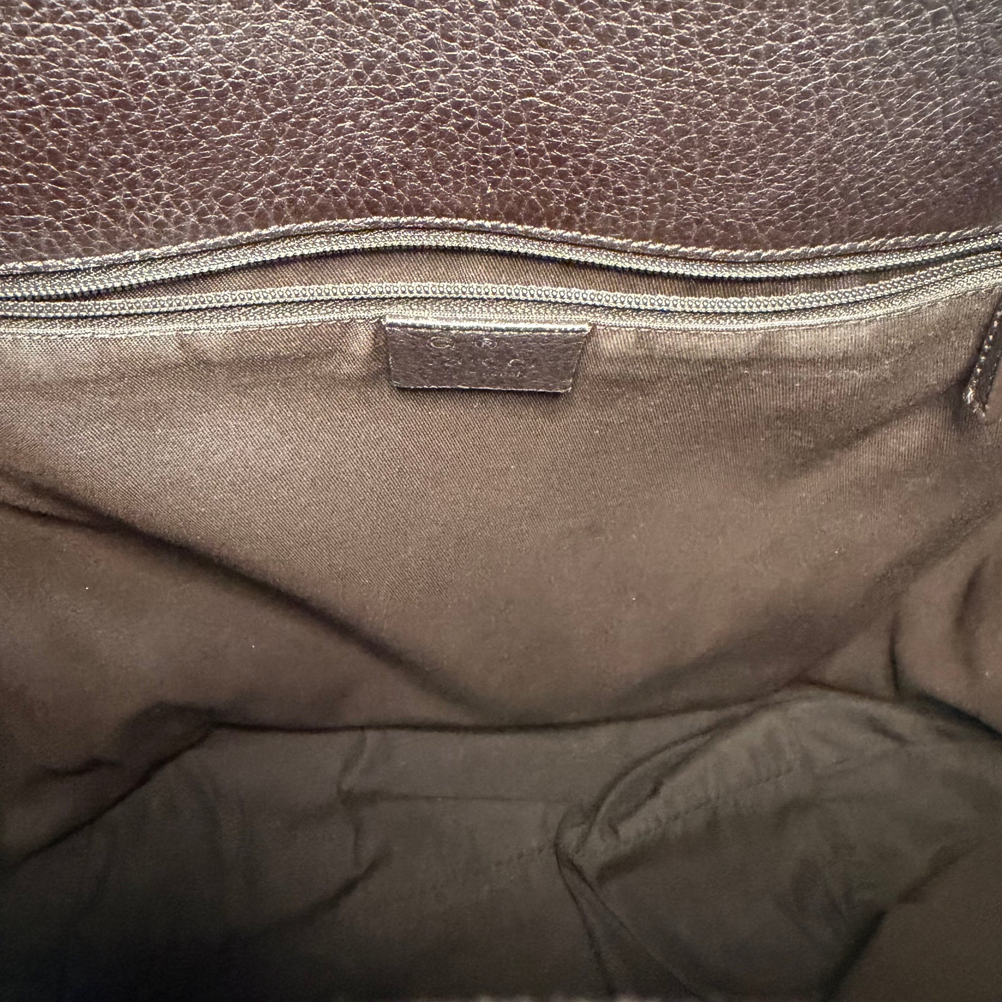 This bag doesn't have a closure, per se, but it does sinch up so the top doesn't just flop open. It's really a beautiful bag. The interior has been cleaned, is very roomy, and contains one zippered pocket.