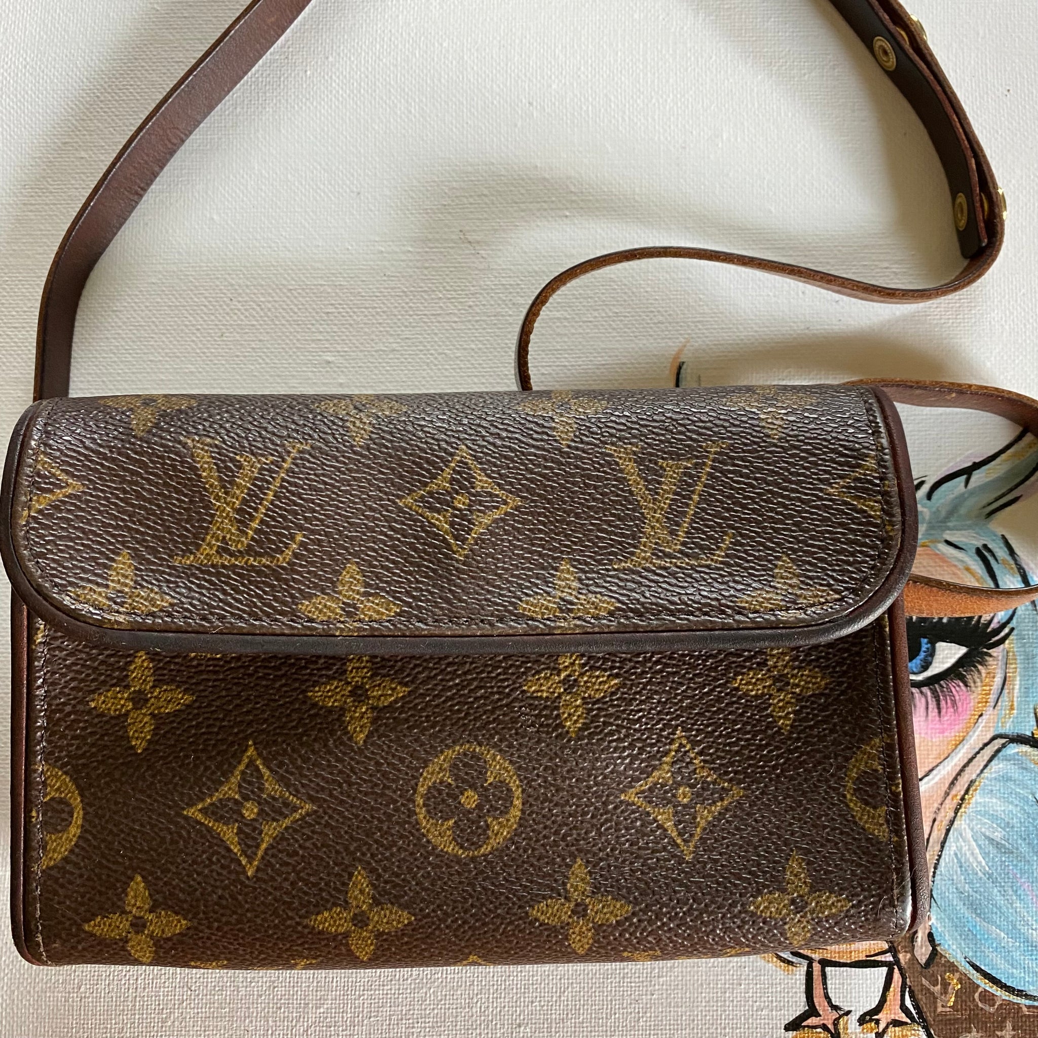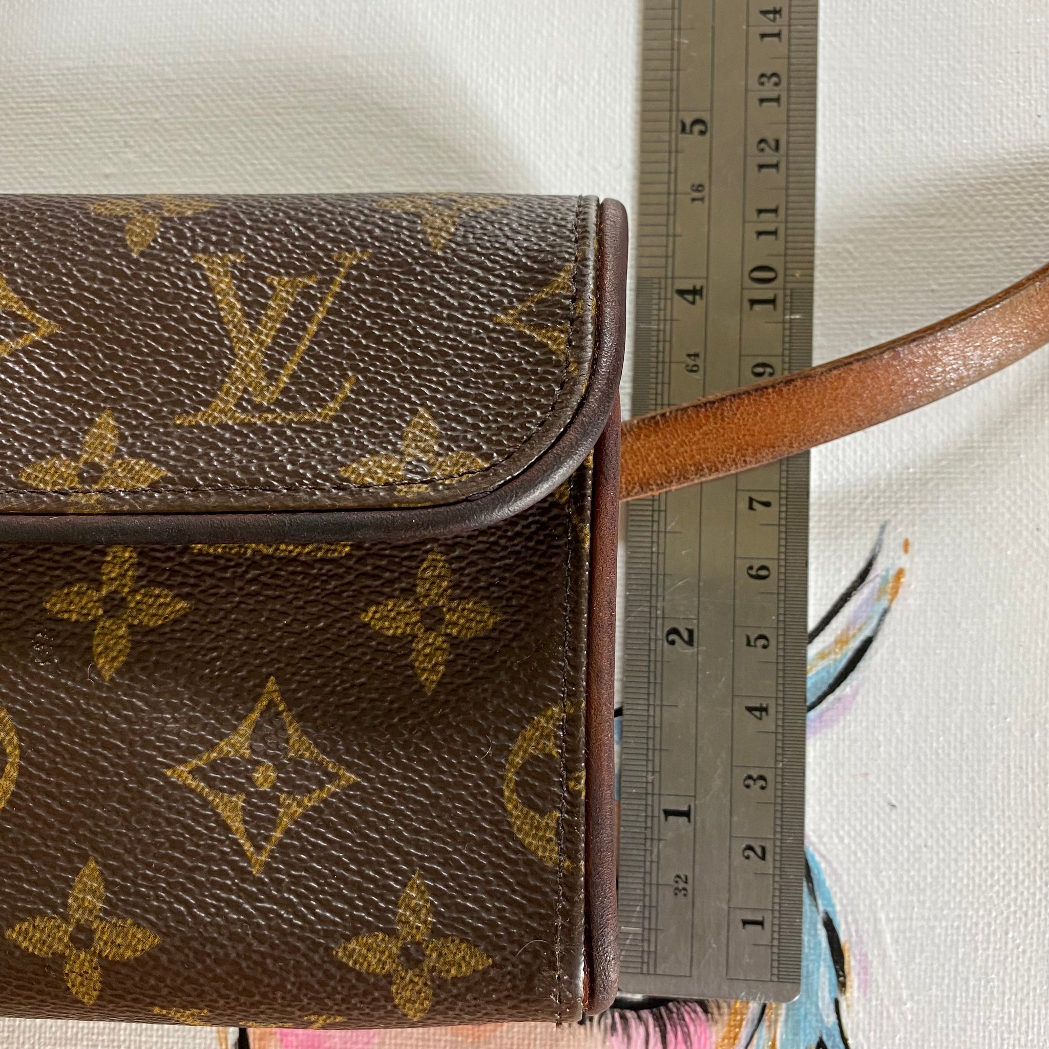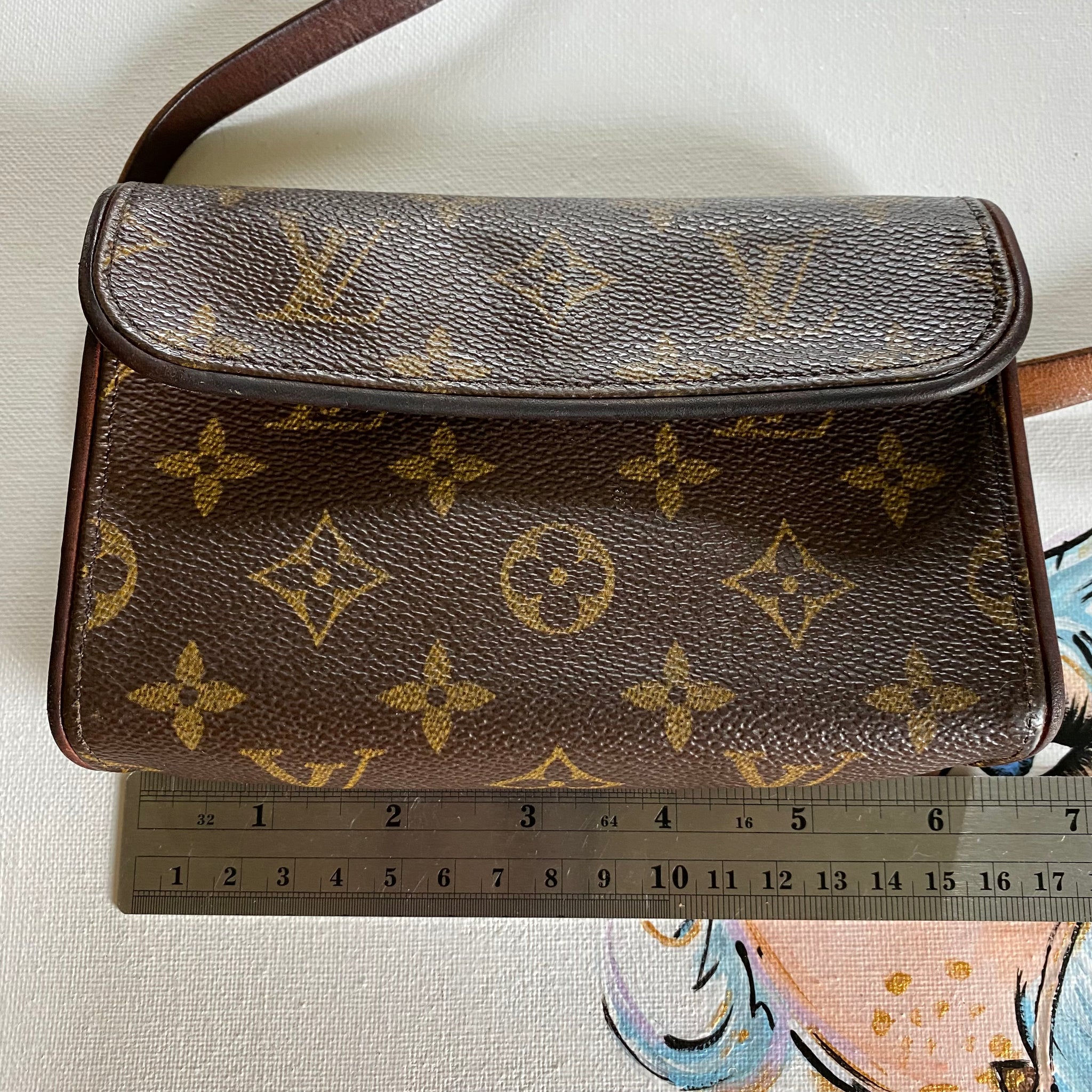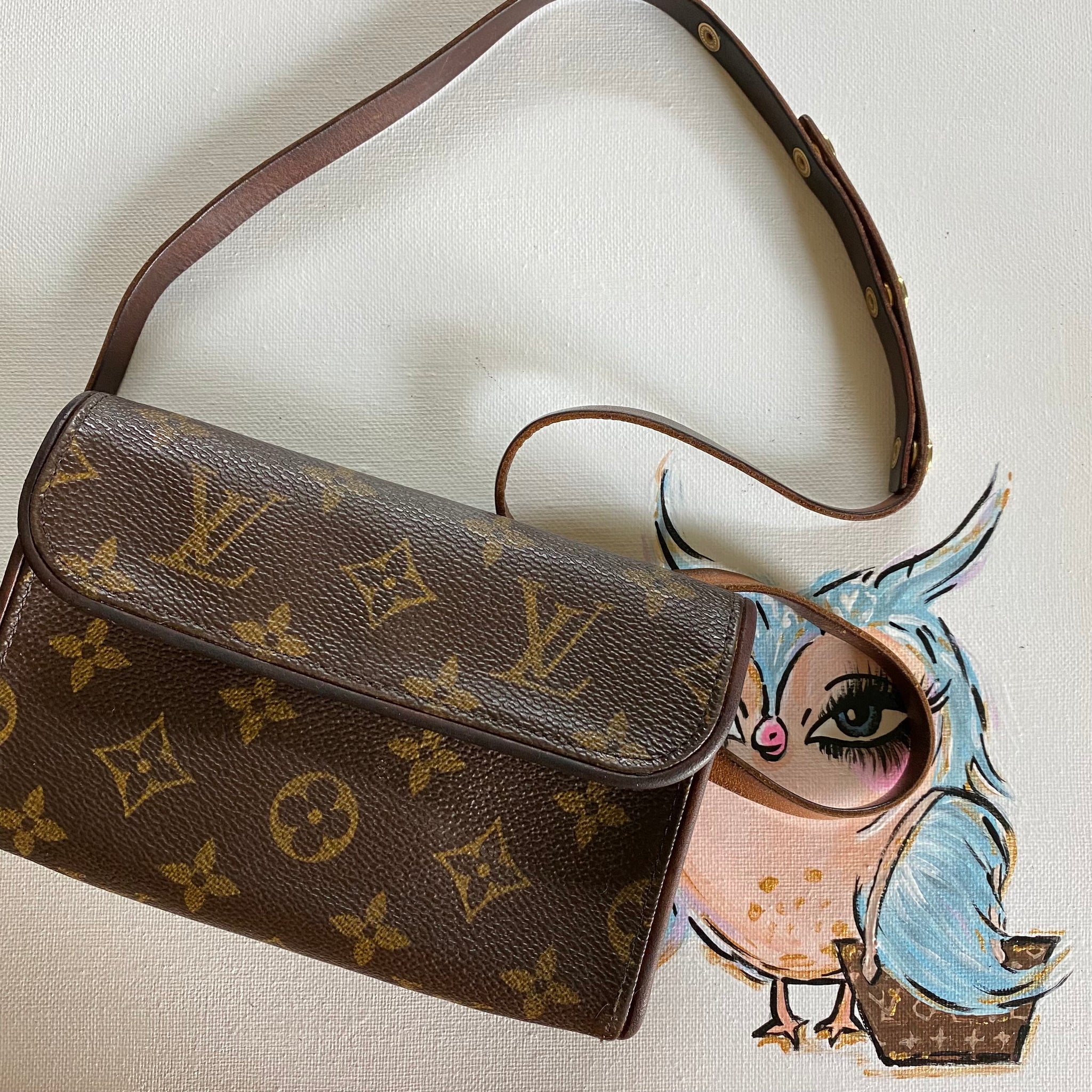 This bag is a Pochette Florintine XS. The strap had become detached from the bag so I added holders to the back and voila, good as new. I've given it a really good cleaning, but some stains on the interior remained. I did clean up and darken the vachetta to hide the staining....now it looks perfect!! It comes with the original strap, but will fit a belt up to one inch wide. The original strap is adjustable from 31-36"