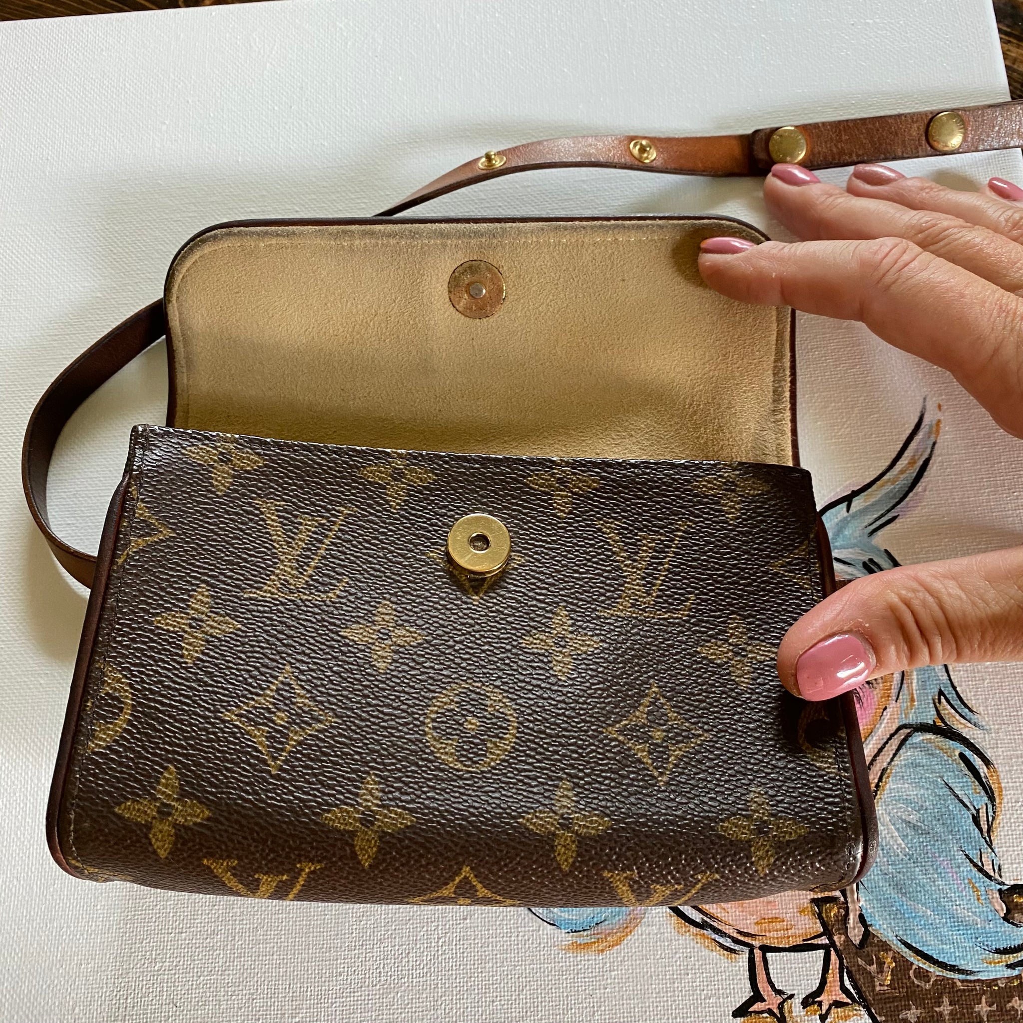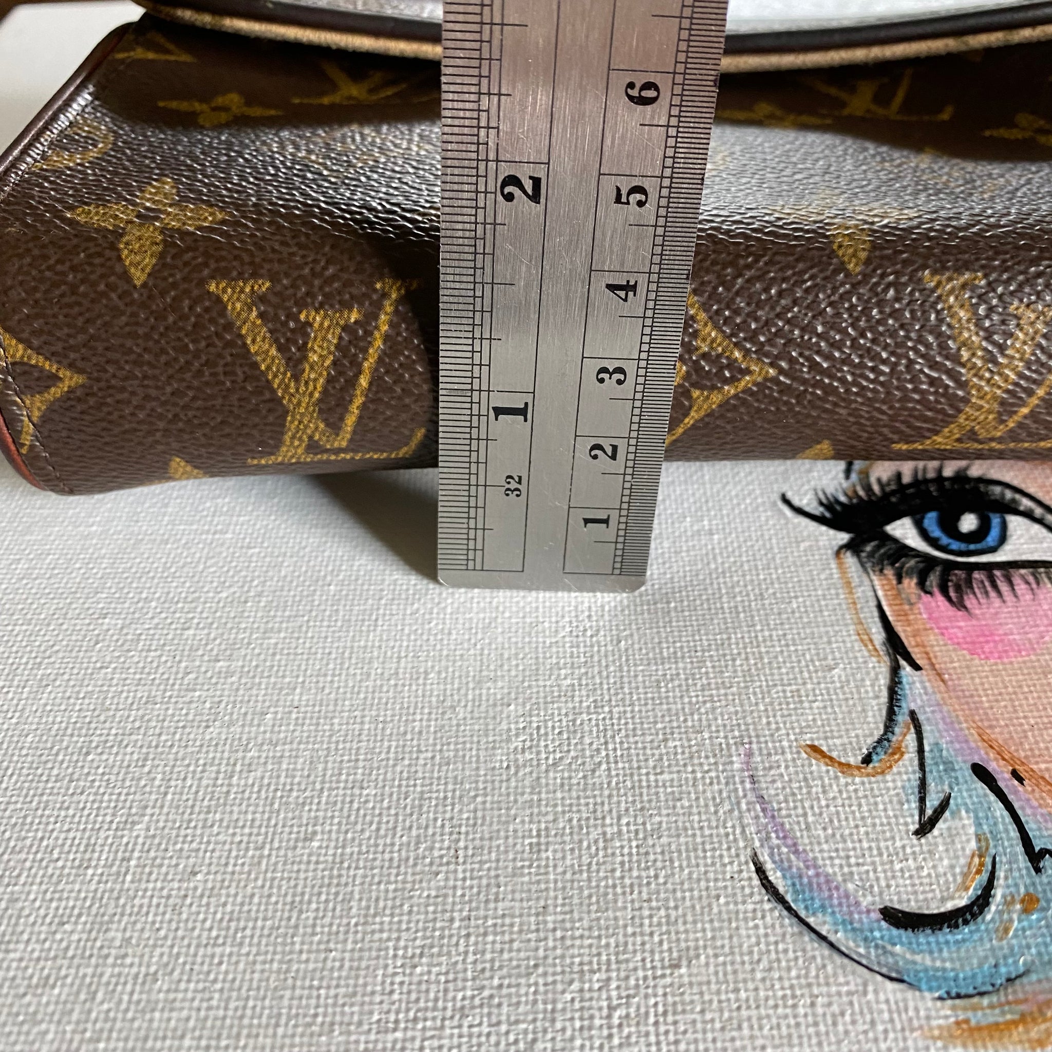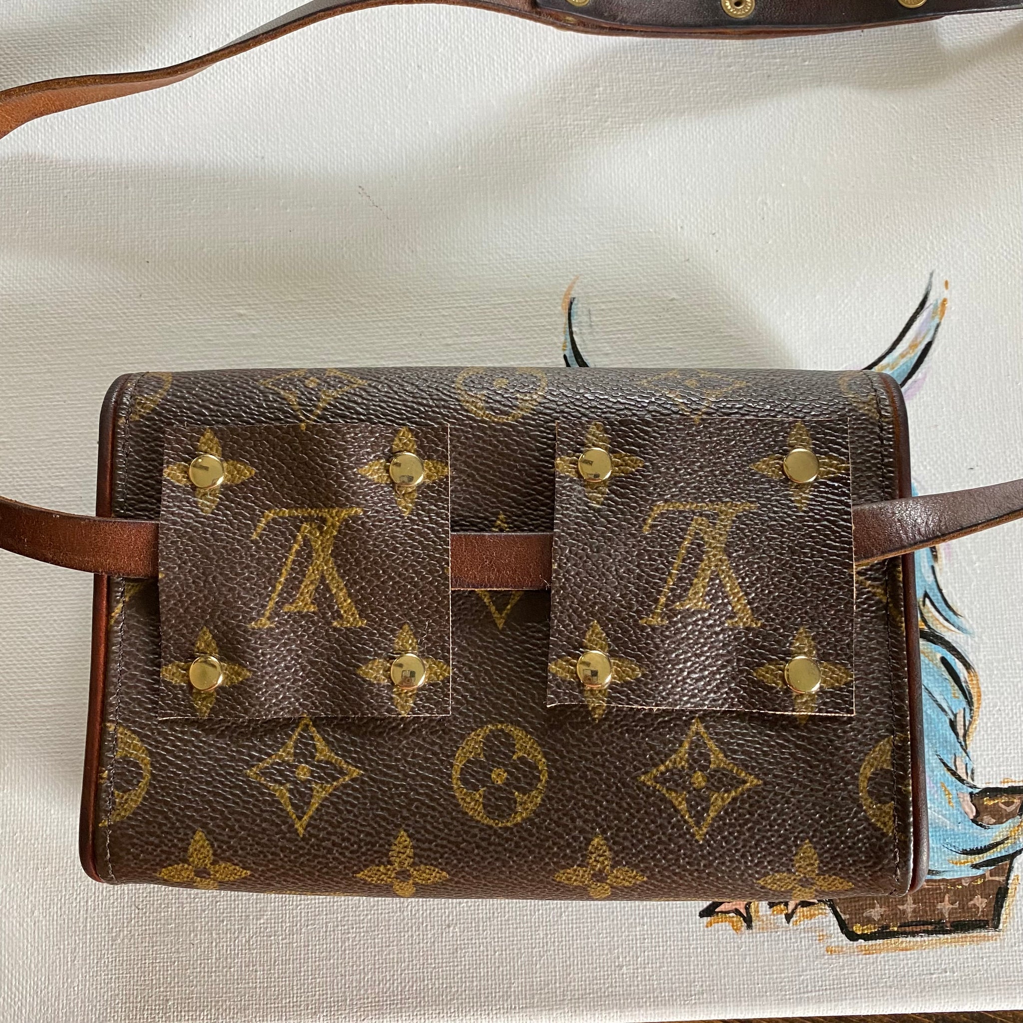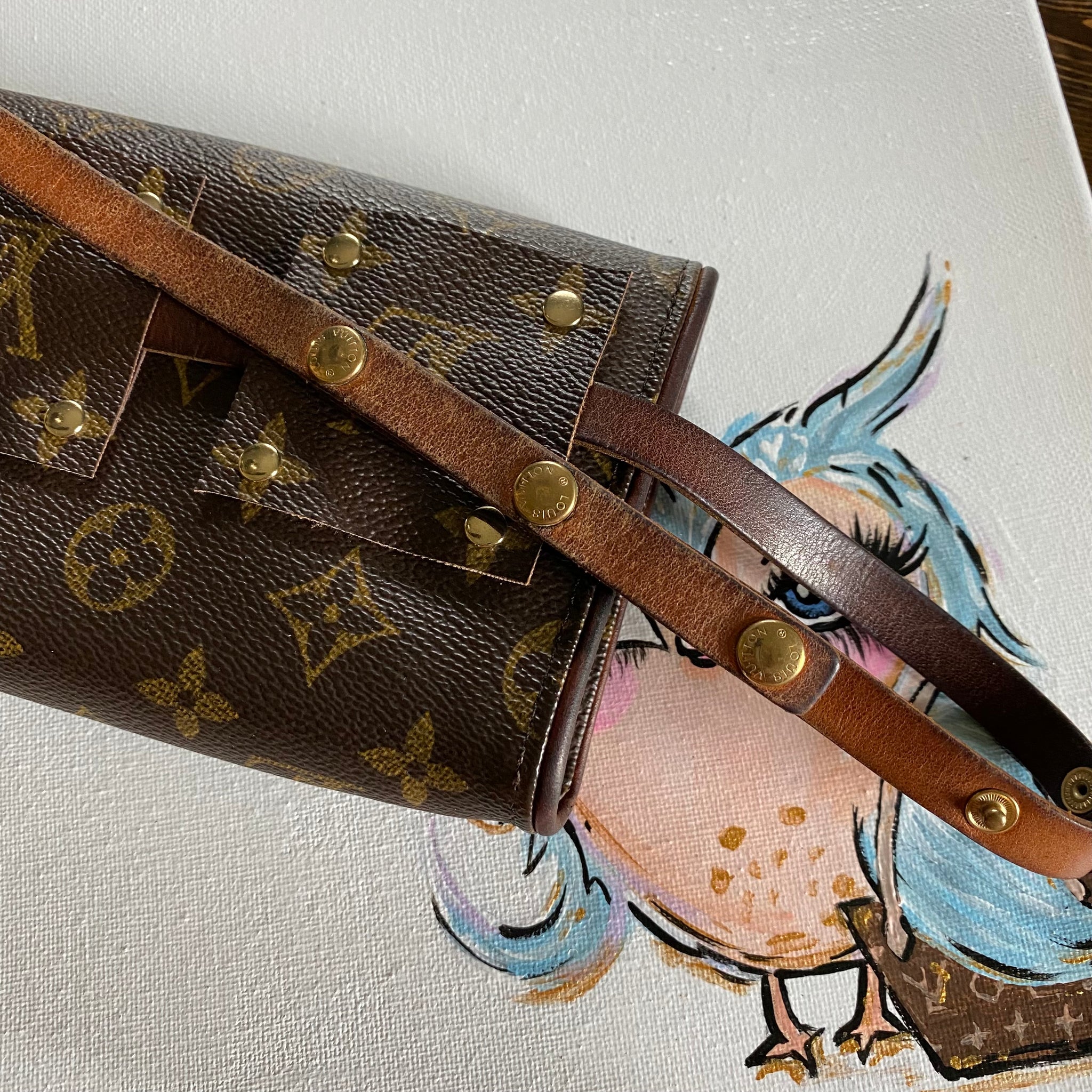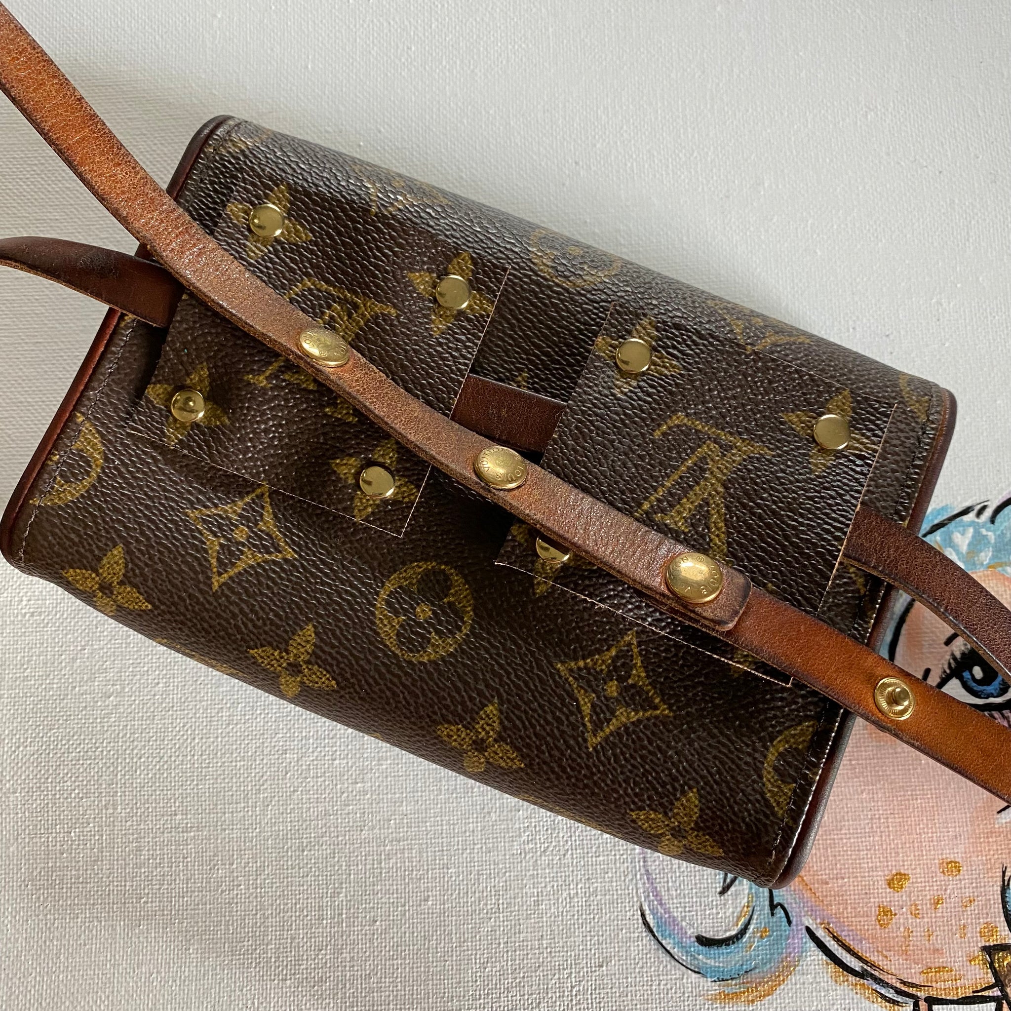 This bag is a Pochette Florintine XS. The strap had become detached from the bag so I added holders to the back and voila, good as new. I've given it a really good cleaning, but some stains on the interior remained. I did clean up and darken the vachetta to hide the staining....now it looks perfect!! It comes with the original strap, but will fit a belt up to one inch wide. The original strap is adjustable from 31-36"
