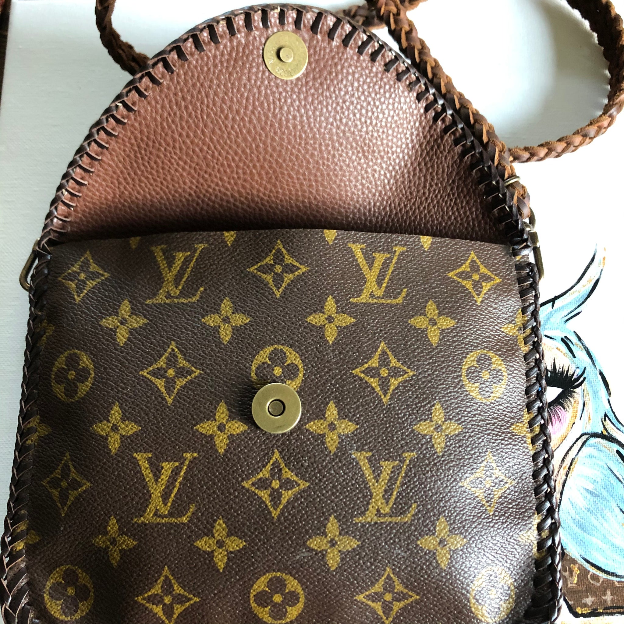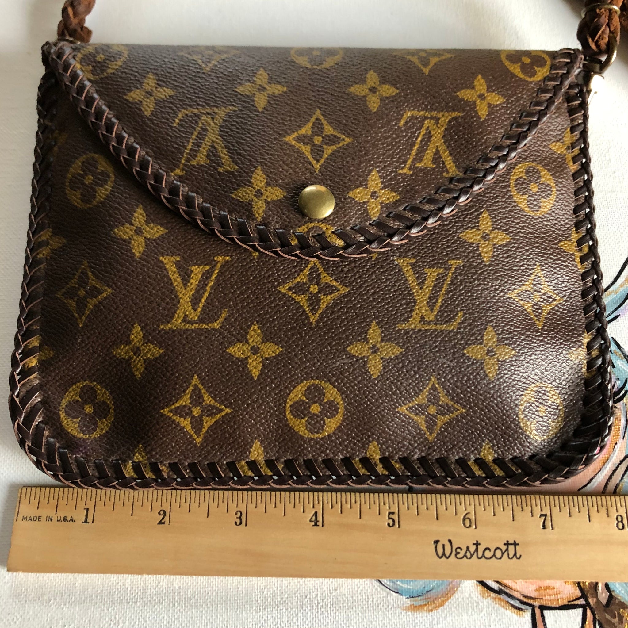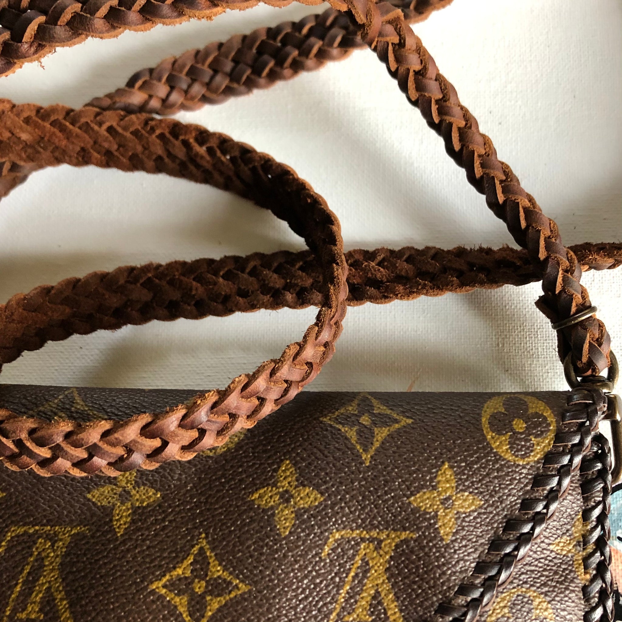 The entire inside of the bag is lined with a brown leather in order to give the bag some substance. The outside edges are stitched with brown leather that has been laced by hand. There are antique gold D-rings stitched into the back so that you can go from crossbody to wristlet to clutch! The wristlet strap is monogram as well. The 6-strand brown leather crossbody strap is braided together flat but then rolls into a rounded section towards the ends. Lays across your body and shoulders perfectly! It has LV-like antique brass connectors. And remember, both straps can be removed to turn this into a beautiful clutch. The bag closes with a simple antique gold colored magnetic snap.