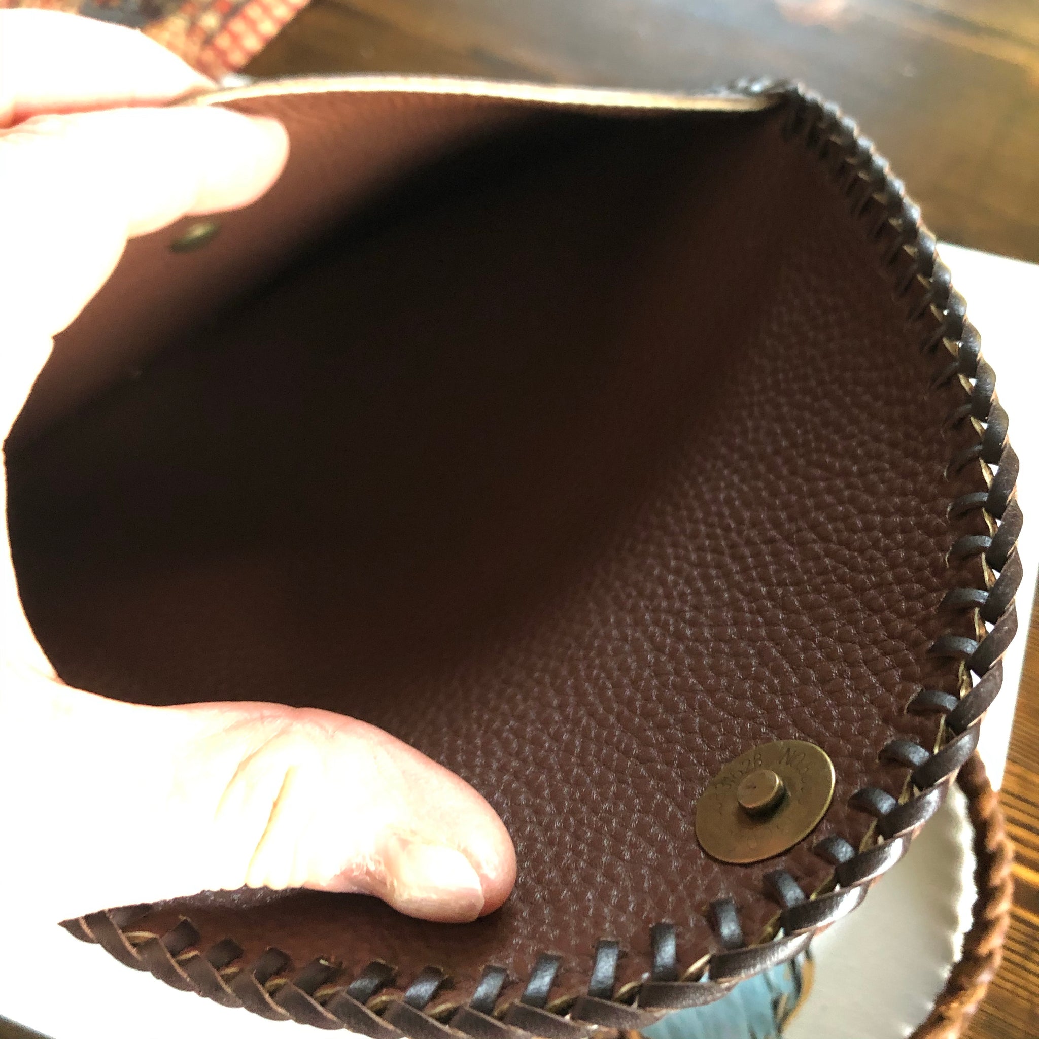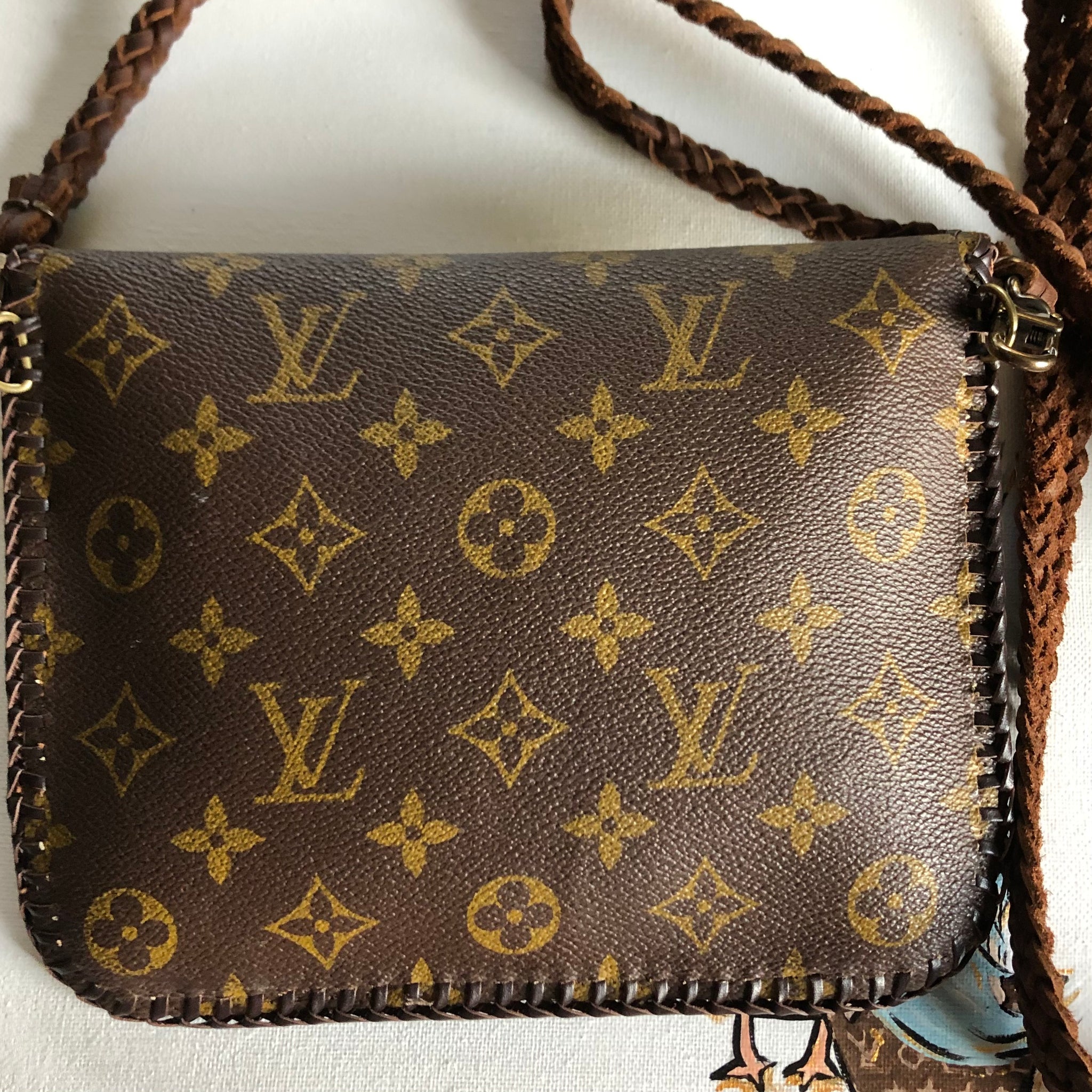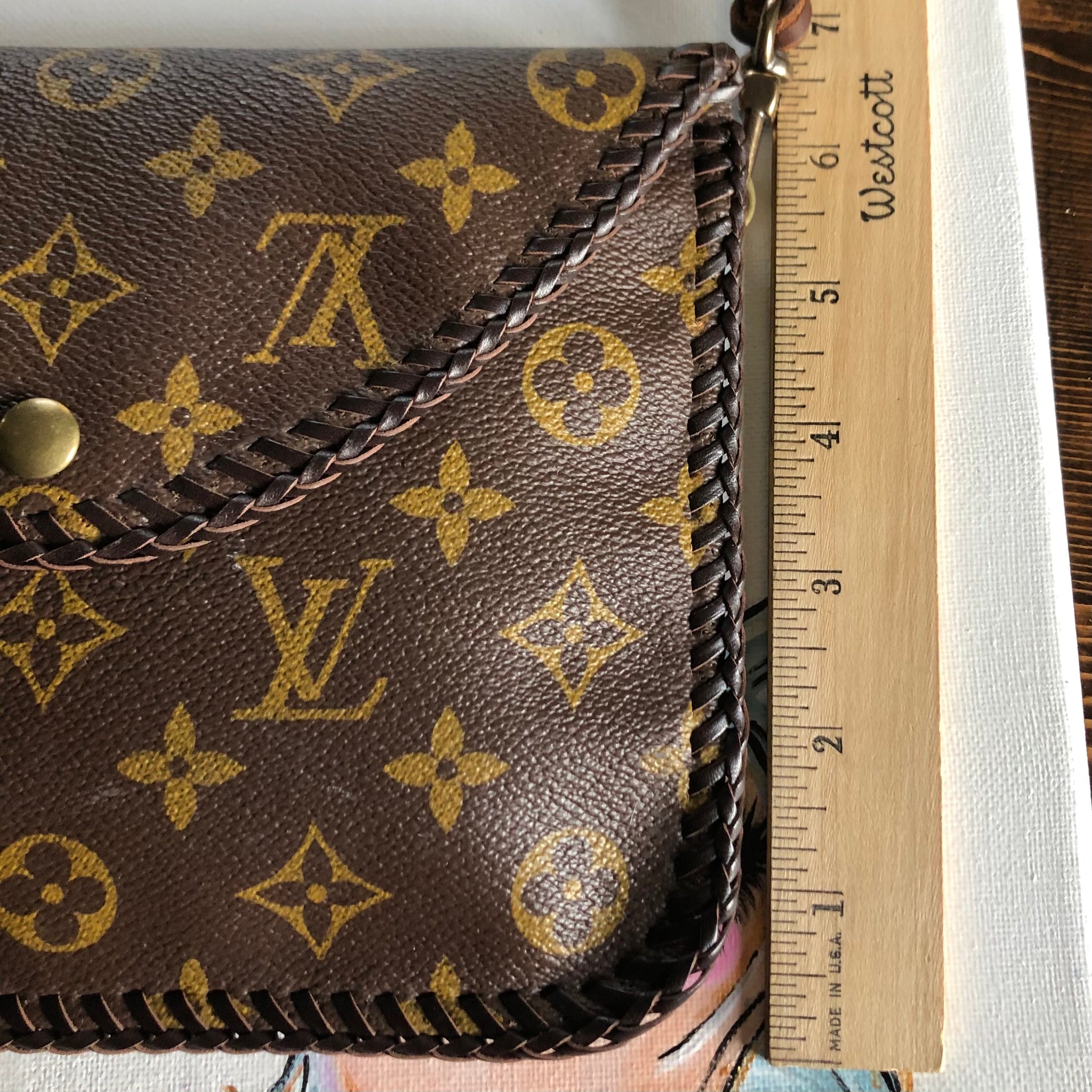 The entire inside of the bag is lined with a brown leather in order to give the bag some substance. The outside edges are stitched with brown leather that has been laced by hand. There are antique gold D-rings stitched into the back so that you can go from crossbody to wristlet to clutch! The wristlet strap is monogram as well. The 6-strand brown leather crossbody strap is braided together flat but then rolls into a rounded section towards the ends. Lays across your body and shoulders perfectly! It has LV-like antique brass connectors. And remember, both straps can be removed to turn this into a beautiful clutch. The bag closes with a simple antique gold colored magnetic snap.