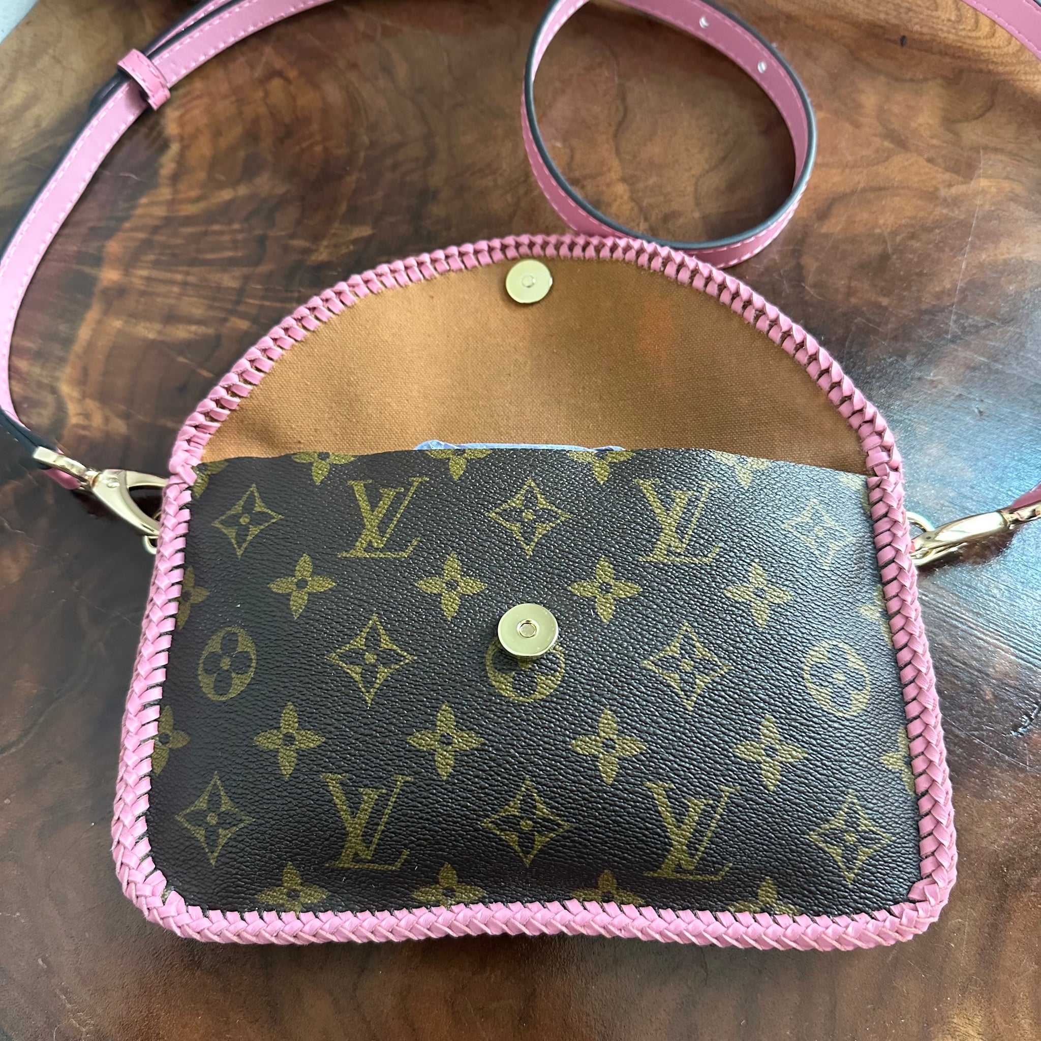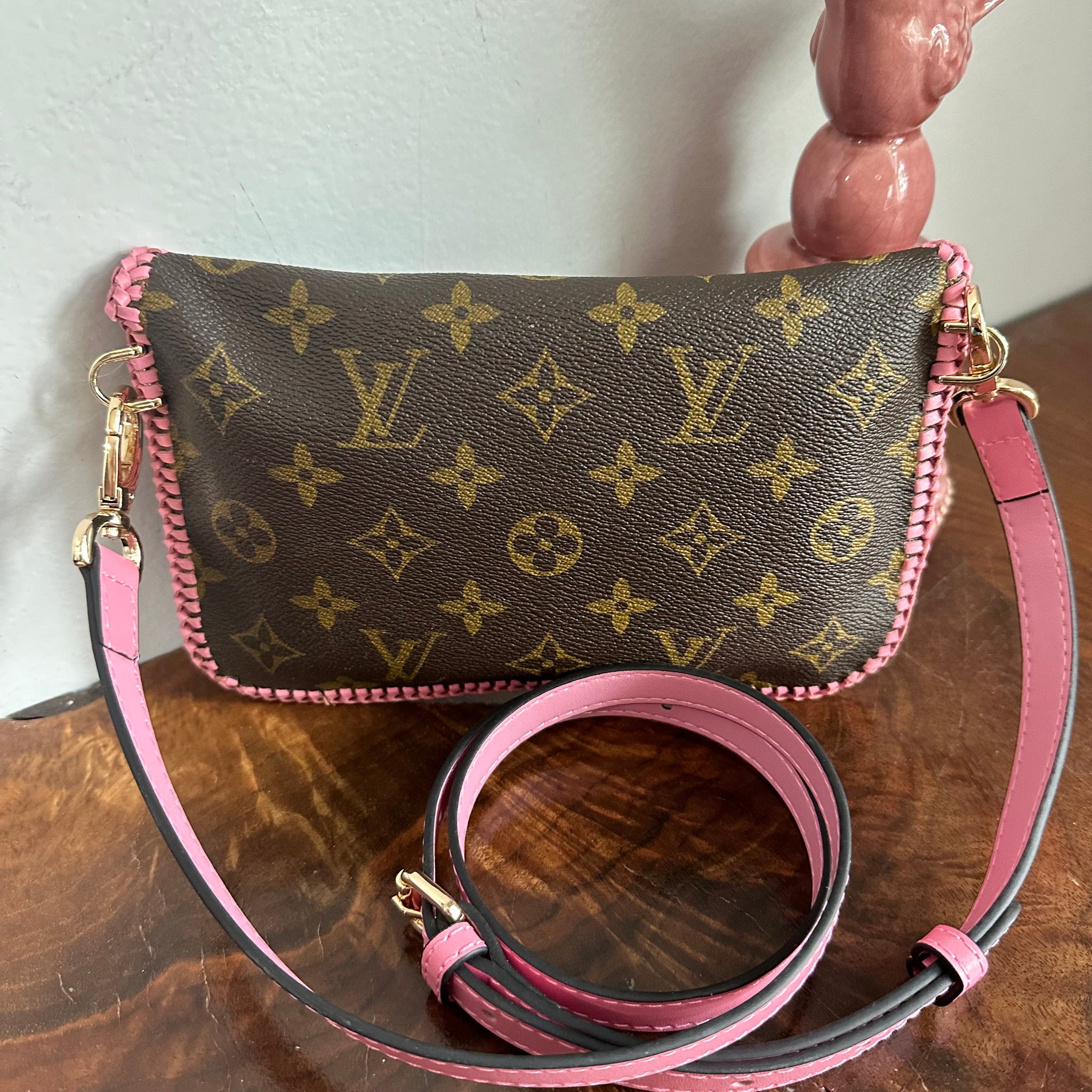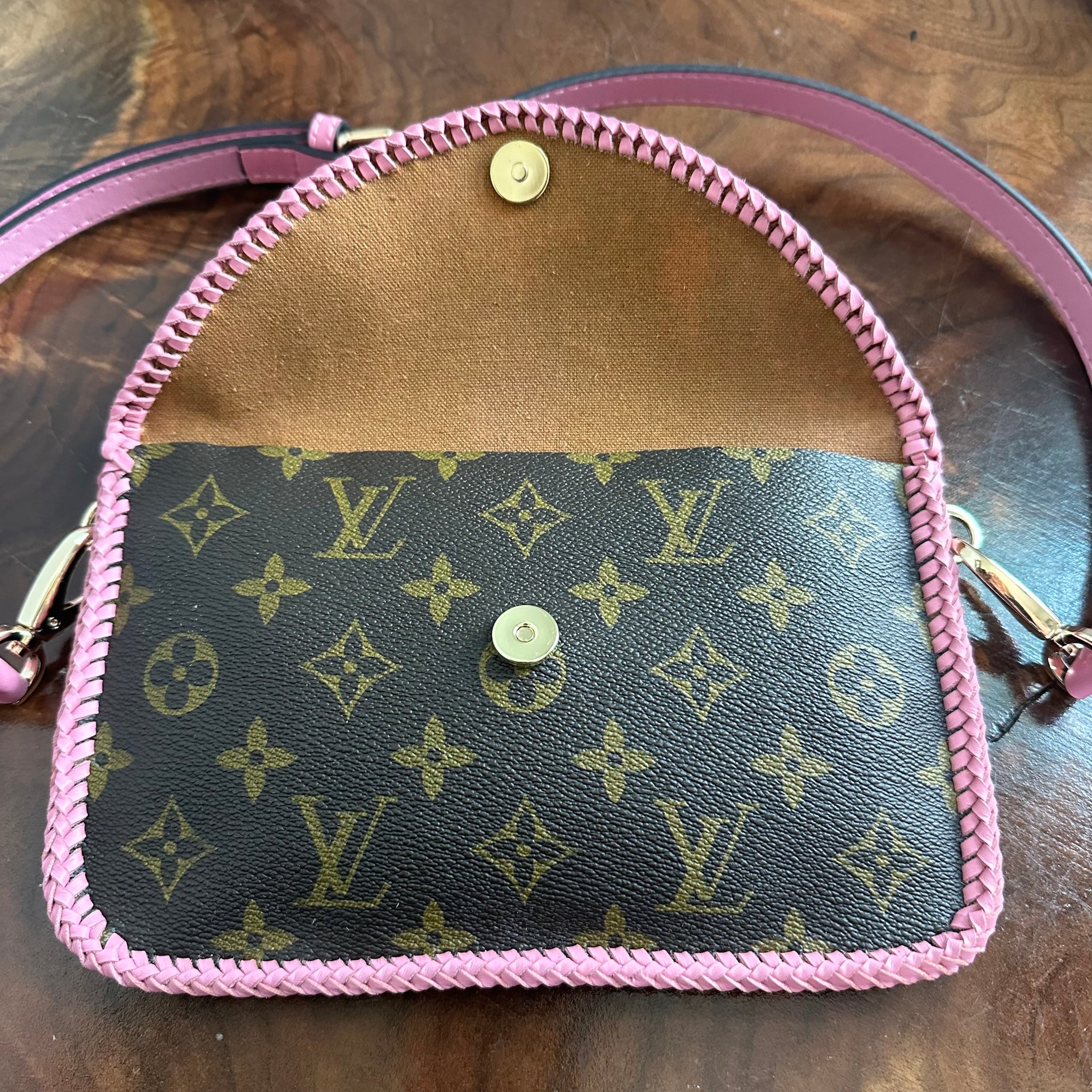 The LV canvas is in great shape. The outside edges are pink-colored leather lace which have been stitched by hand. I've stitched in gold D-rings to the back of the bag that holds the cute matching pink strap! The strap is adjustable from 39-48." You can also remove the strap and carry this as a clutch!! I've added a gold magnetic button snap to the front, which keeps your items secure.