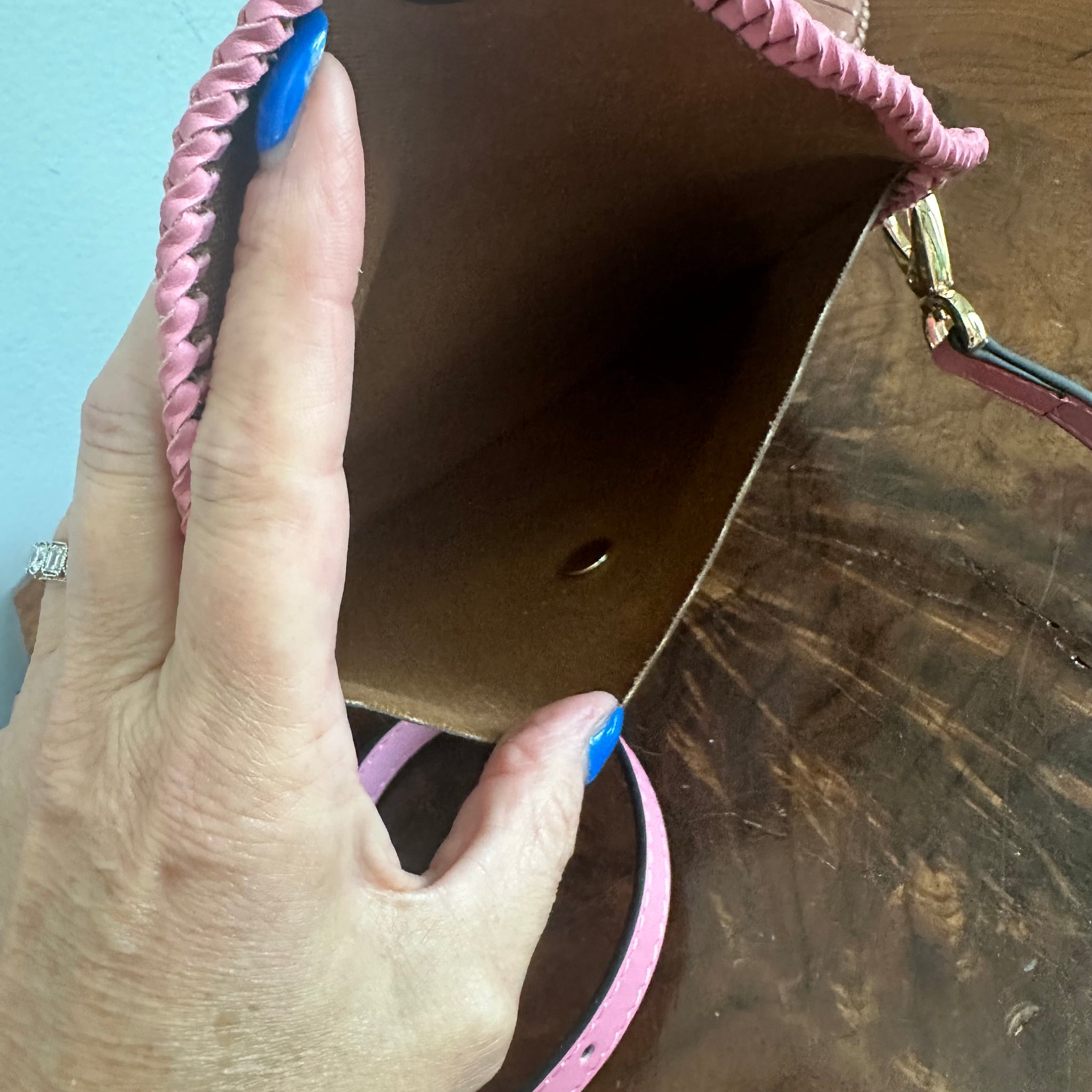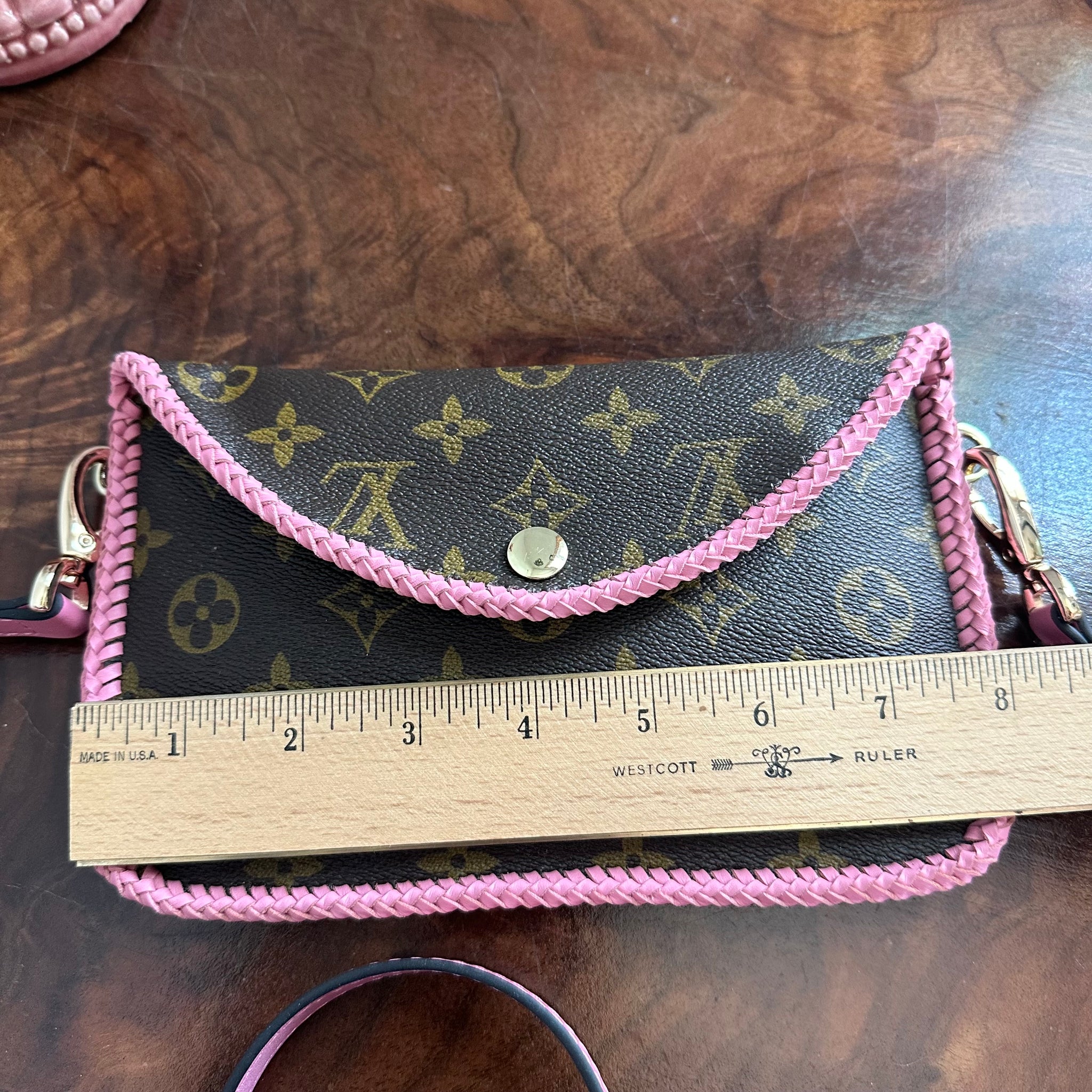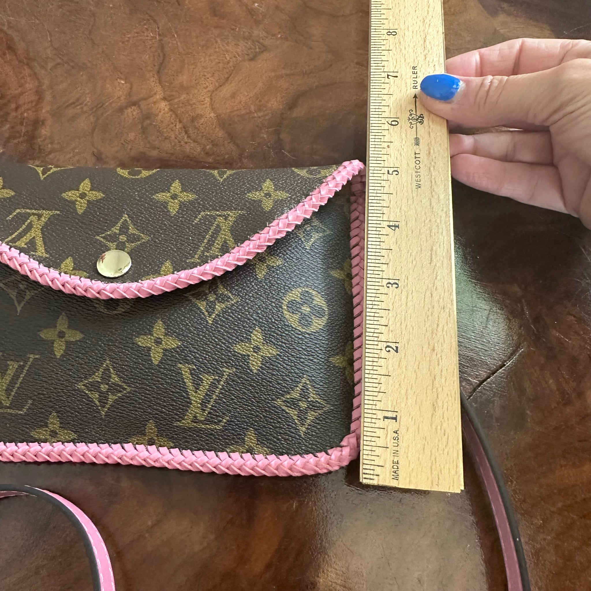 The LV canvas is in great shape. The outside edges are pink-colored leather lace which have been stitched by hand. I've stitched in gold D-rings to the back of the bag that holds the cute matching pink strap! The strap is adjustable from 39-48." You can also remove the strap and carry this as a clutch!! I've added a gold magnetic button snap to the front, which keeps your items secure.