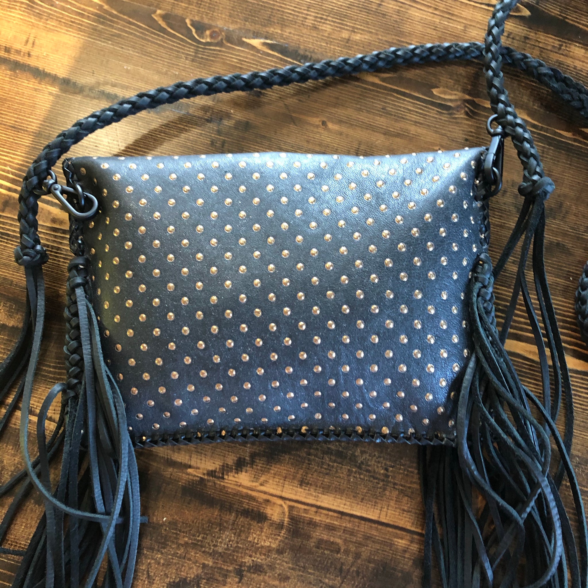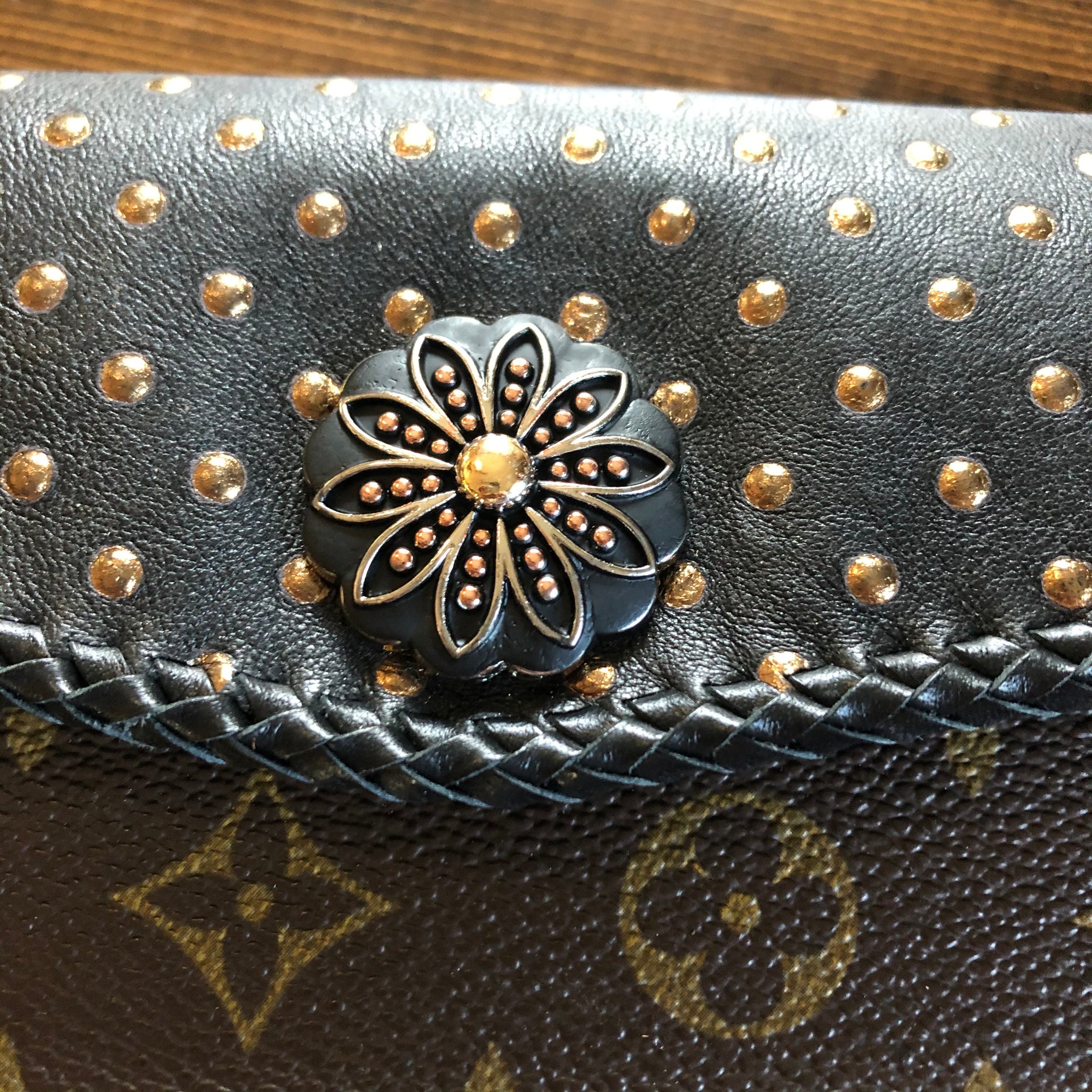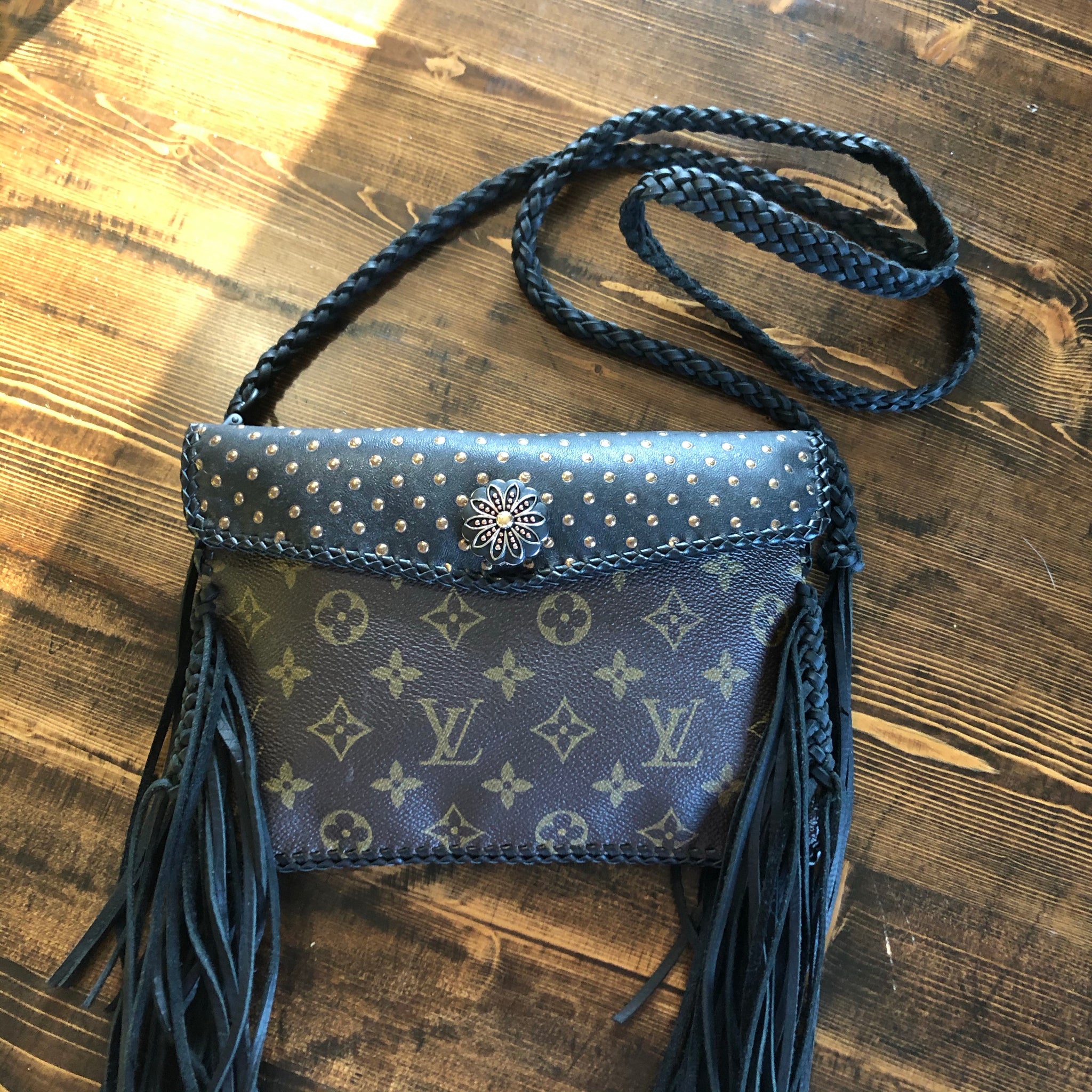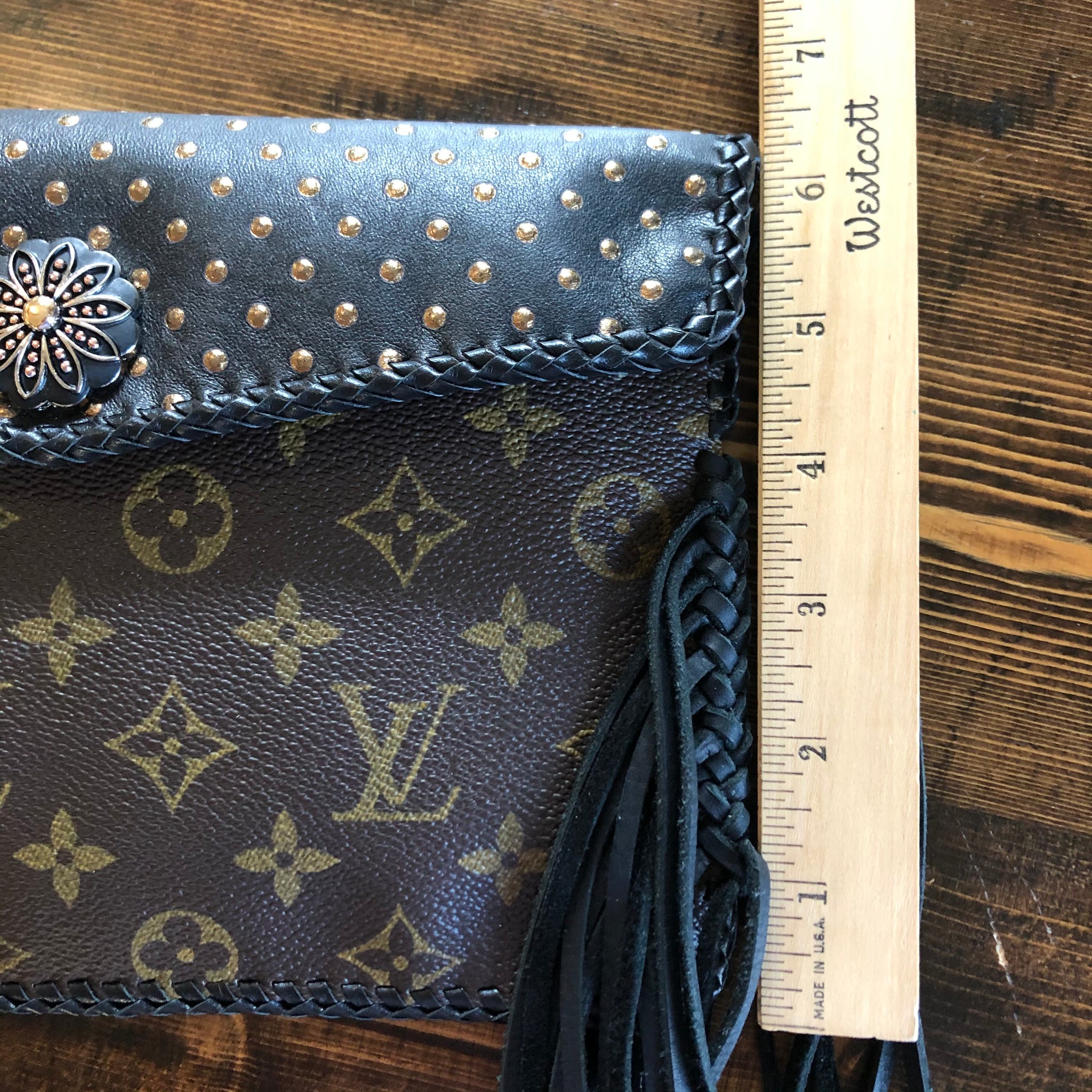 This is a medium crossbody bag that will fit all your goodies. It was created from an authentic Louis Vuitton bag and a beautiful piece of black leather that has edgy gold dots on it. The bag has enough room for just the right amount of things, coming in at 9" wide by 6.5" tall.