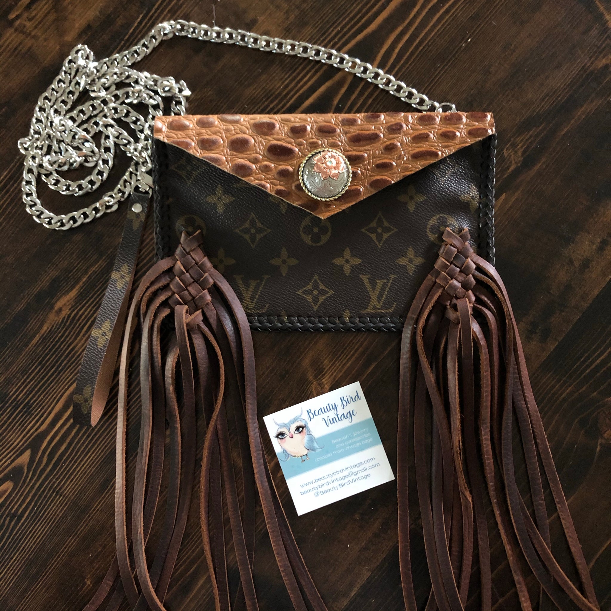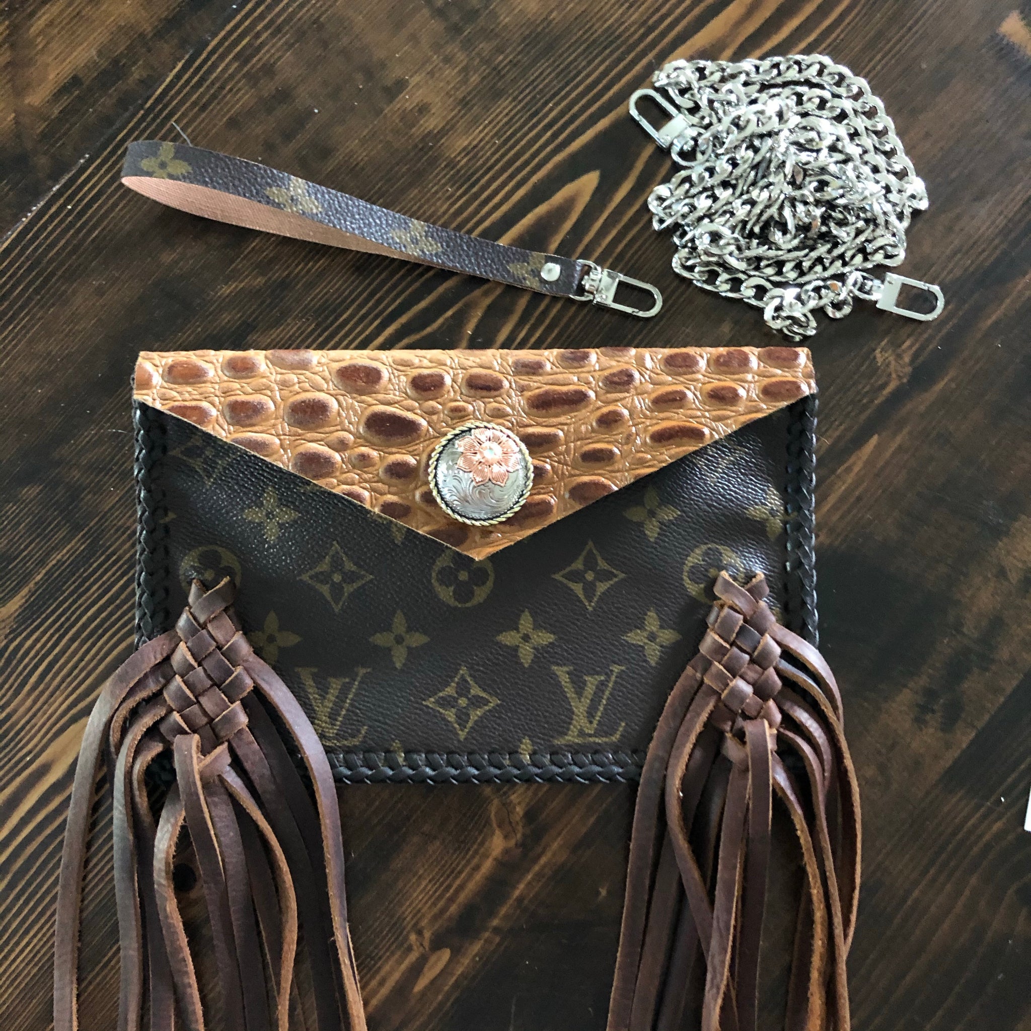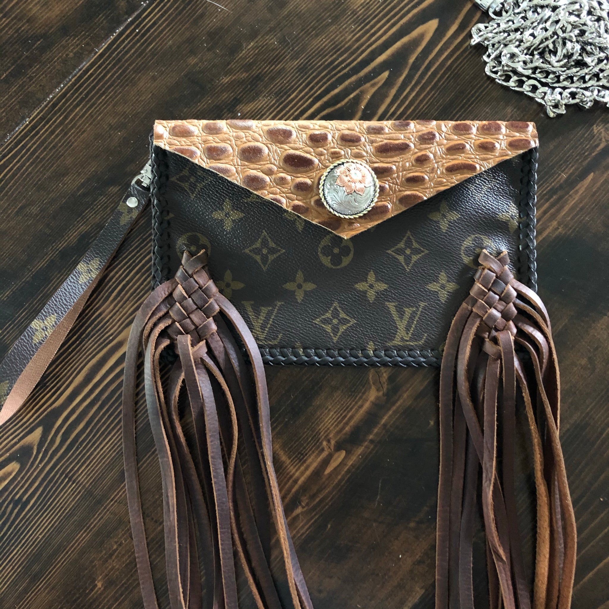 As always, an authentic Louis Vuitton bag was used to create this beautiful little bag. I enhanced the front by adding braided fringe in two different colors to give it some dimension. The back/front flap is a gorgeous Cognac colored gator-embossed leather! It is STUNNING!!! The outside edge has been stitched by hand with brown leather lace. There are two silver D-rings stitched into the sides that will hold the silver crossbody chain (47"), or the click-n-go wristlet. The wristlet is the star LV print and has a small silver LV-like clasp at the end. Perfect for your keys OR your wrist!! Or, take both off and turn this into a beautiful clutch! A silver/copper vintage looking concho snap completes this look.