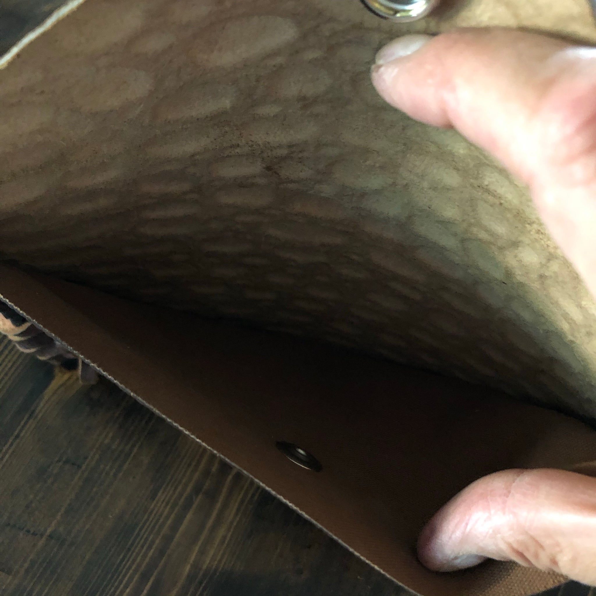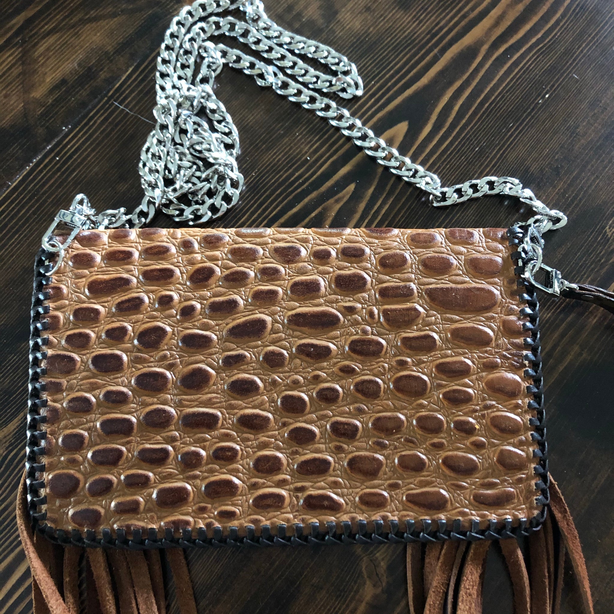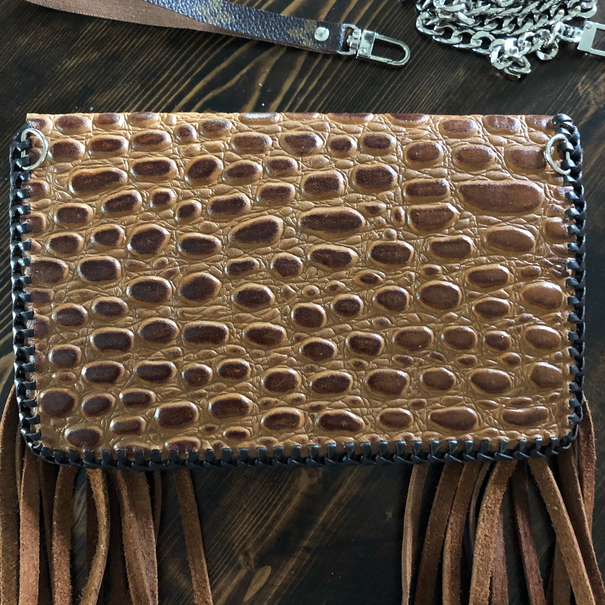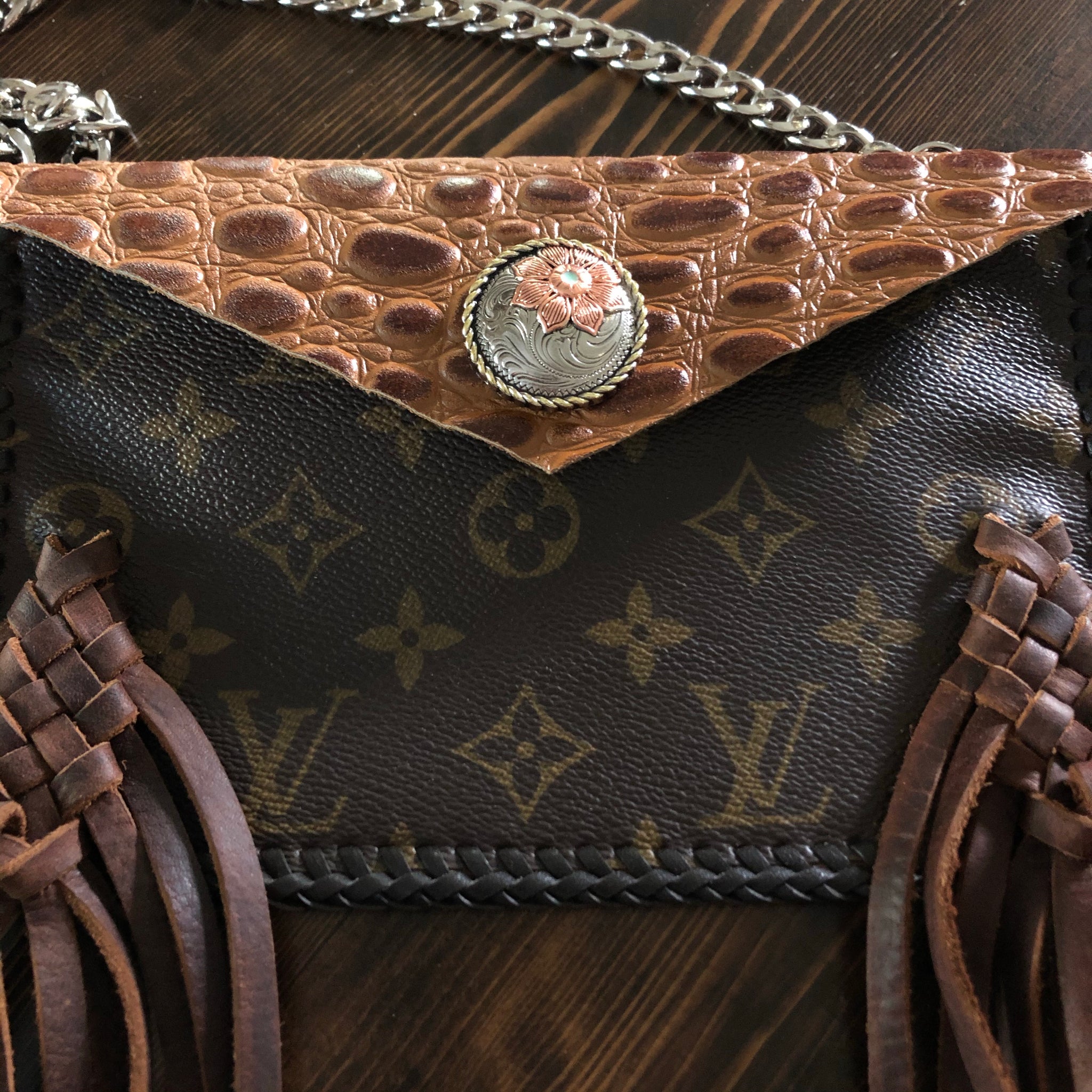 As always, an authentic Louis Vuitton bag was used to create this beautiful little bag. I enhanced the front by adding braided fringe in two different colors to give it some dimension. The back/front flap is a gorgeous Cognac colored gator-embossed leather! It is STUNNING!!! The outside edge has been stitched by hand with brown leather lace. There are two silver D-rings stitched into the sides that will hold the silver crossbody chain (47"), or the click-n-go wristlet. The wristlet is the star LV print and has a small silver LV-like clasp at the end. Perfect for your keys OR your wrist!! Or, take both off and turn this into a beautiful clutch! A silver/copper vintage looking concho snap completes this look.