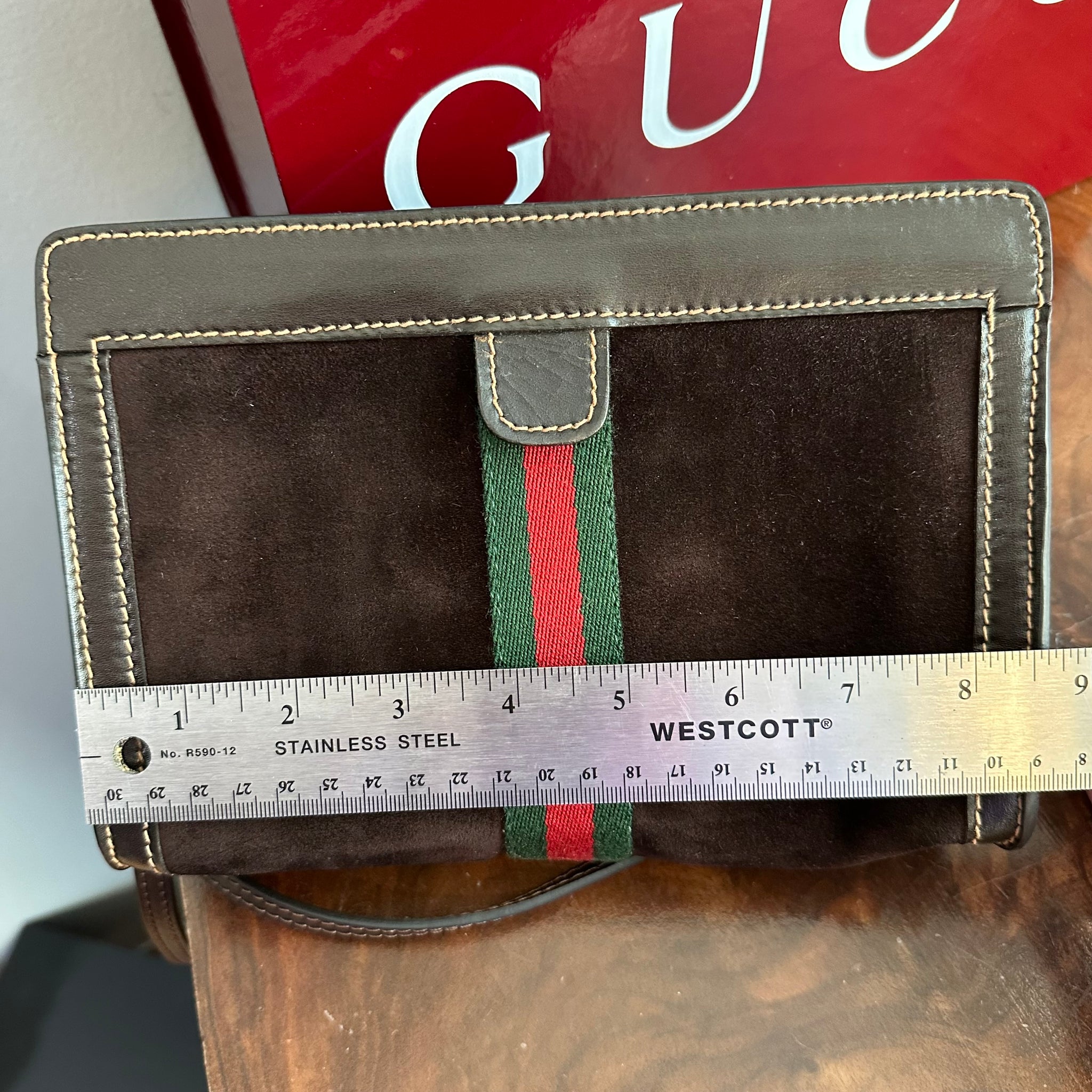 This Junco in a chocolate brown suede Gucci with the fun red/green stripe will be your favorite bag this season. This crossbody bag was created from the authentic GUCCI Parfum Accessory Collection! It's got enough room for just the right amount of things, coming in at W8.5 x H6 x D3 inches. She'll fit all sorts of phones!!!