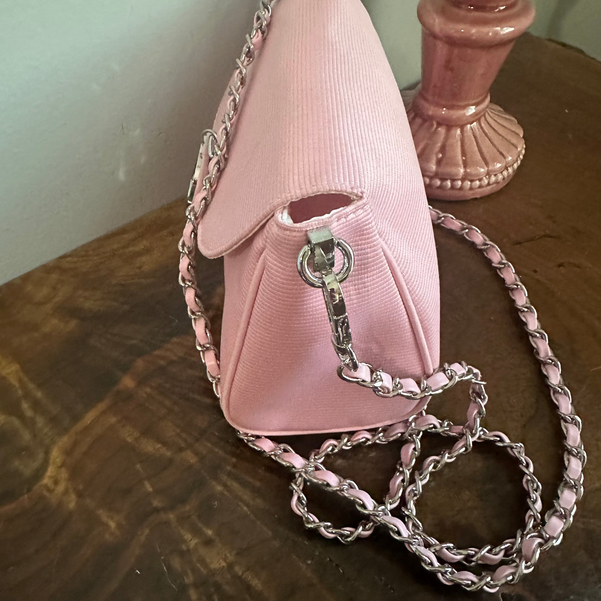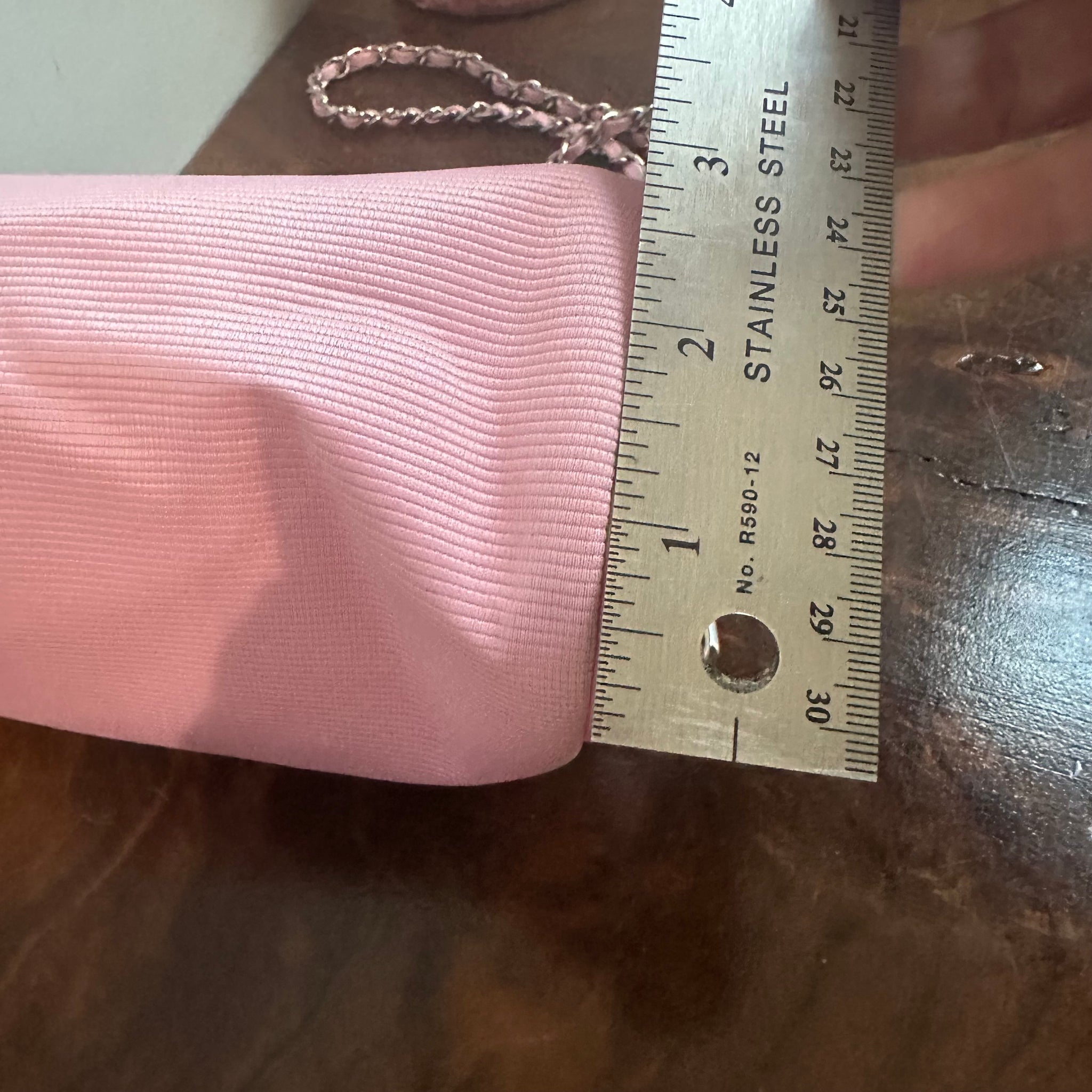 This bag is about 7.5" wide at the bottom and 4.5" tall. It's almost 3" wide at the bottom and then tapers in to about 2". I've added silver D-rings to the sides and matched a pink and silver chain strap to it that is 48" long ... perfect for wearing crossbody.