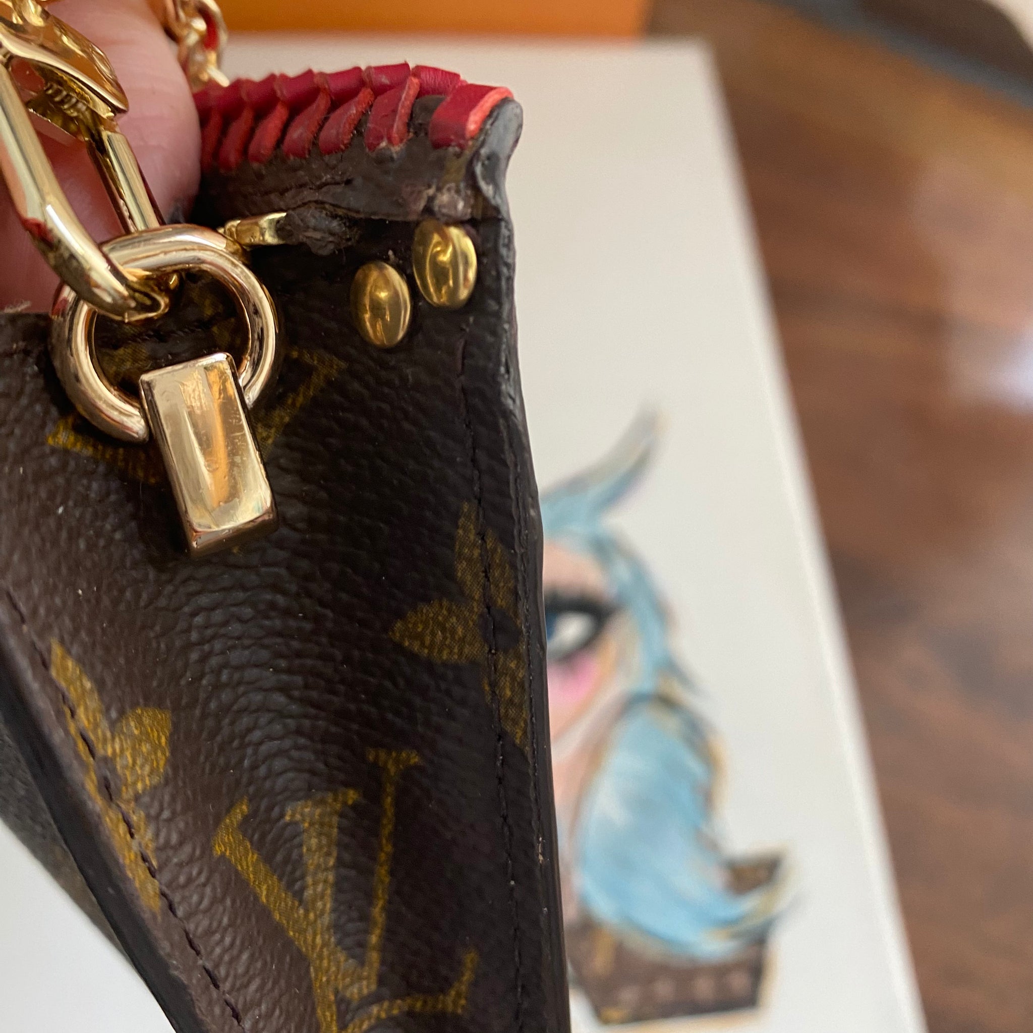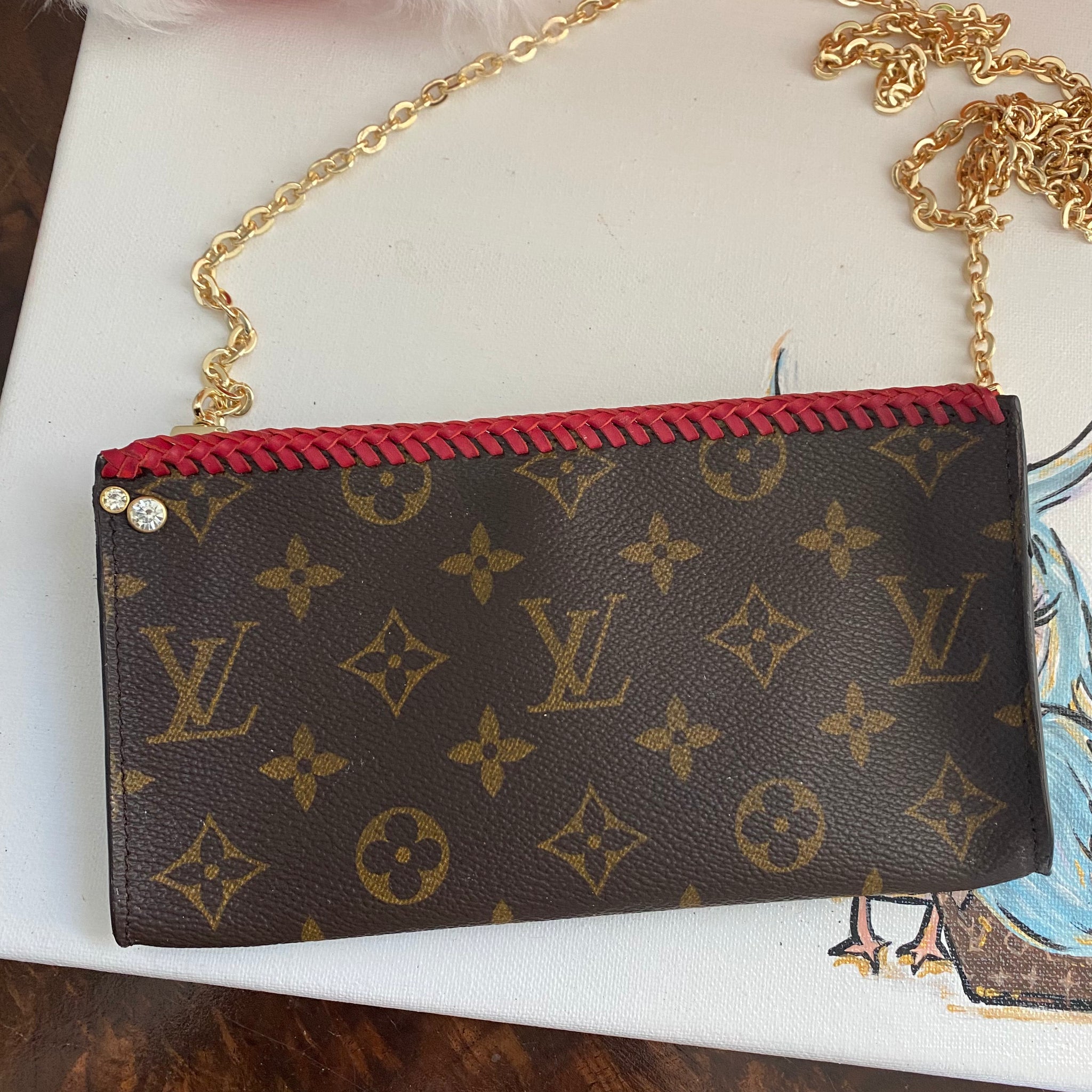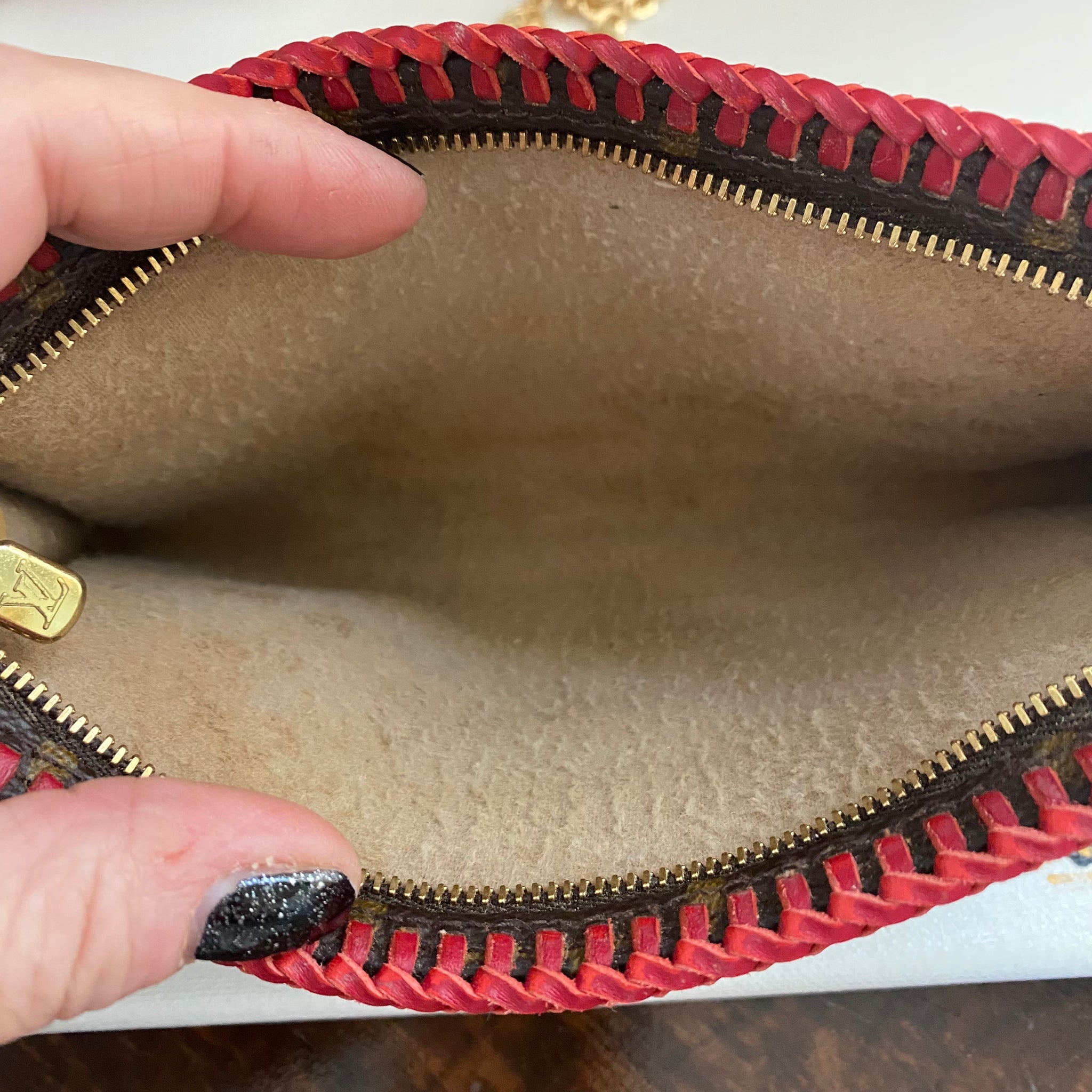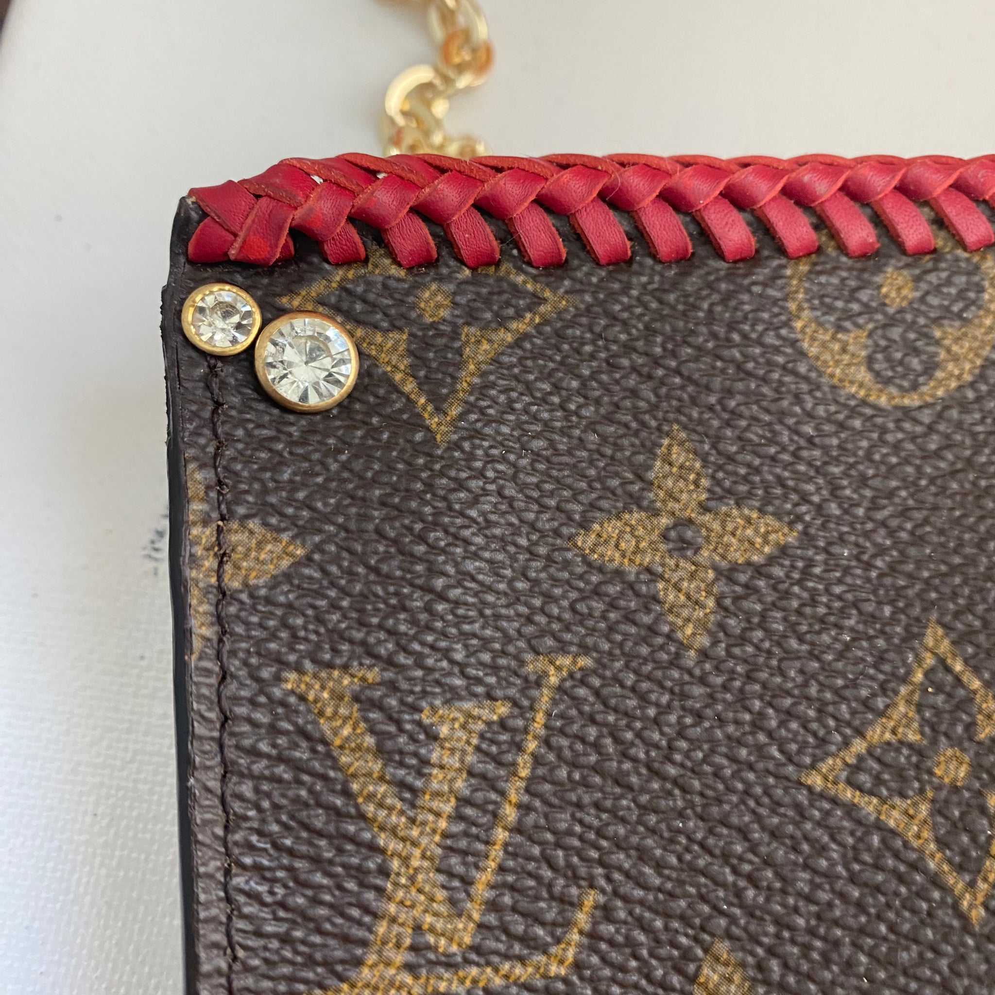 This bag's Monogram was in great shape so I hand braided a red leather lace on the top edges to give it a "Valentine" flair.  The inside was a VERY sticky Vuittonite, so I had to scrub it all out, leaving a clean flannel-like interior. The leather zipper pull at the end was missing, so I shortened the overall zipper and added a flashy gold end to it.  The front left corner was starting to pull away from the side, so I added some blingy crystals to ensure it stayed intact. And let's face it, they're super cute!  I also re-coated the edges with an edge coat so they look brand new!  I finished by adding some tiny gold D-rings to the sides and a fun chain (47") to make this a cute crossbody.
