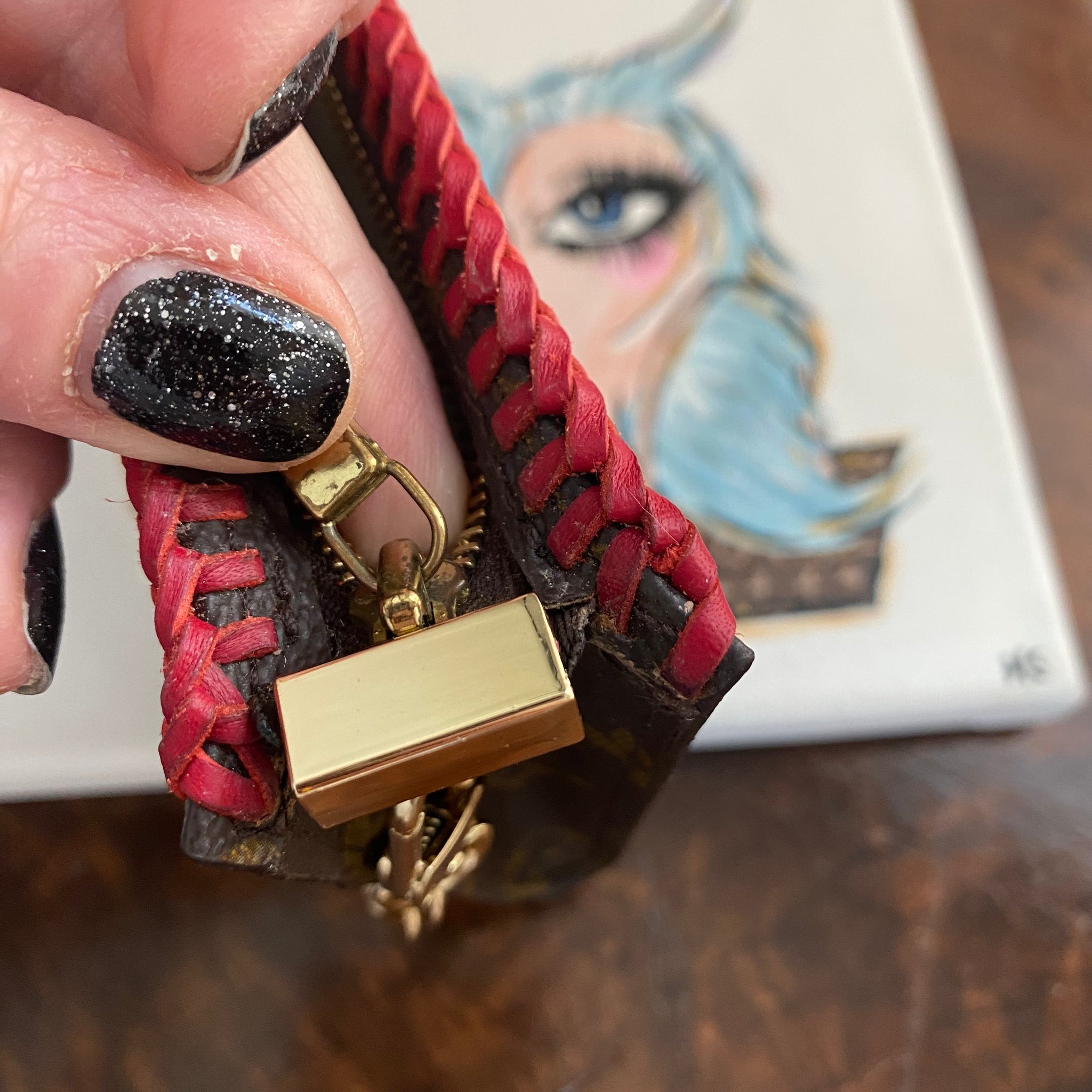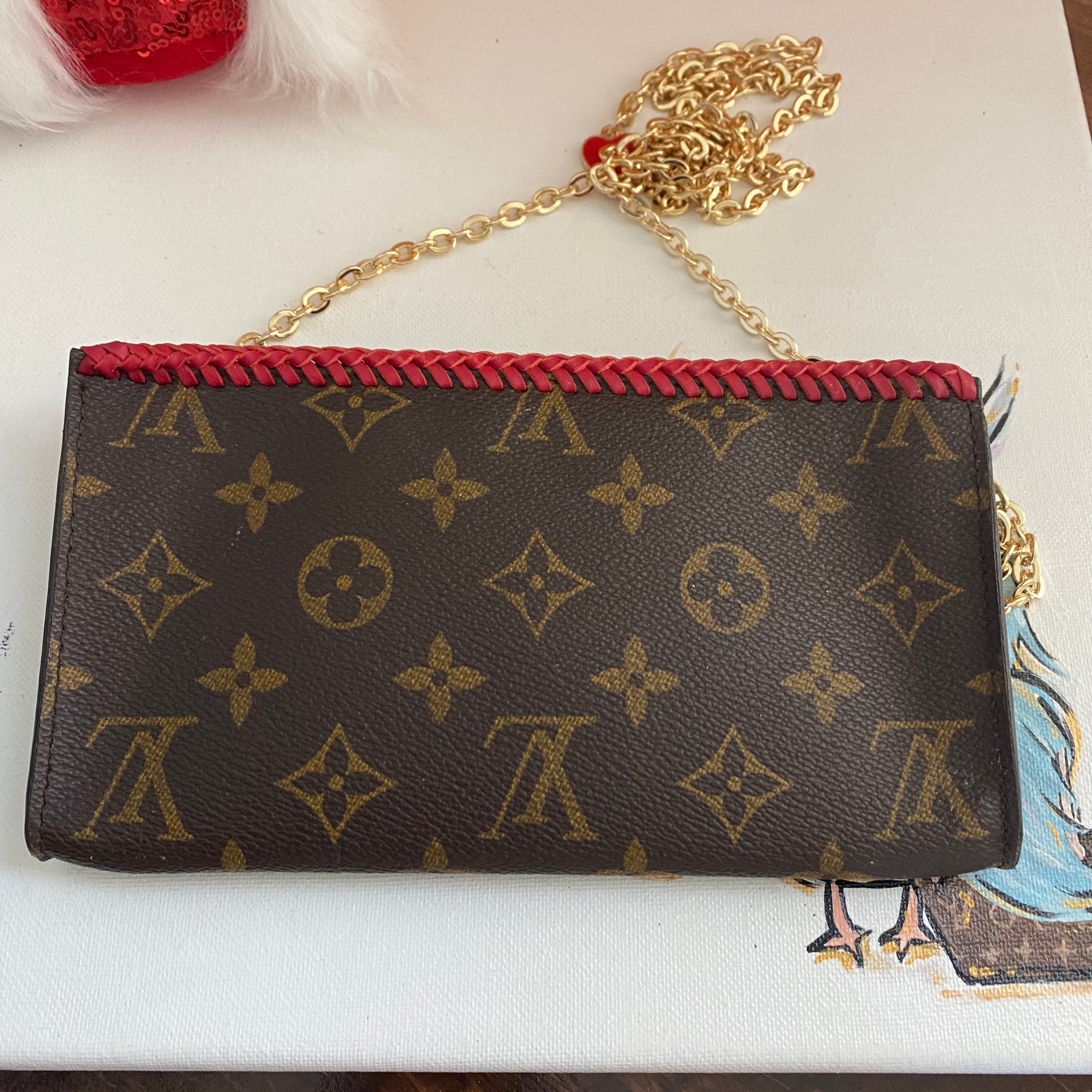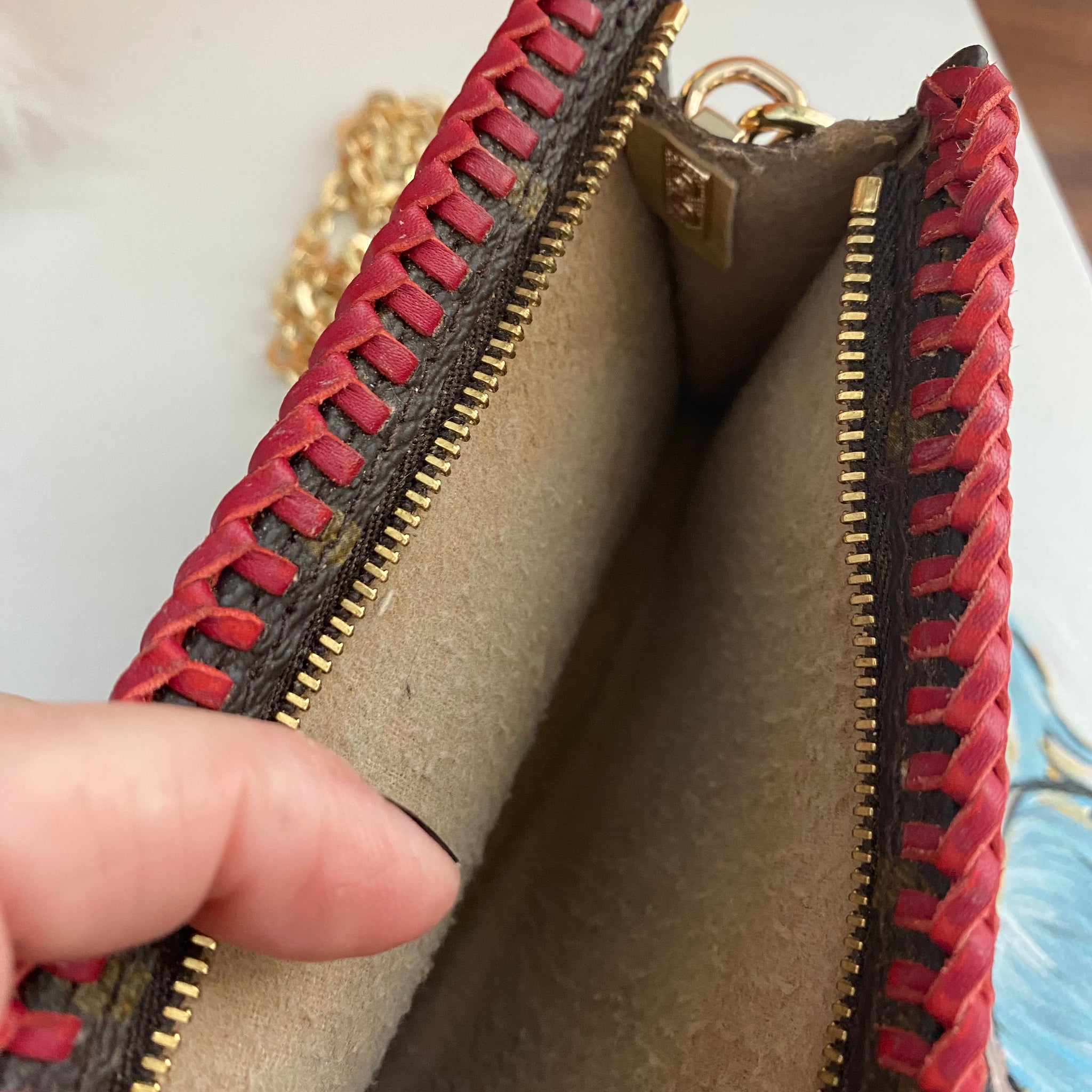 This bag's Monogram was in great shape so I hand braided a red leather lace on the top edges to give it a "Valentine" flair.  The inside was a VERY sticky Vuittonite, so I had to scrub it all out, leaving a clean flannel-like interior. The leather zipper pull at the end was missing, so I shortened the overall zipper and added a flashy gold end to it.  The front left corner was starting to pull away from the side, so I added some blingy crystals to ensure it stayed intact. And let's face it, they're super cute!  I also re-coated the edges with an edge coat so they look brand new!  I finished by adding some tiny gold D-rings to the sides and a fun chain (47") to make this a cute crossbody.