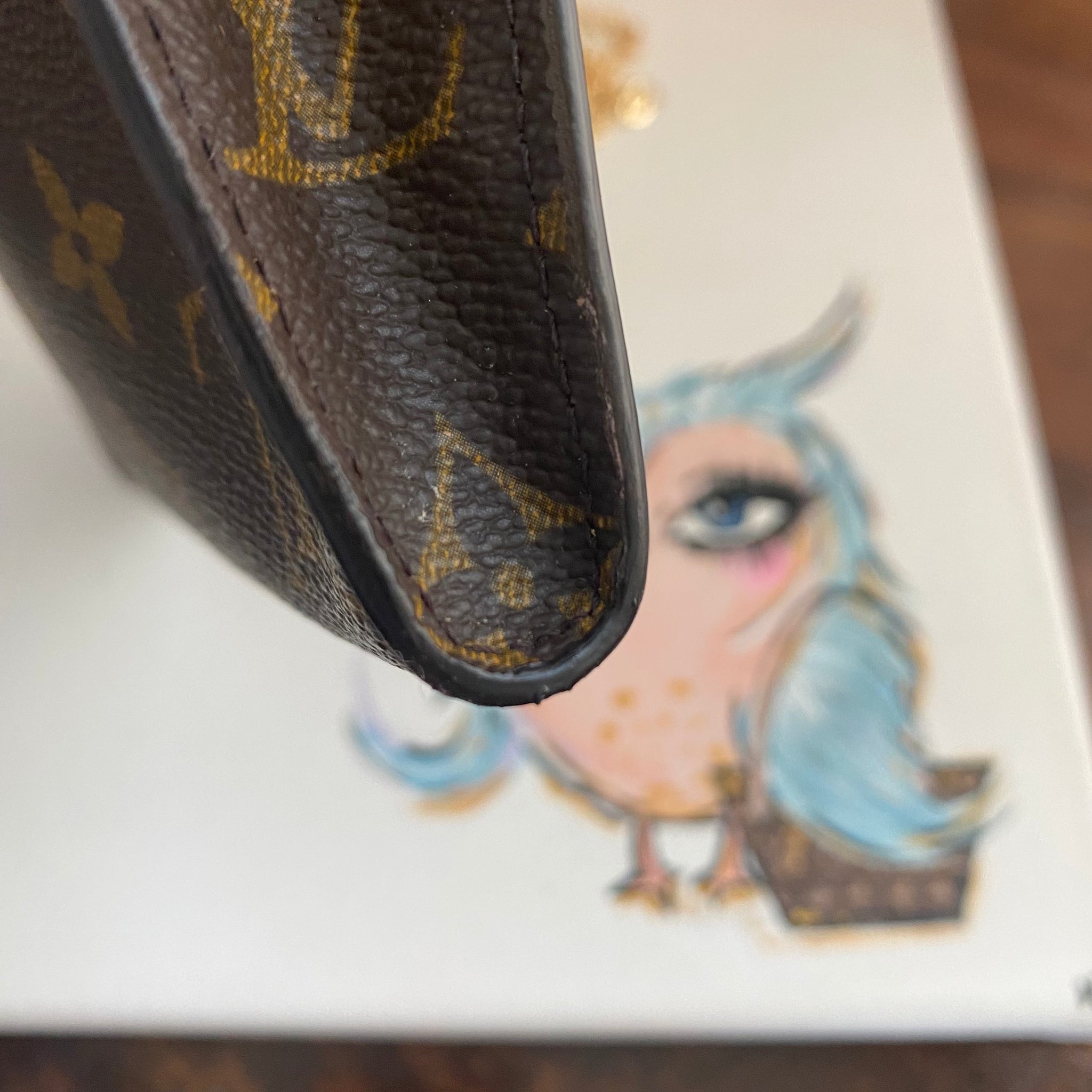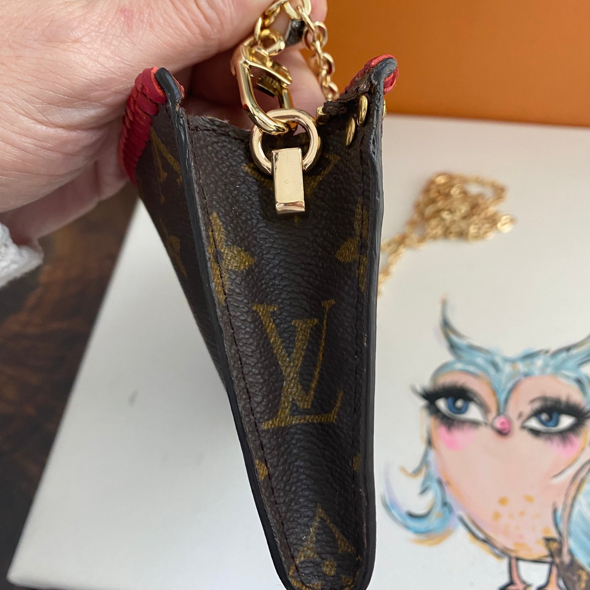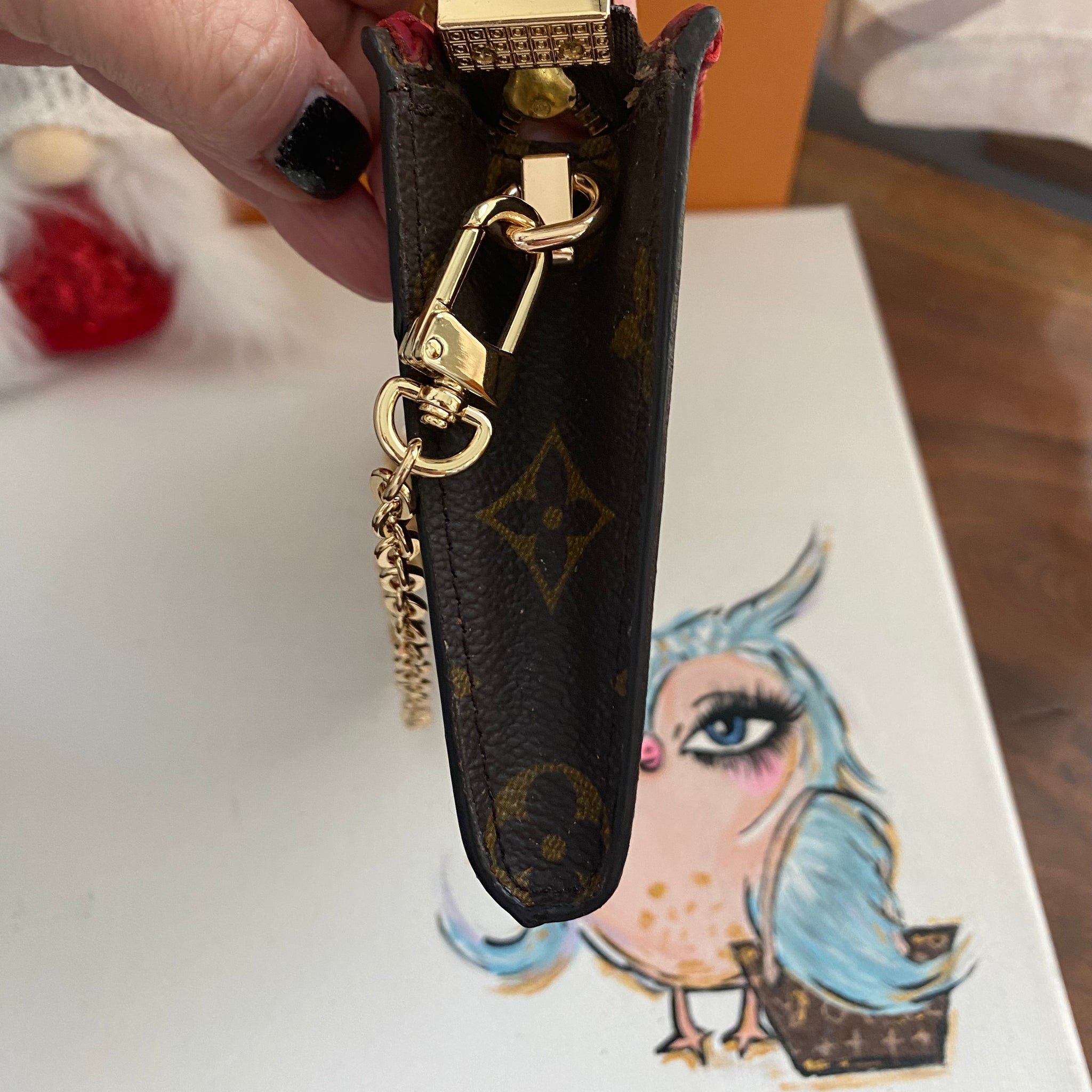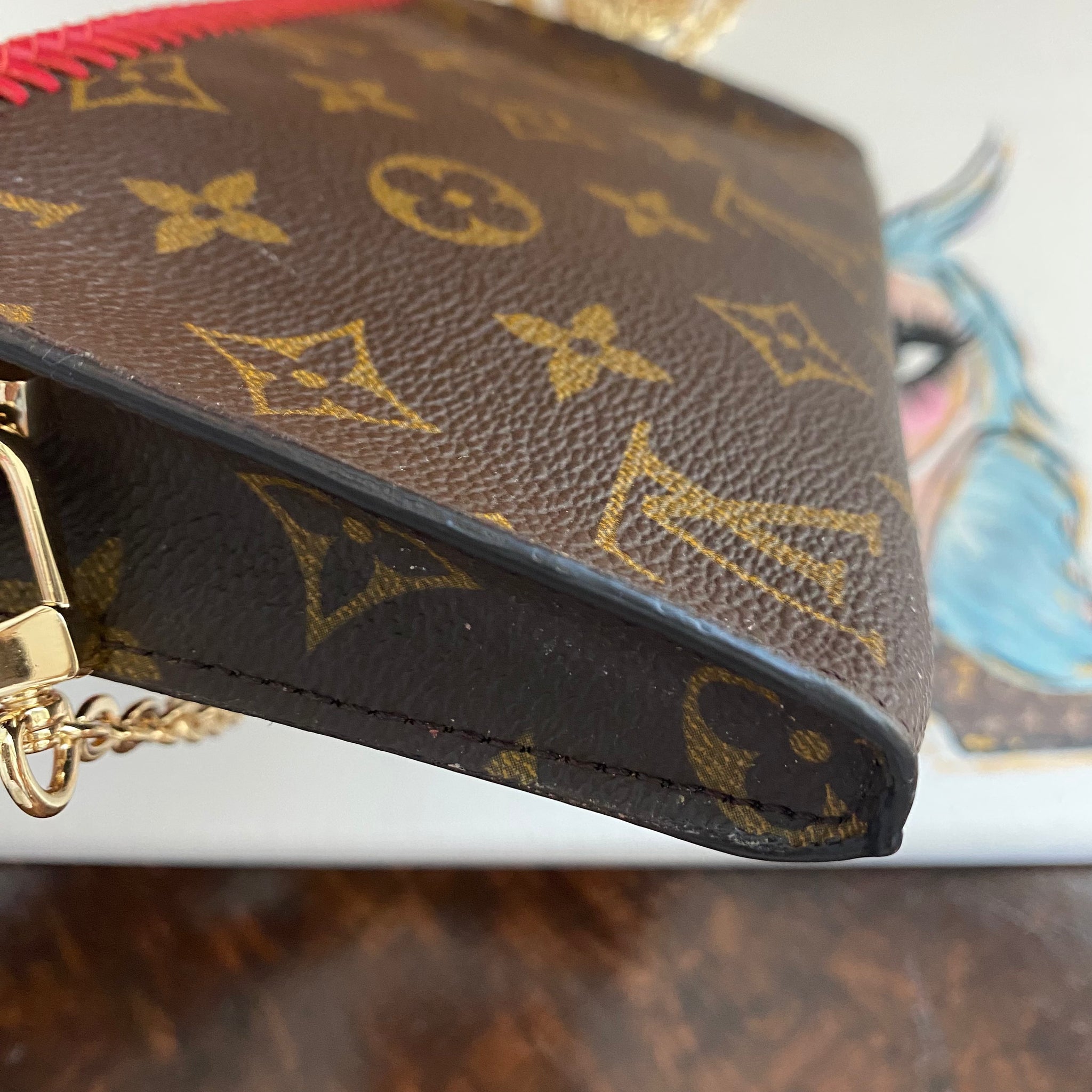 This bag's Monogram was in great shape so I hand braided a red leather lace on the top edges to give it a "Valentine" flair.  The inside was a VERY sticky Vuittonite, so I had to scrub it all out, leaving a clean flannel-like interior. The leather zipper pull at the end was missing, so I shortened the overall zipper and added a flashy gold end to it.  The front left corner was starting to pull away from the side, so I added some blingy crystals to ensure it stayed intact. And let's face it, they're super cute!  I also re-coated the edges with an edge coat so they look brand new!  I finished by adding some tiny gold D-rings to the sides and a fun chain (47") to make this a cute crossbody.