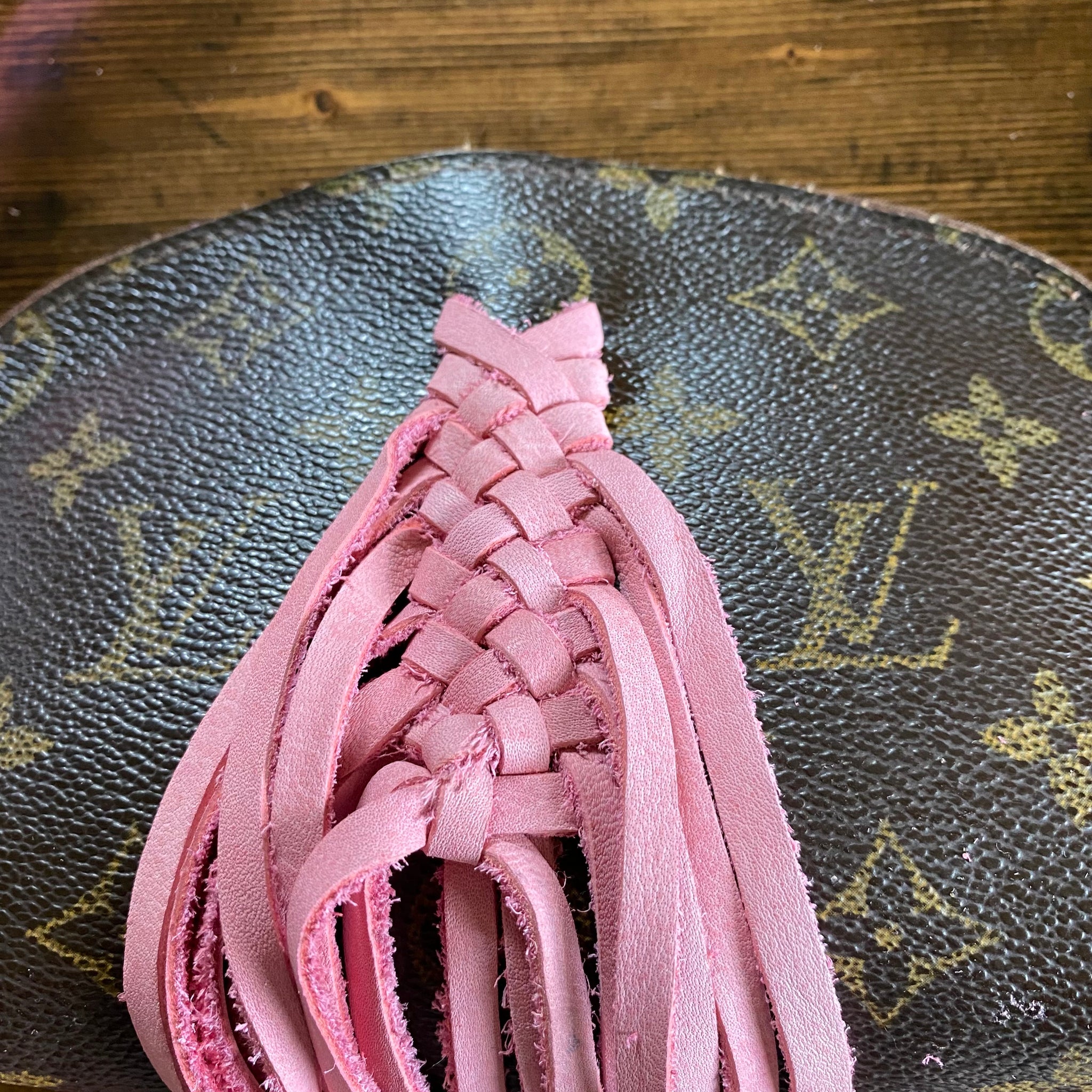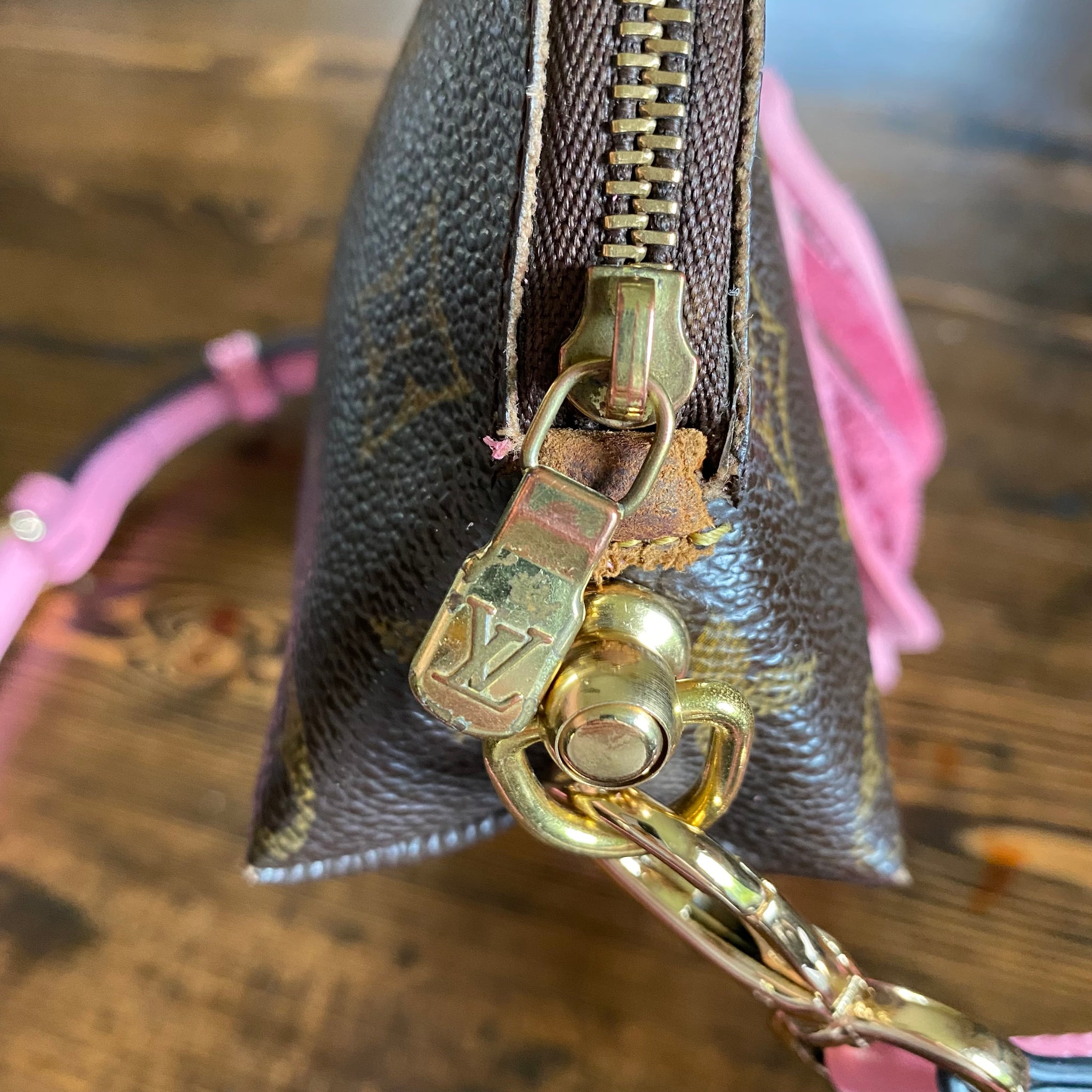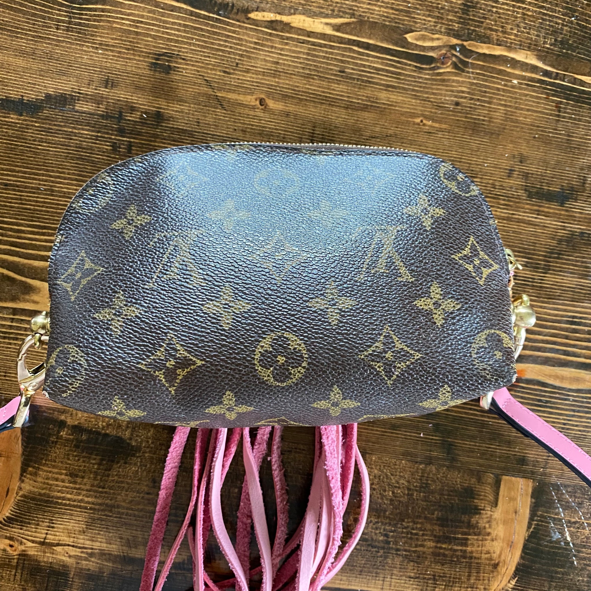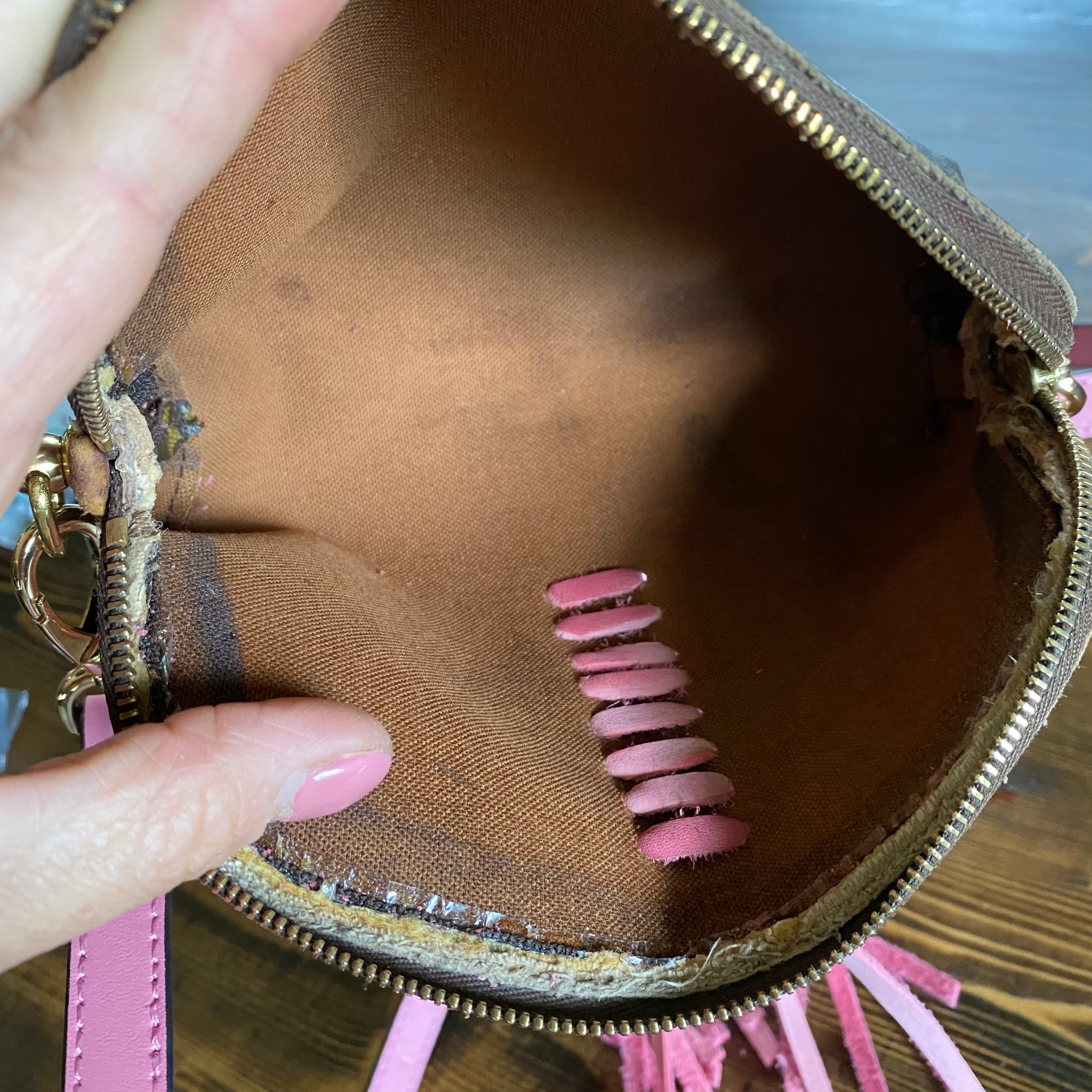 The Vuittonite (see below) inside was in rough shape, so I completely removed it, leaving just the bare canvas. The zipper is fully functional. The leather end tabs have been worn off. I added some braided pink fringe to the outside, which makes this truly a one-of-a-kind cutie. I've added brass D-rings to the sides and attached a pink leather adjustable strap (39-49").