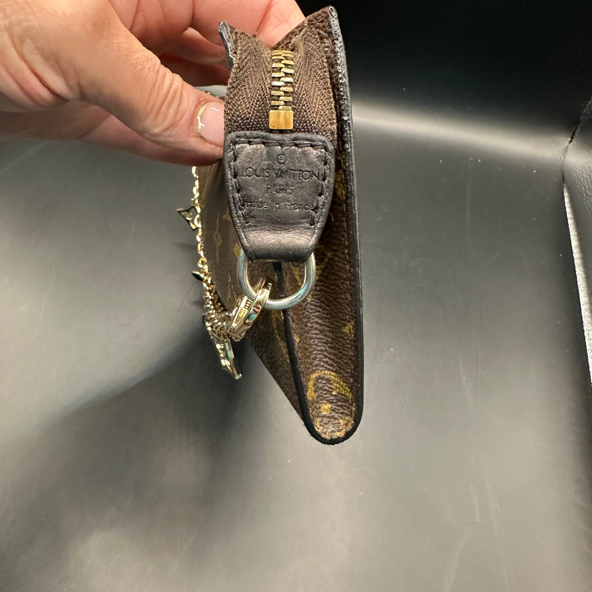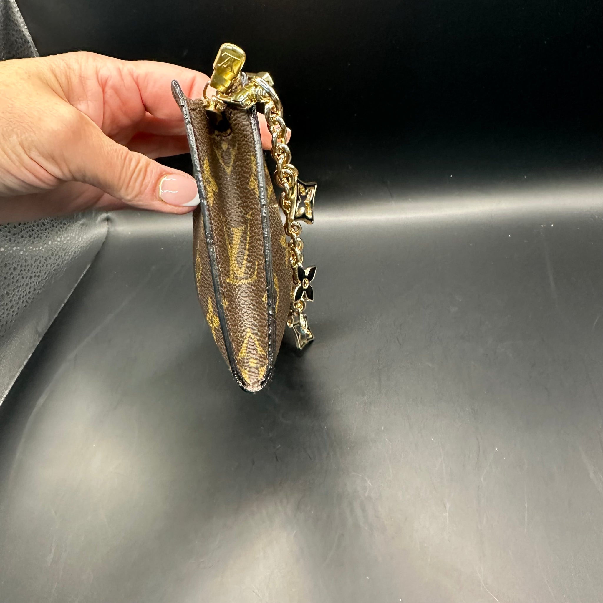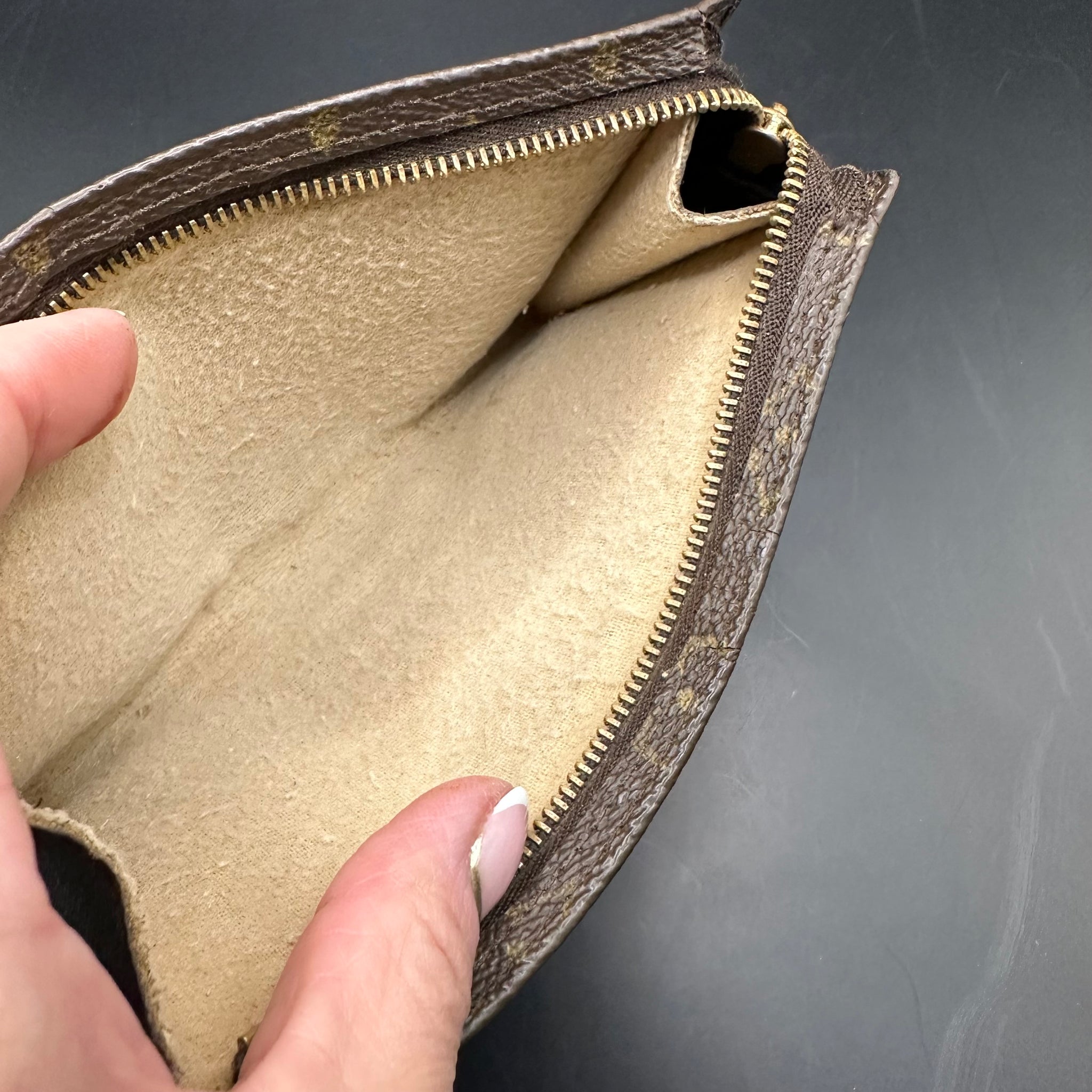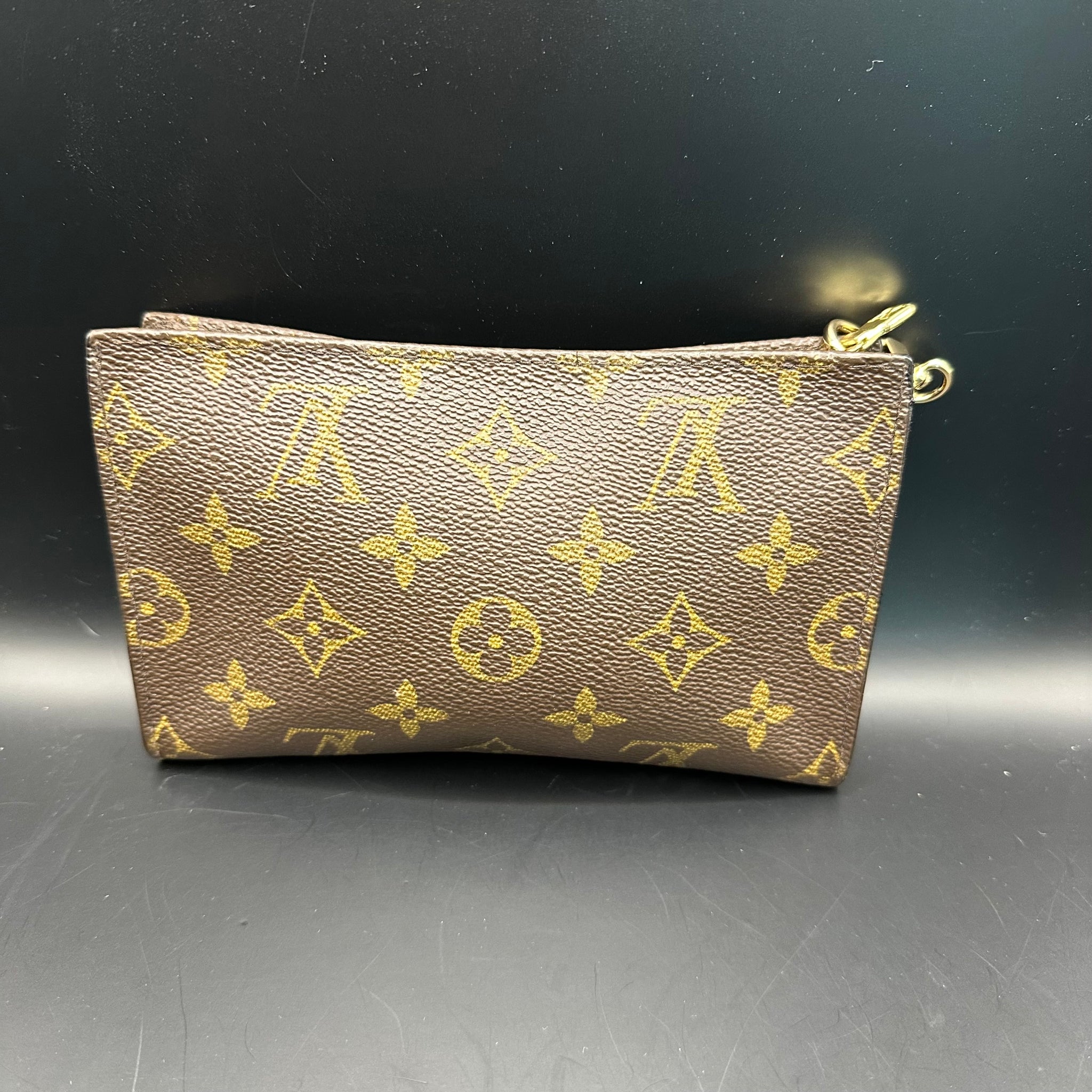 This bag is in really good shape, however, he inside Vuittonite was sticky, so I've scrubbed it out, leaving a soft flannel interior. I've dyed the leather pull at the end black so it really stands out. I've also re-edge coated the ends of the bag and added a cute "LV-like" wristlet chain.