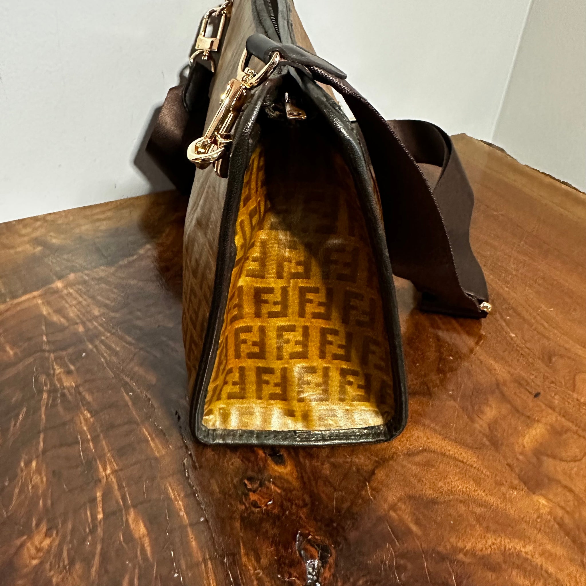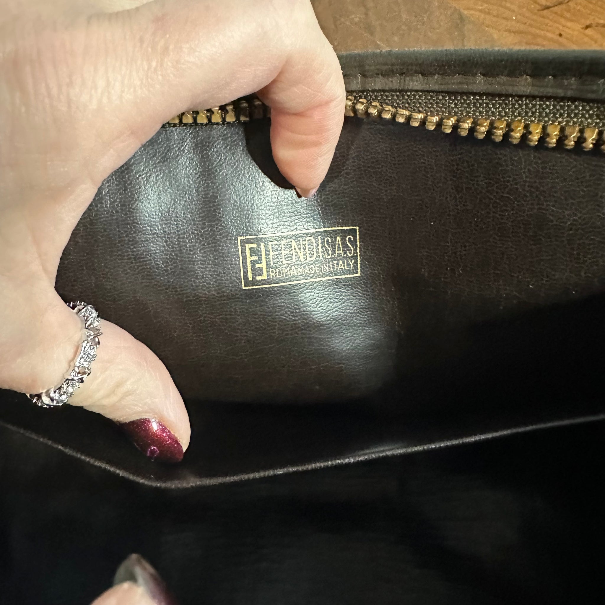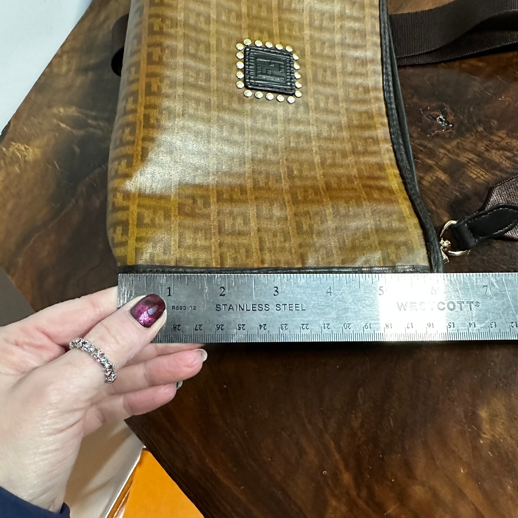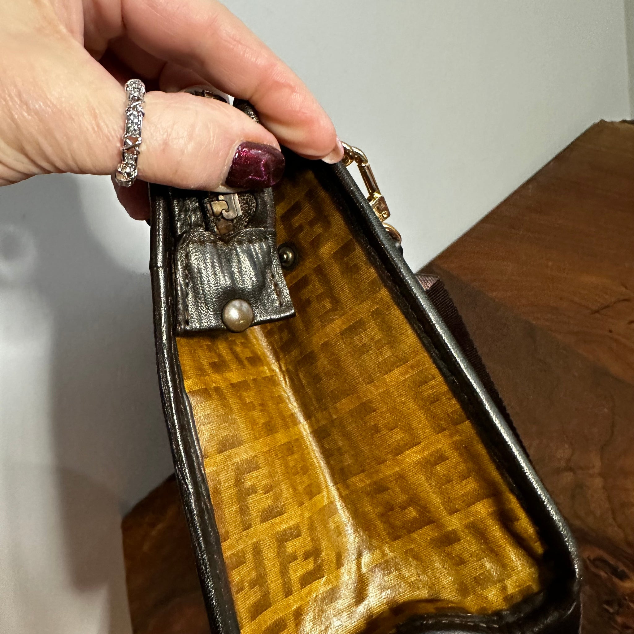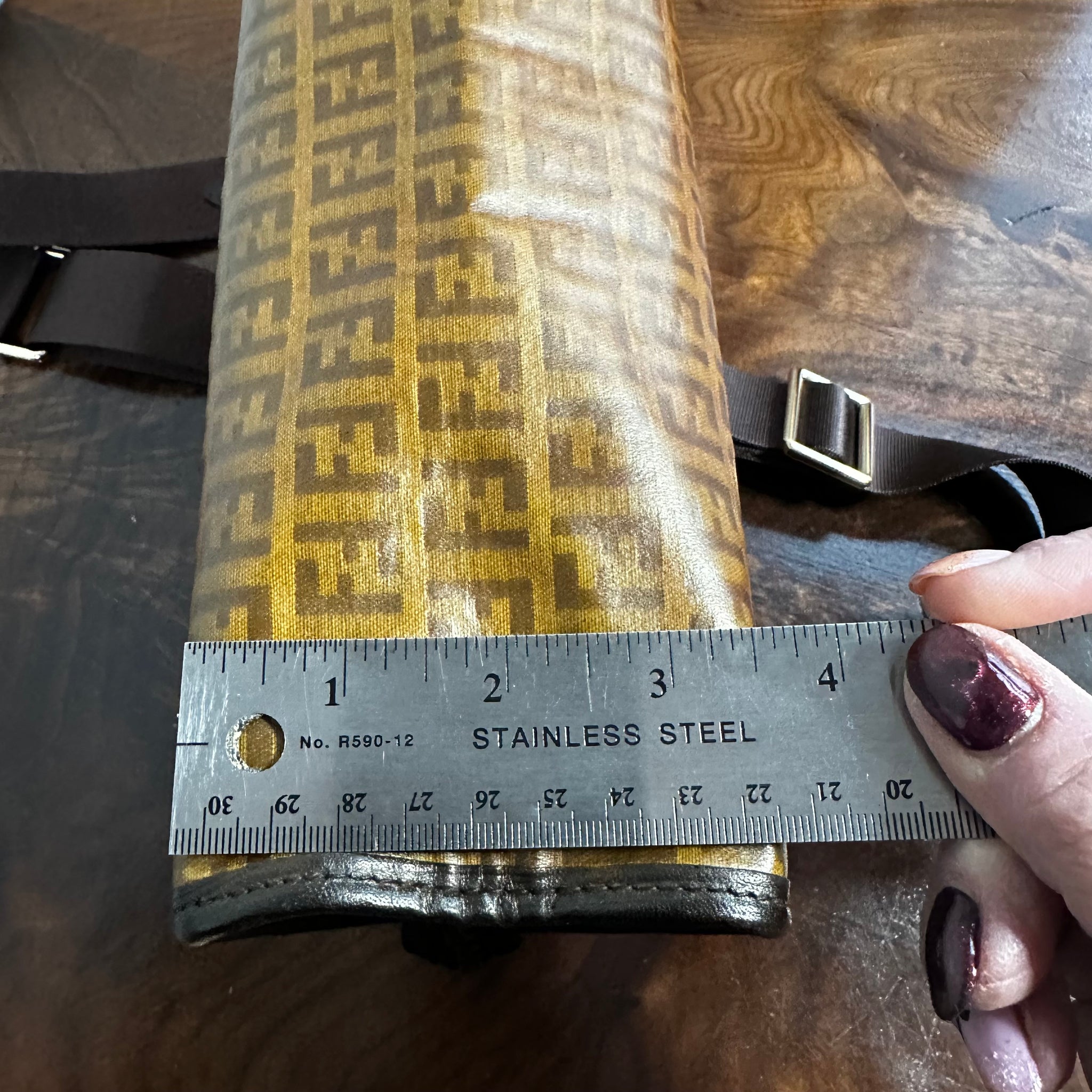 The bag needed to be cleaned up and the leather trim dyed. I cleaned and conditioned the leather trim and then re-dyed it darker so that the FF Monogram would really stand out. I added brass rivets around the leather FF Fendi patch on the front so that it would be highlighted. I also added gold D-rings to the back of the bag which enables it to be carried by the adjustable canvas crossbody strap (30-52"). The top zipper is perfectly functional and its end snaps down to the side of the bag so that it doesn't flap around. The interior was cleaned and looks pristine.