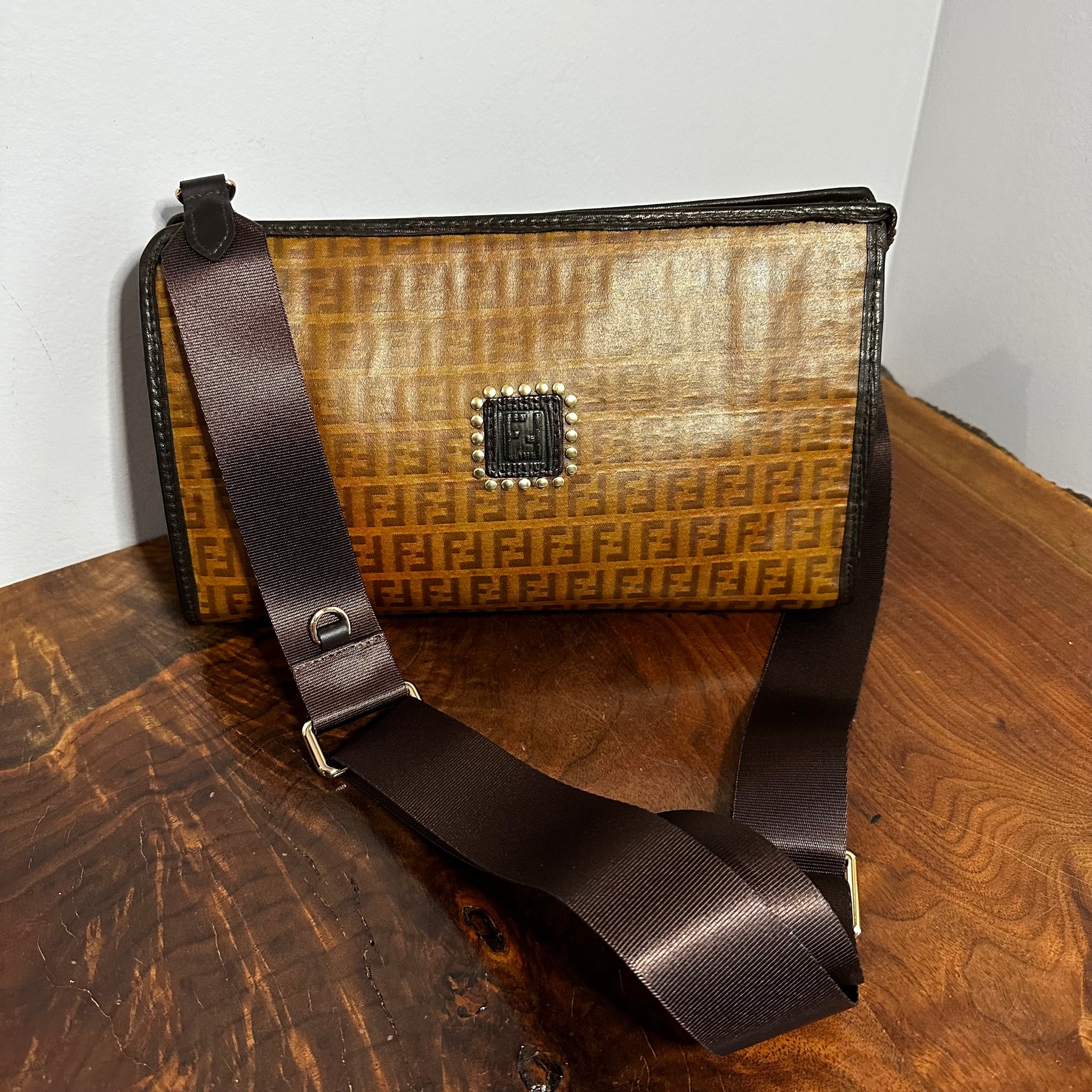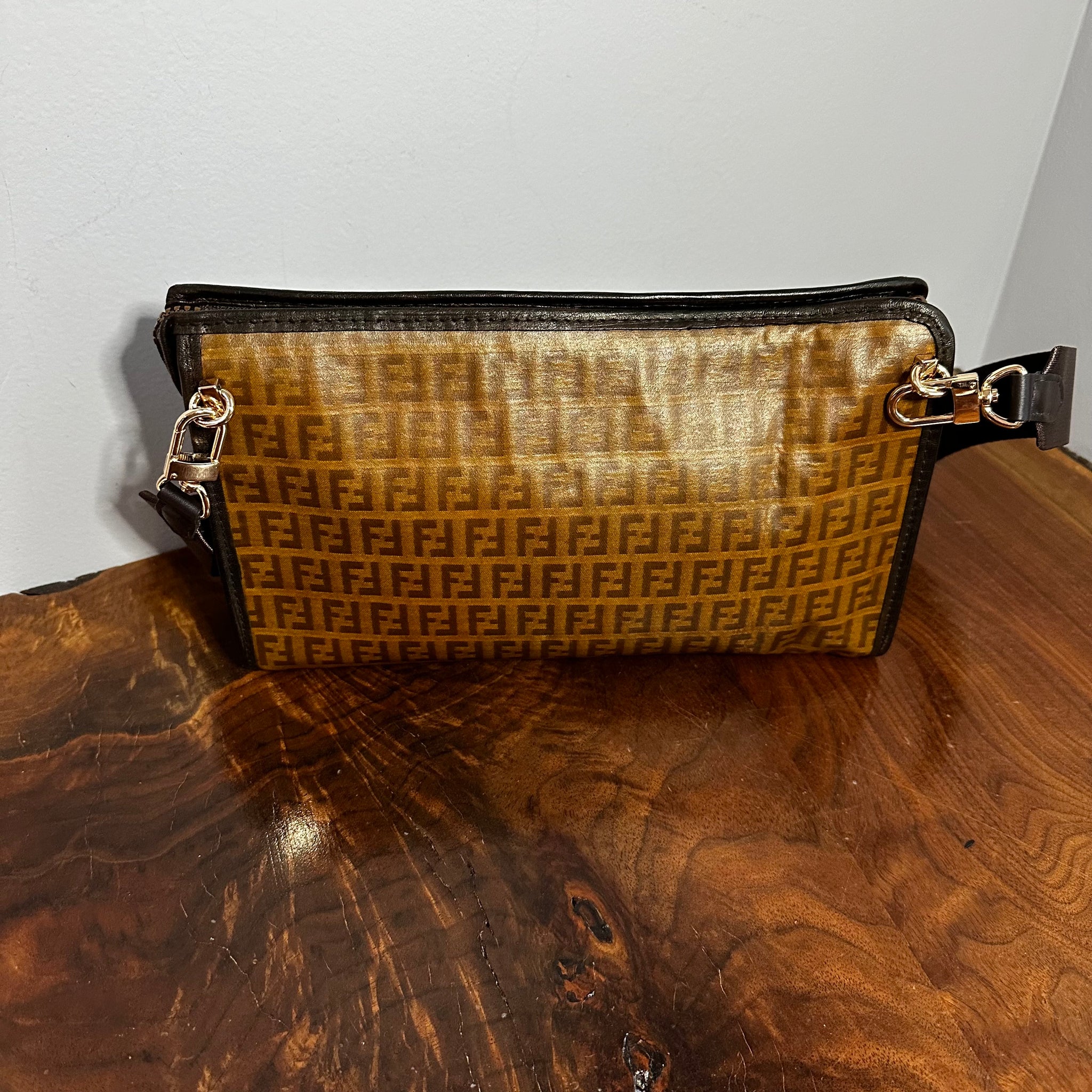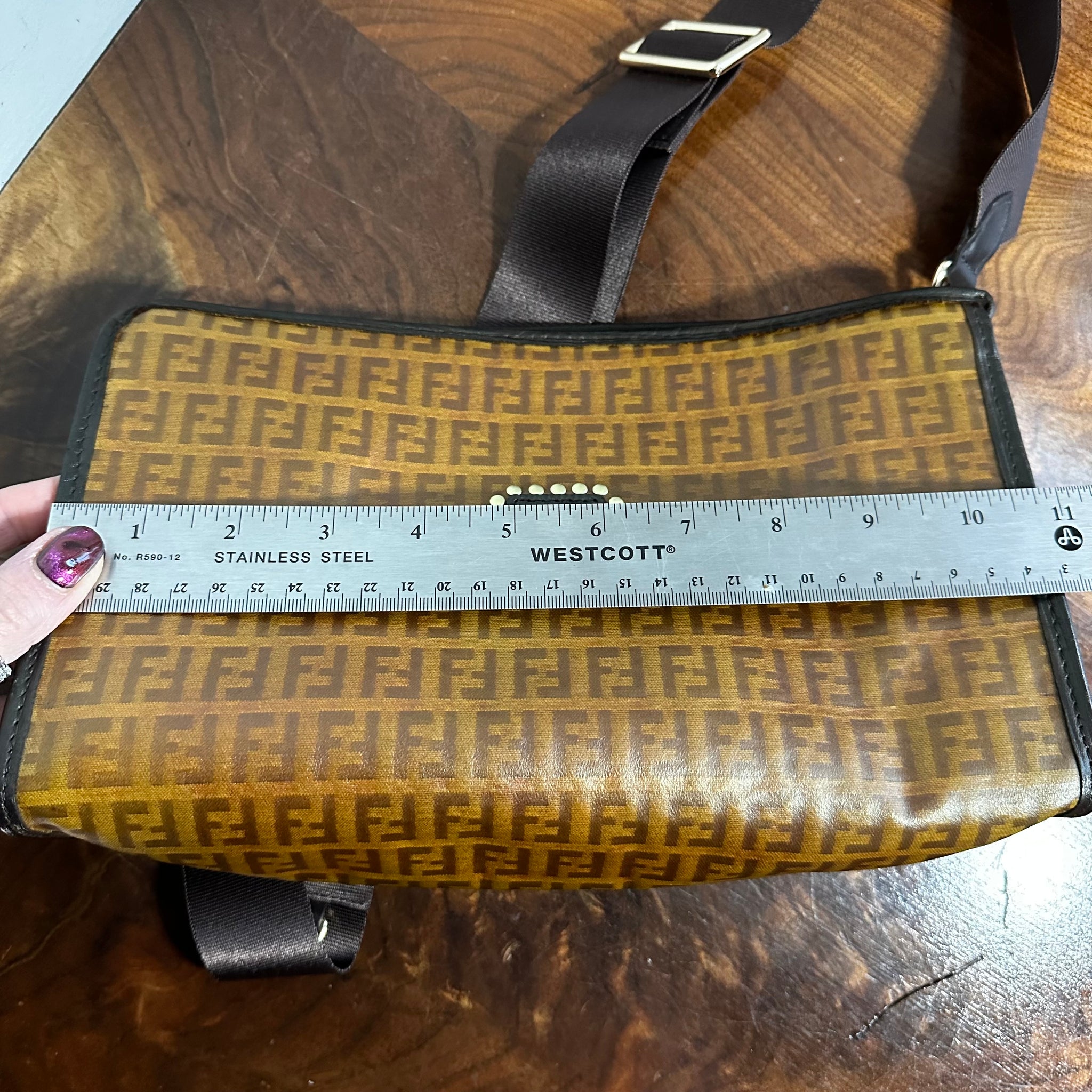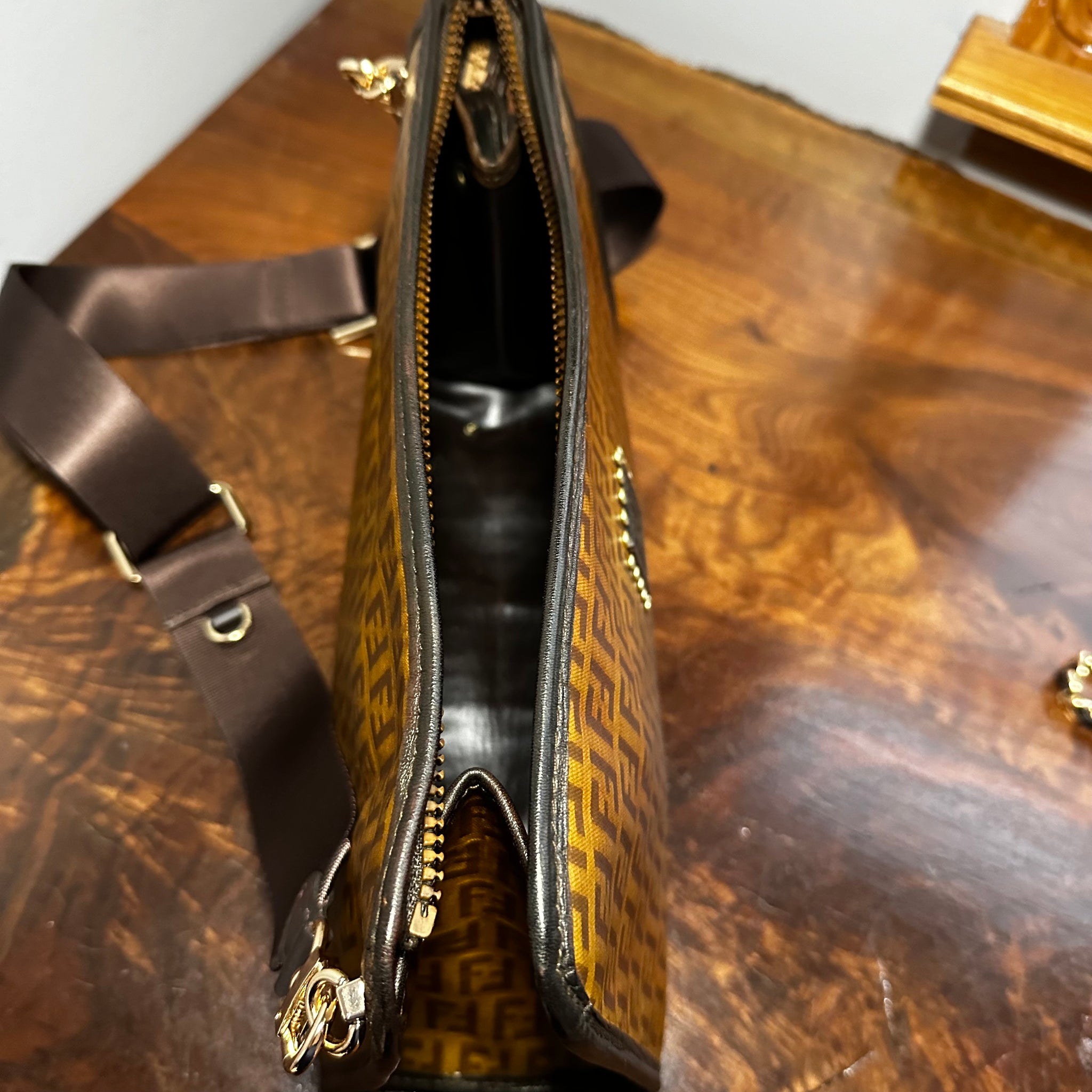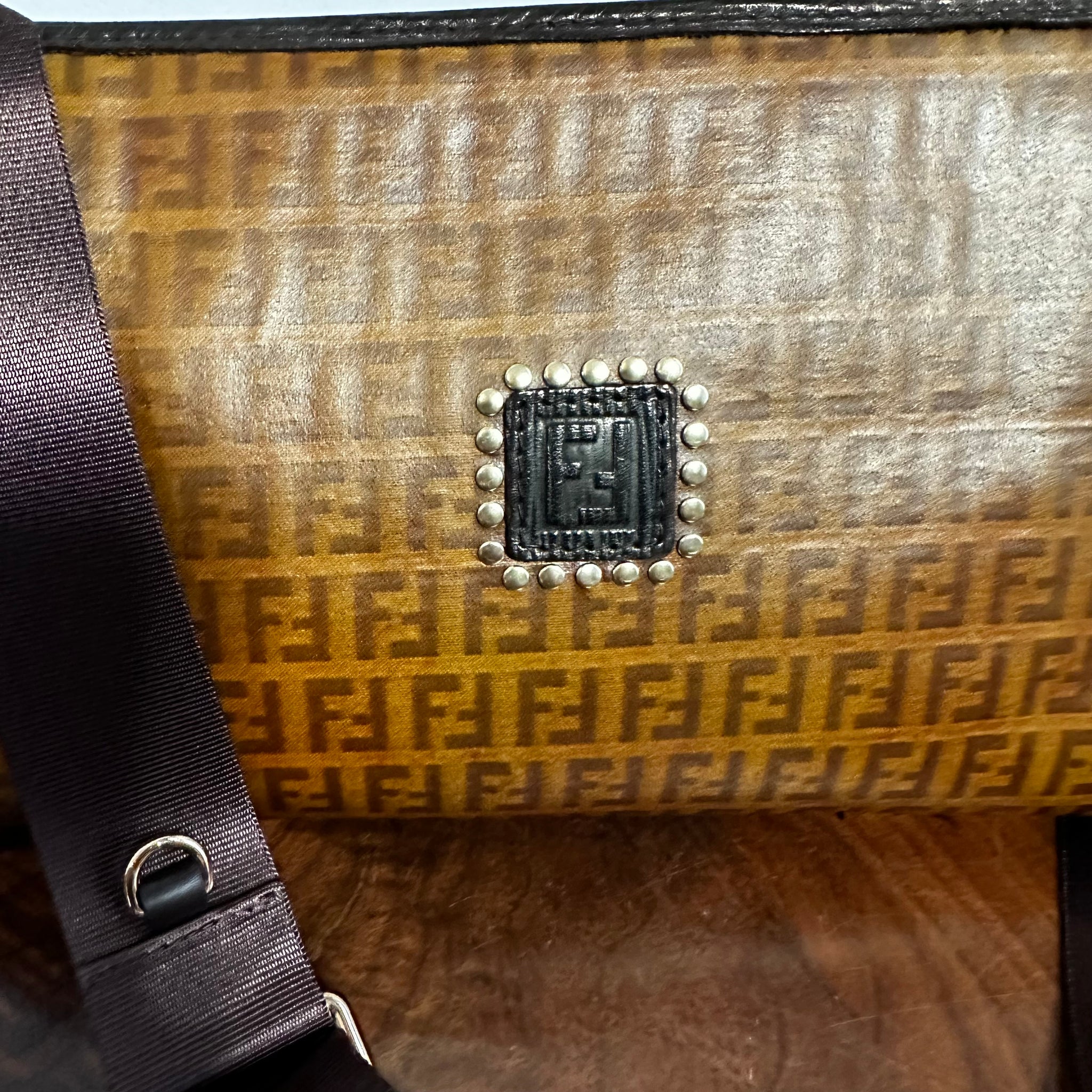 The bag needed to be cleaned up and the leather trim dyed. I cleaned and conditioned the leather trim and then re-dyed it darker so that the FF Monogram would really stand out. I added brass rivets around the leather FF Fendi patch on the front so that it would be highlighted. I also added gold D-rings to the back of the bag which enables it to be carried by the adjustable canvas crossbody strap (30-52"). The top zipper is perfectly functional and its end snaps down to the side of the bag so that it doesn't flap around. The interior was cleaned and looks pristine.