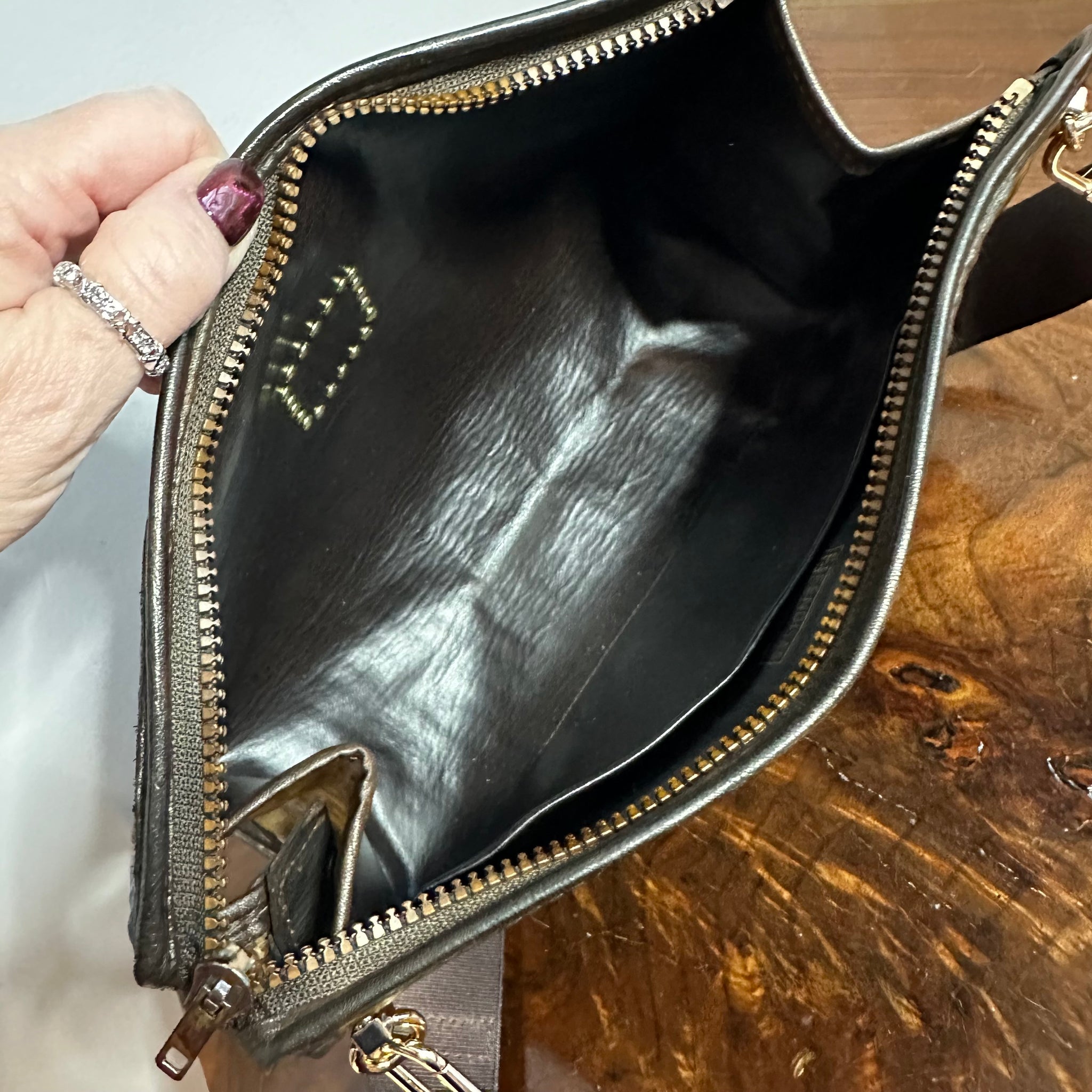 This Swan started out as a vintage Fendi Zucchino Clutch with not much character. I've added a strap to it so that it's more functional, and now you have a stunning crossbody bag that is 10.5" wide by 6" tall and about 3.5" deep. This is a great vintage bag you'll be proud to carry!!